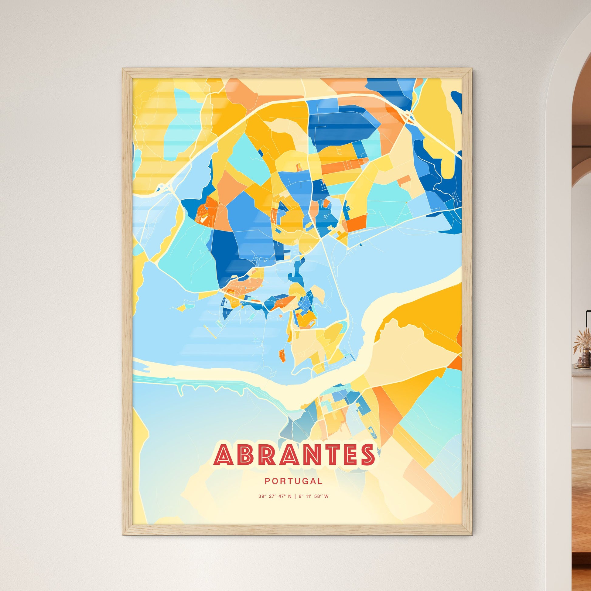 Abrantes city map - with fresh bright orange and blue colors. Our ABRANTES PORTUGAL map has bright streets, railroads and waterways combined with colorful city areas. The city map will be an eye-catcher in any room with its rich detail and colorful freshness.