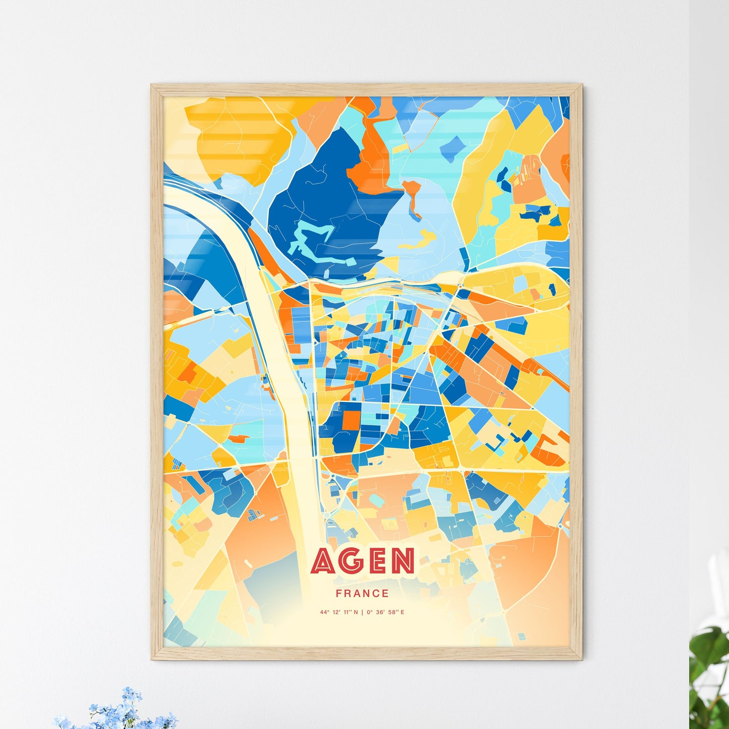 Agen city map - with fresh bright orange and blue colors. Our AGEN FRANCE map has bright streets, railroads and waterways combined with colorful city areas. The city map will be an eye-catcher in any room with its rich detail and colorful freshness.