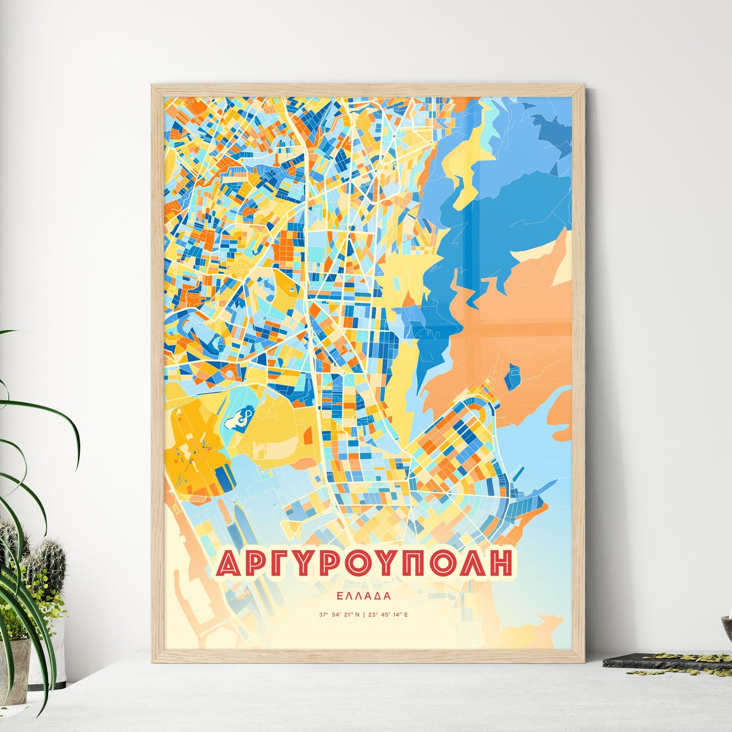 Argyroupoli city map - with fresh bright orange and blue colors. Our ΑΡΓΥΡΟΥΠΟΛΗ ΕΛΛΑΔΑ map has bright streets, railroads and waterways combined with colorful city areas. The city map will be an eye-catcher in any room with its rich detail and colorful freshness.