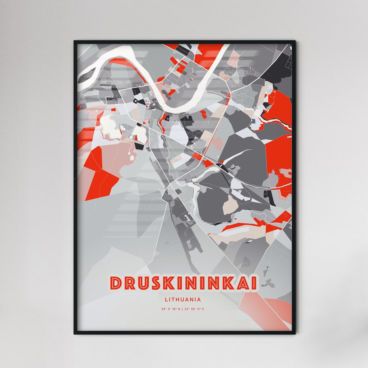 Druskininkai city map - with fresh bright orange and blue colors. Our DRUSKININKAI LITHUANIA map has bright streets, railroads and waterways combined with colorful city areas. The city map will be an eye-catcher in any room with its rich detail and colorful freshness.