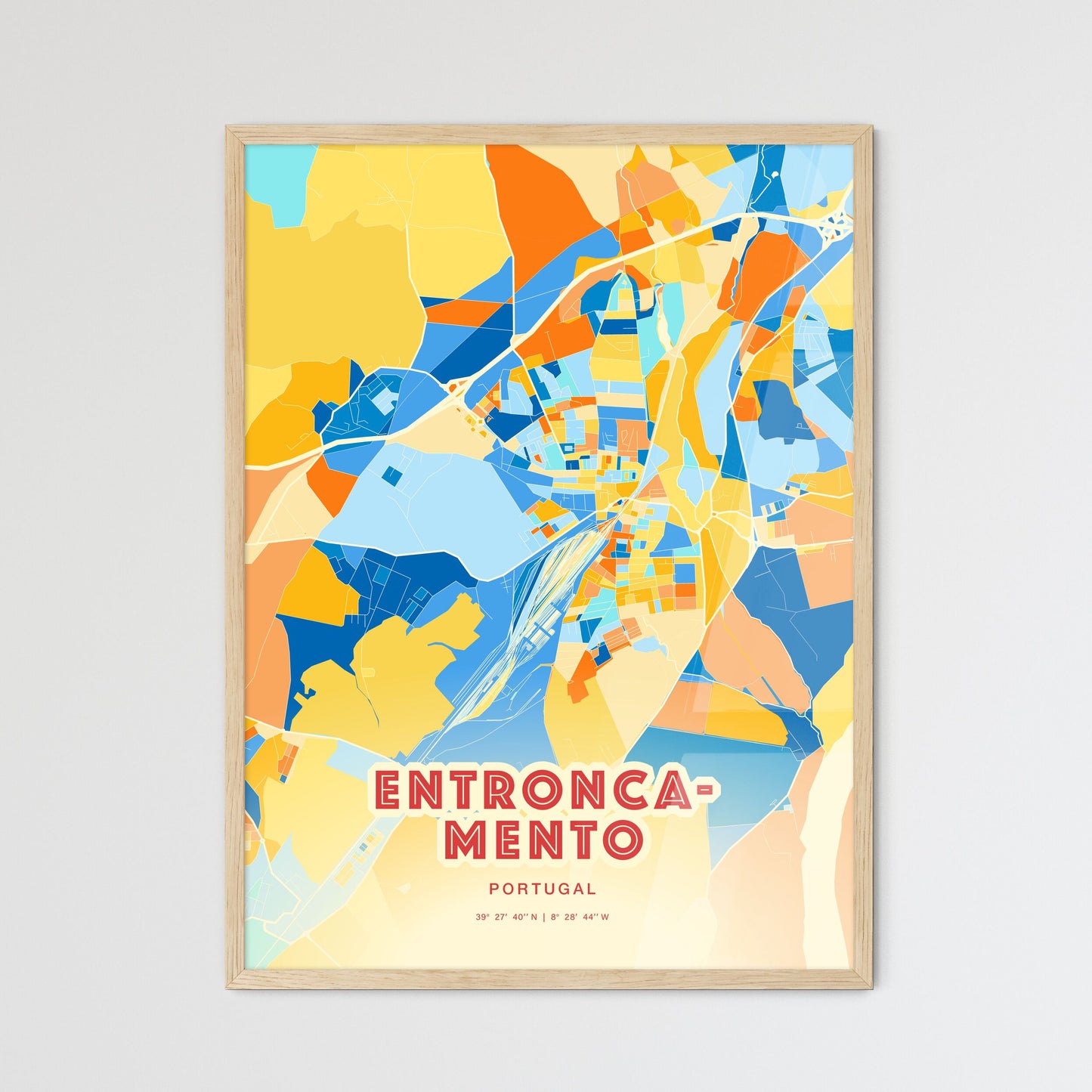 Entroncamento city map - with fresh bright orange and blue colors. Our ENTRONCAMENTO PORTUGAL map has bright streets, railroads and waterways combined with colorful city areas. The city map will be an eye-catcher in any room with its rich detail and colorful freshness.