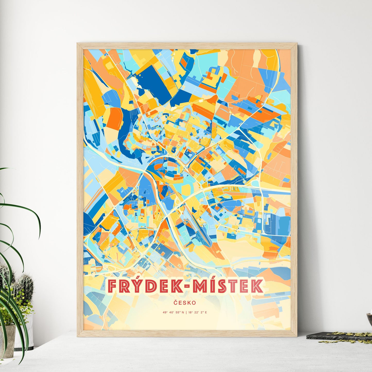 Frýdek-Místek city map - with fresh bright orange and blue colors. Our FRÝDEK-MÍSTEK ČESKO map has bright streets, railroads and waterways combined with colorful city areas. The city map will be an eye-catcher in any room with its rich detail and colorful freshness.