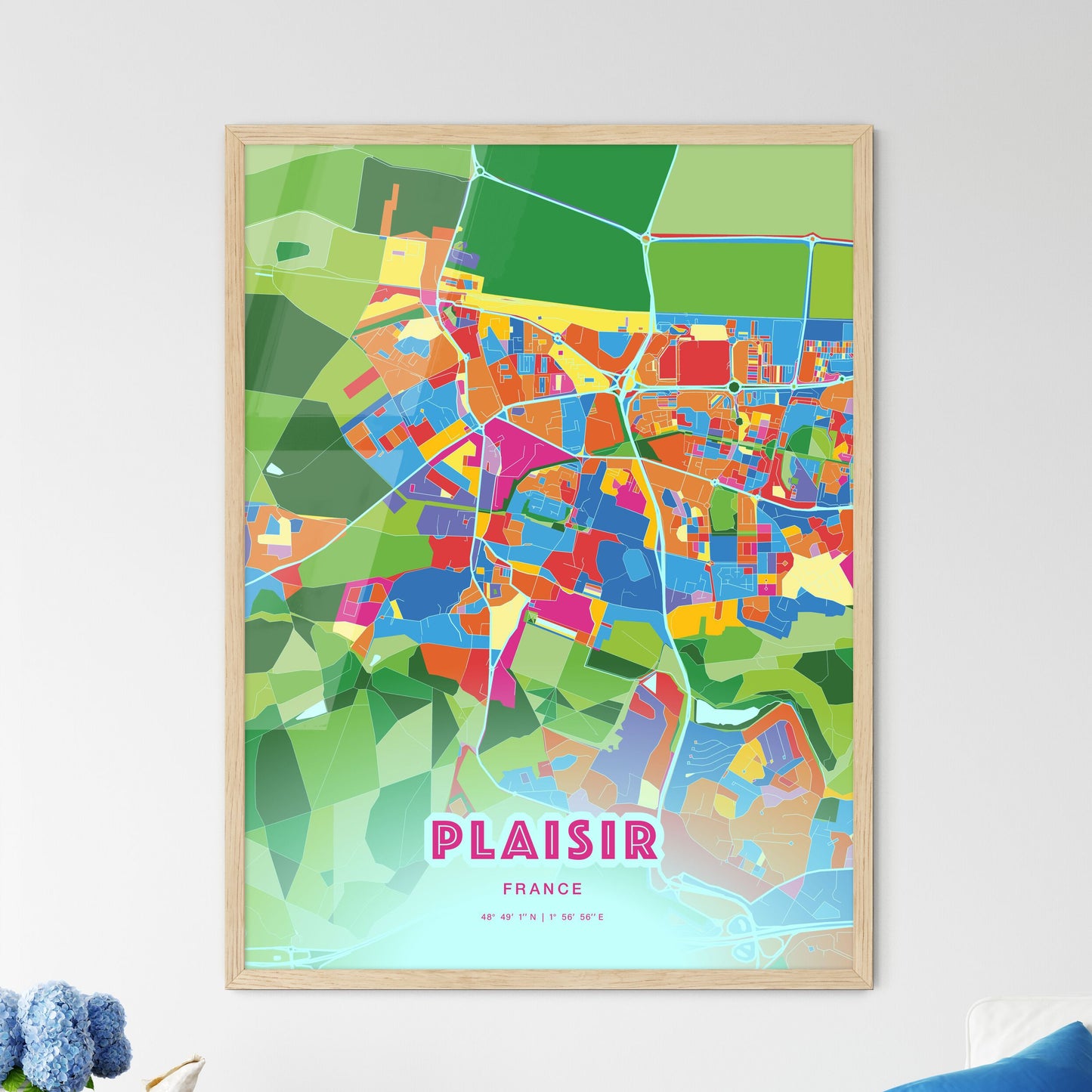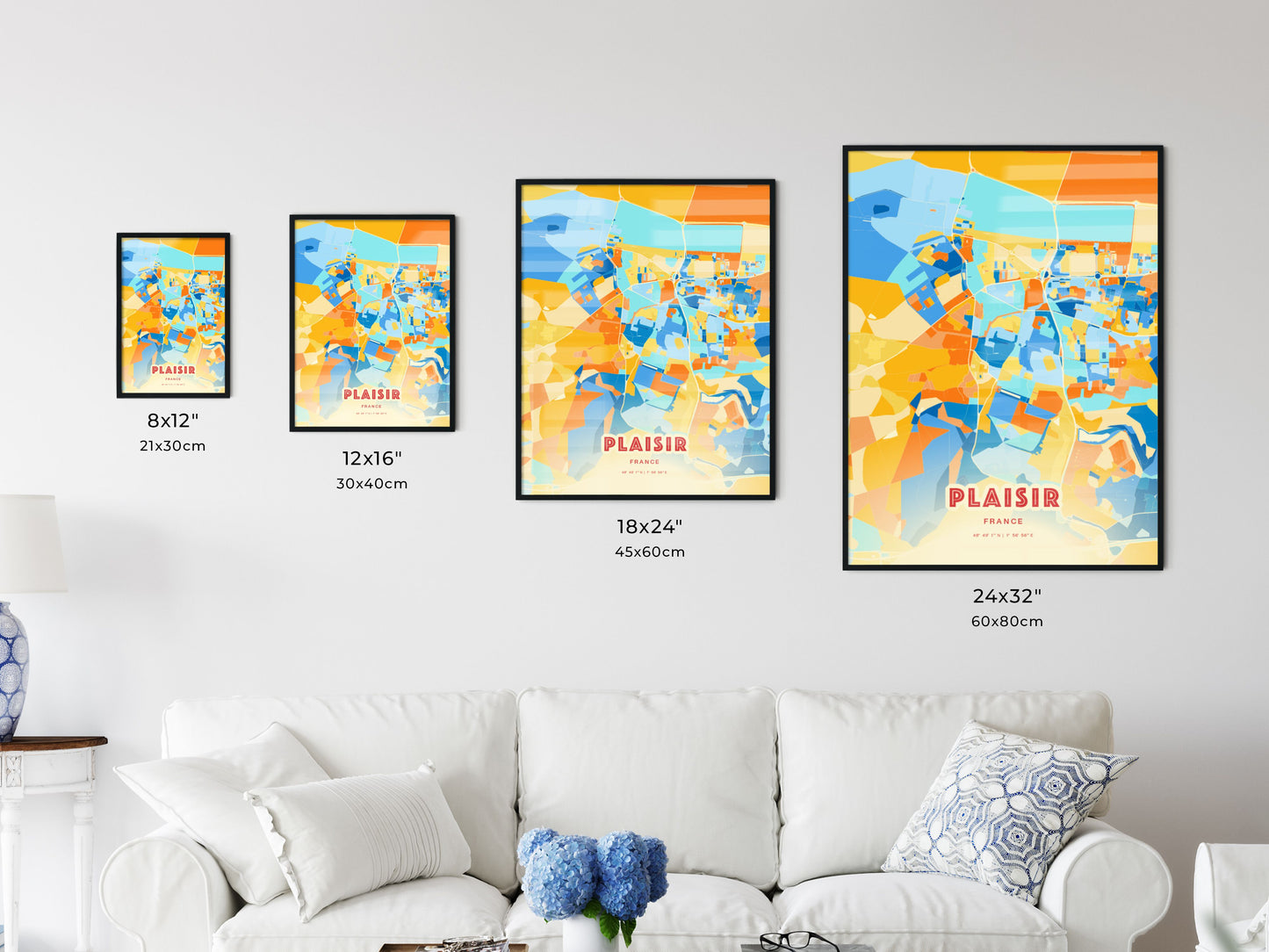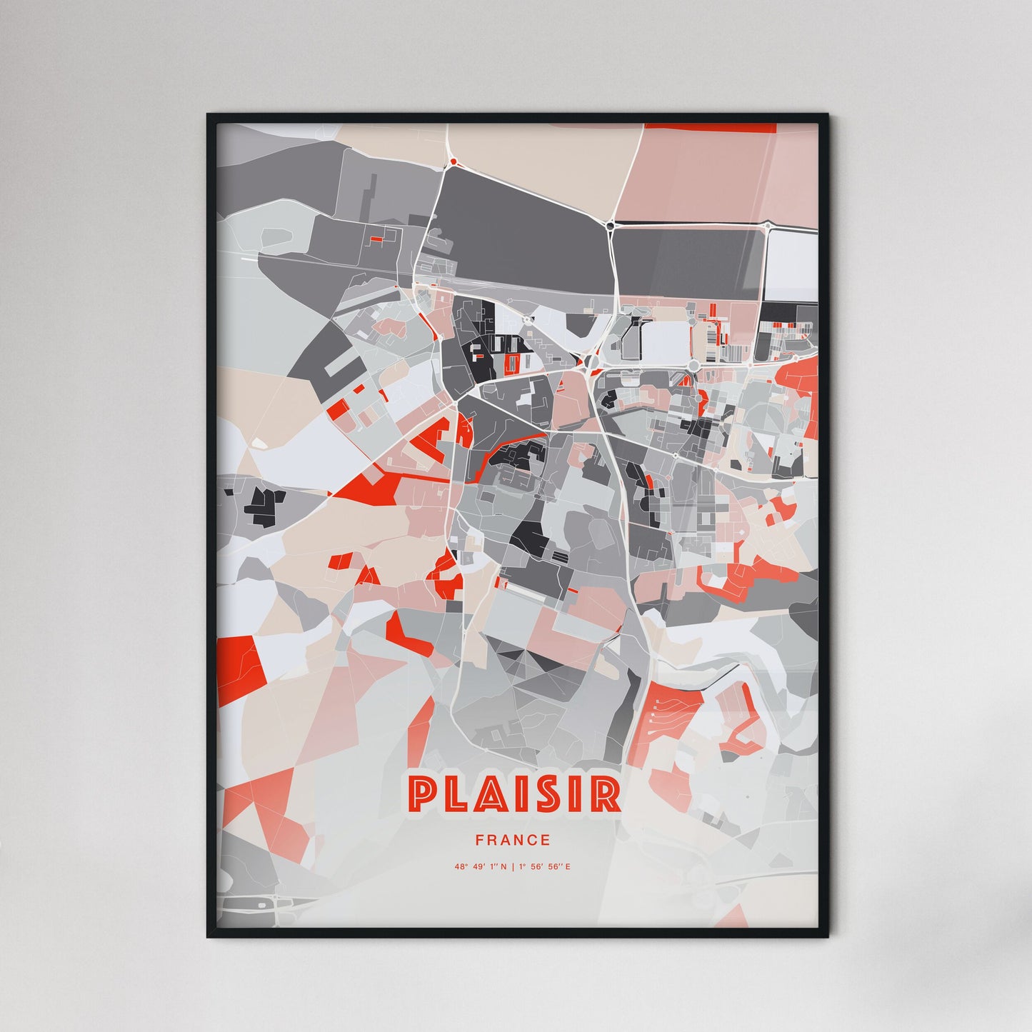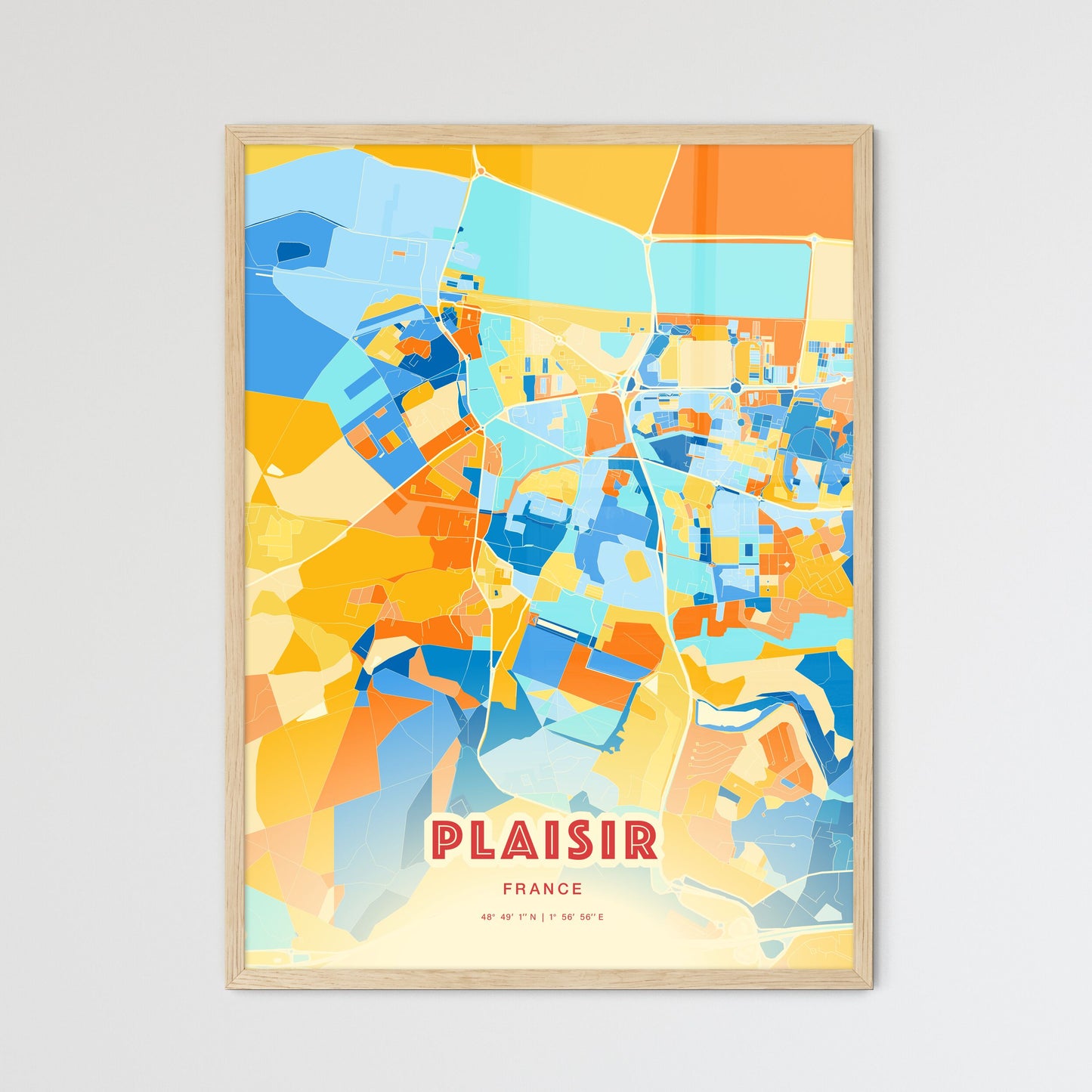 Plaisir city map - with fresh bright orange and blue colors. Our PLAISIR FRANCE map has bright streets, railroads and waterways combined with colorful city areas. The city map will be an eye-catcher in any room with its rich detail and colorful freshness.