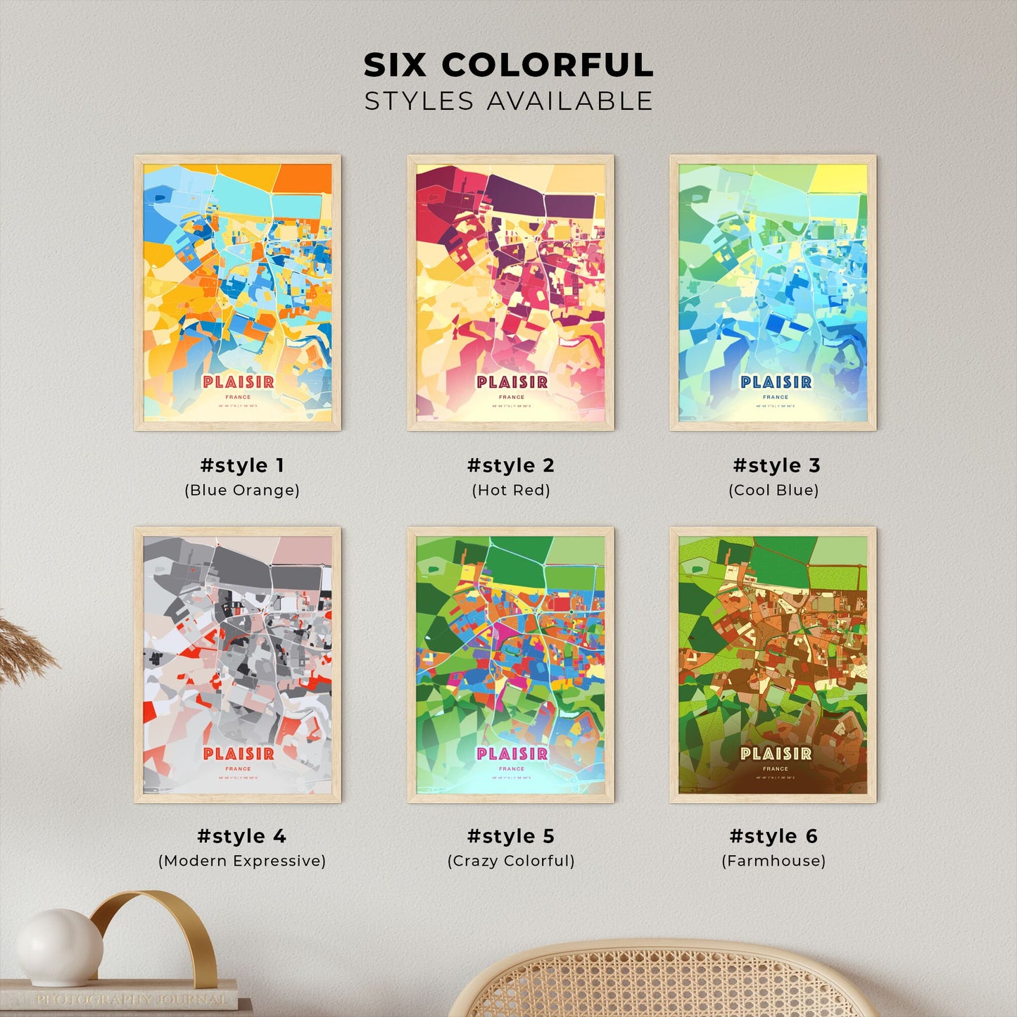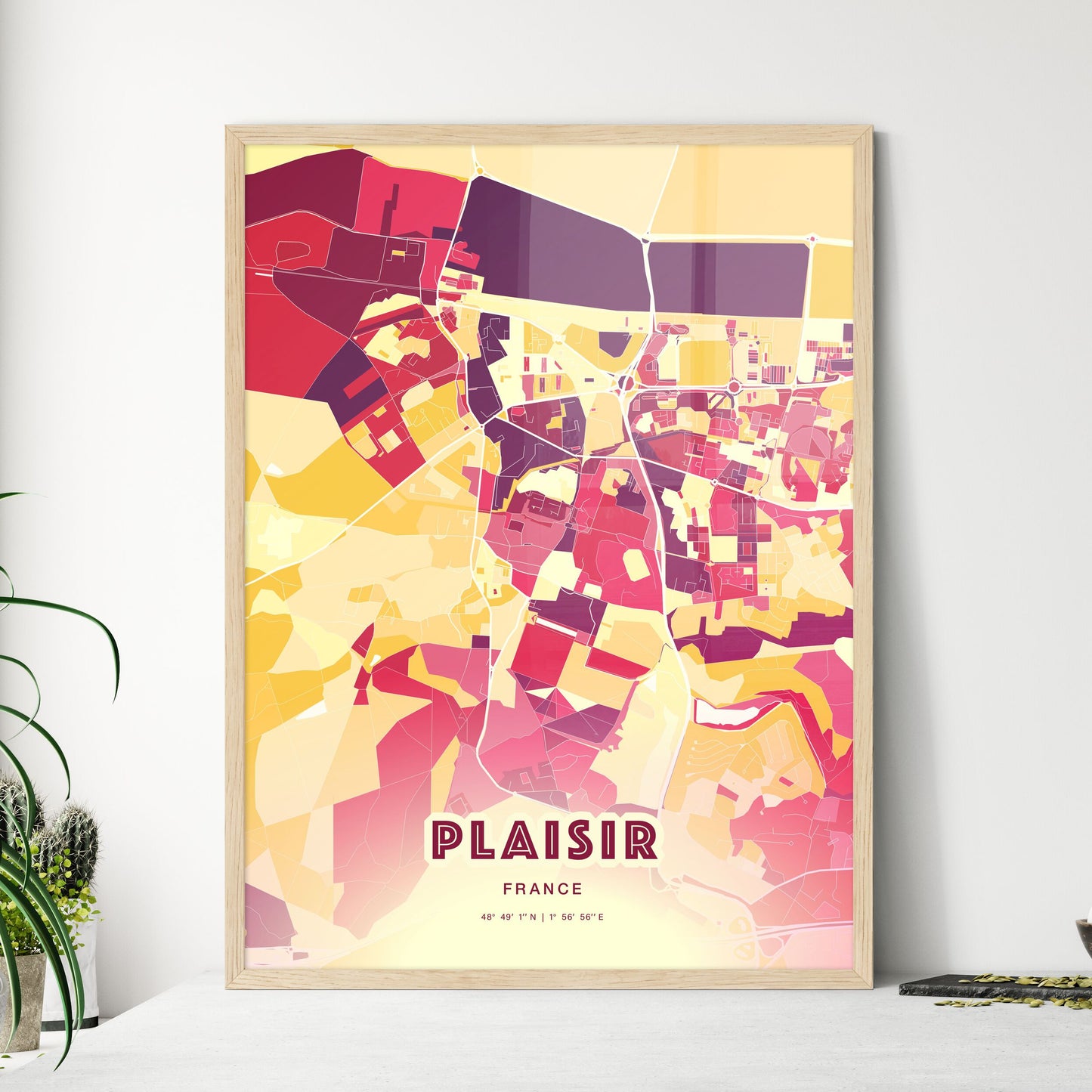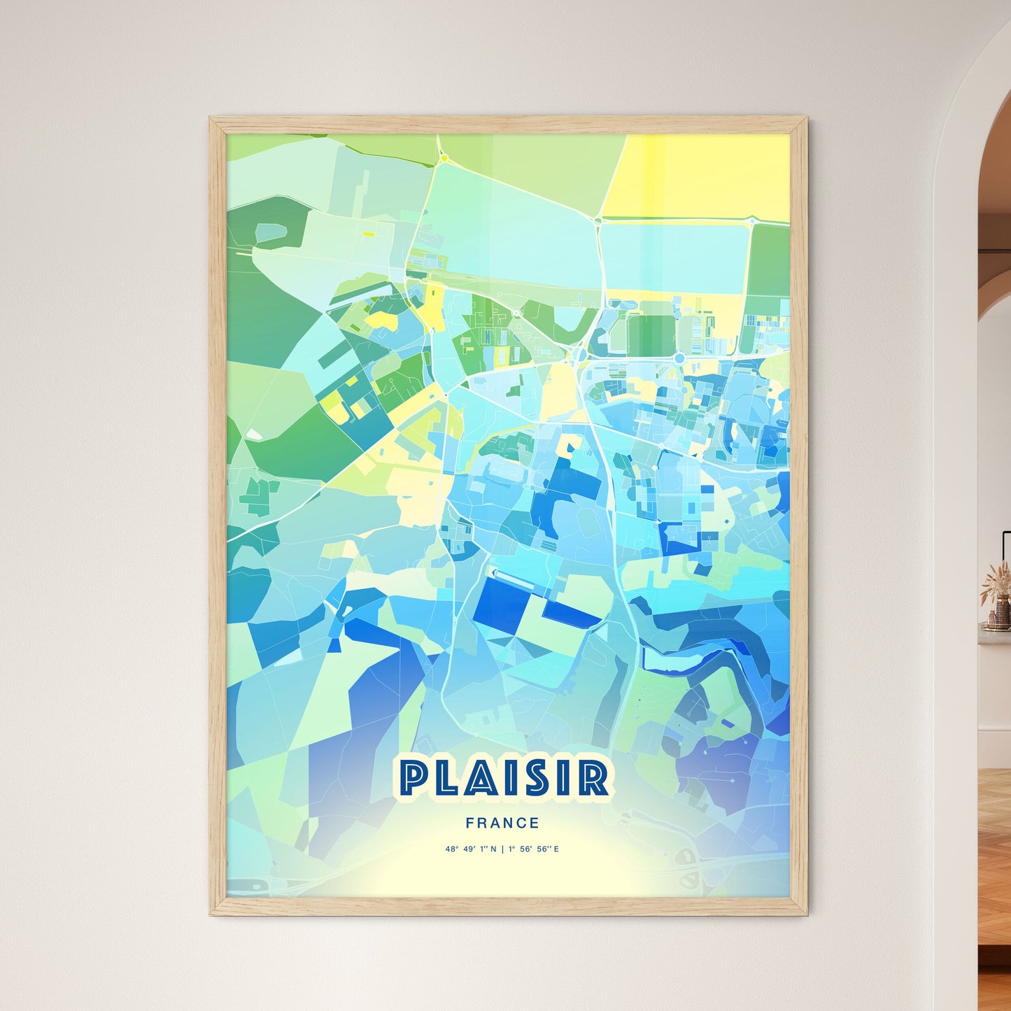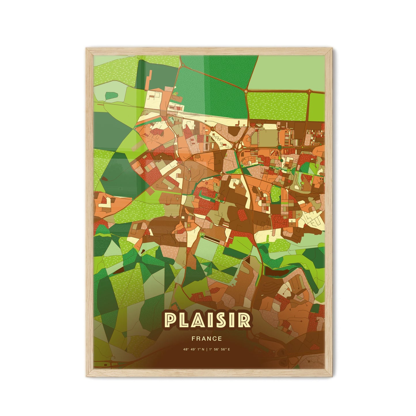 Plaisir city map - with fresh bright orange and blue colors. Our PLAISIR FRANCE map has bright streets, railroads and waterways combined with colorful city areas. The city map will be an eye-catcher in any room with its rich detail and colorful freshness.