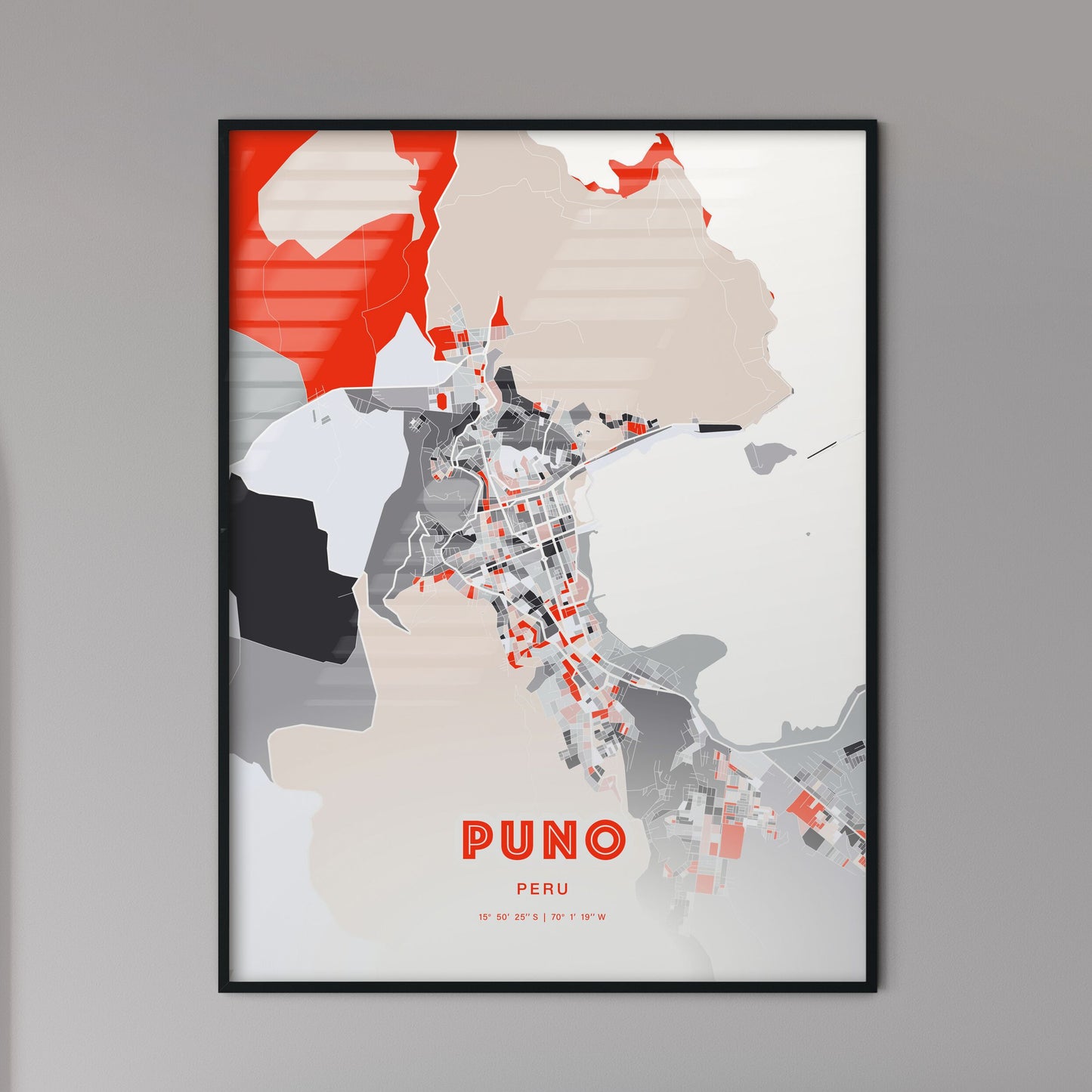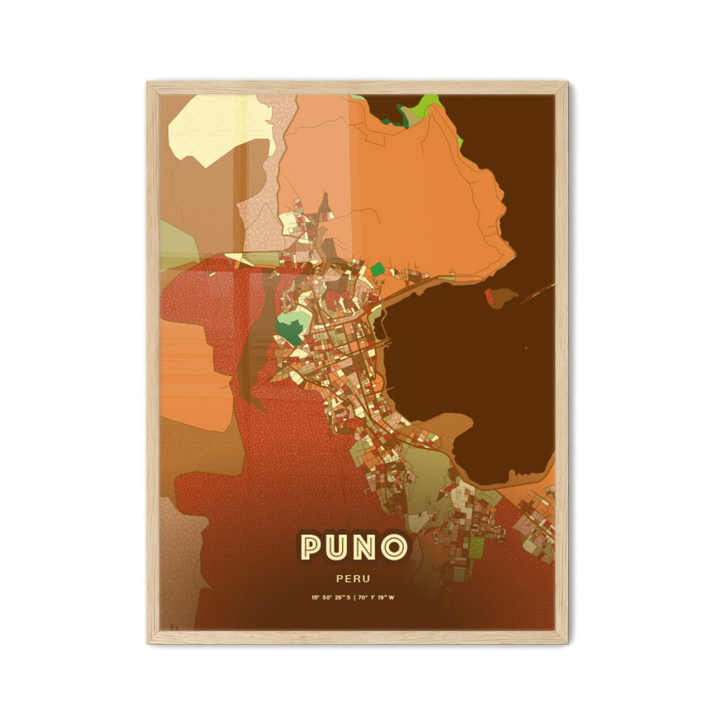 Puno city map - with fresh bright orange and blue colors. Our PUNO PERU map has bright streets, railroads and waterways combined with colorful city areas. The city map will be an eye-catcher in any room with its rich detail and colorful freshness.