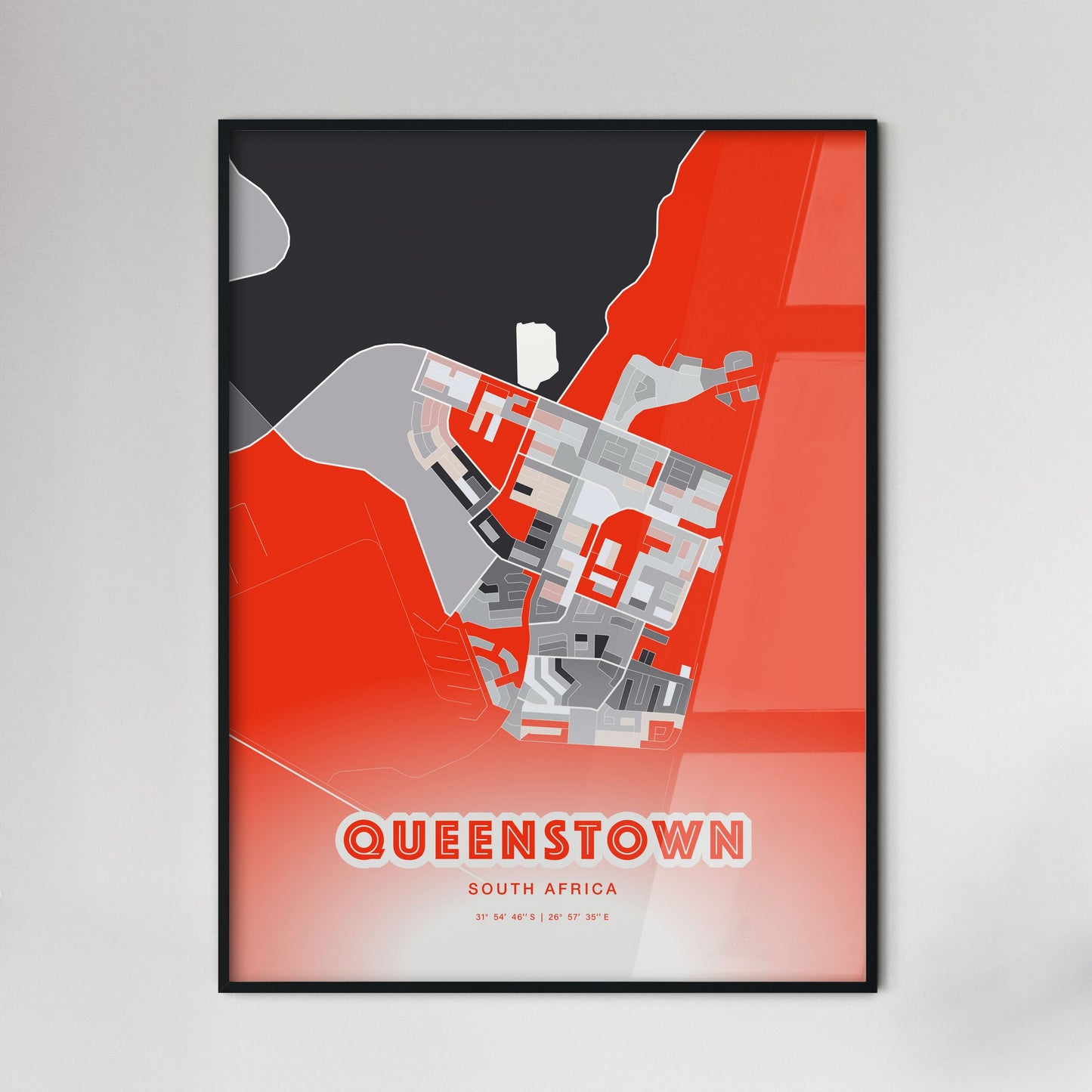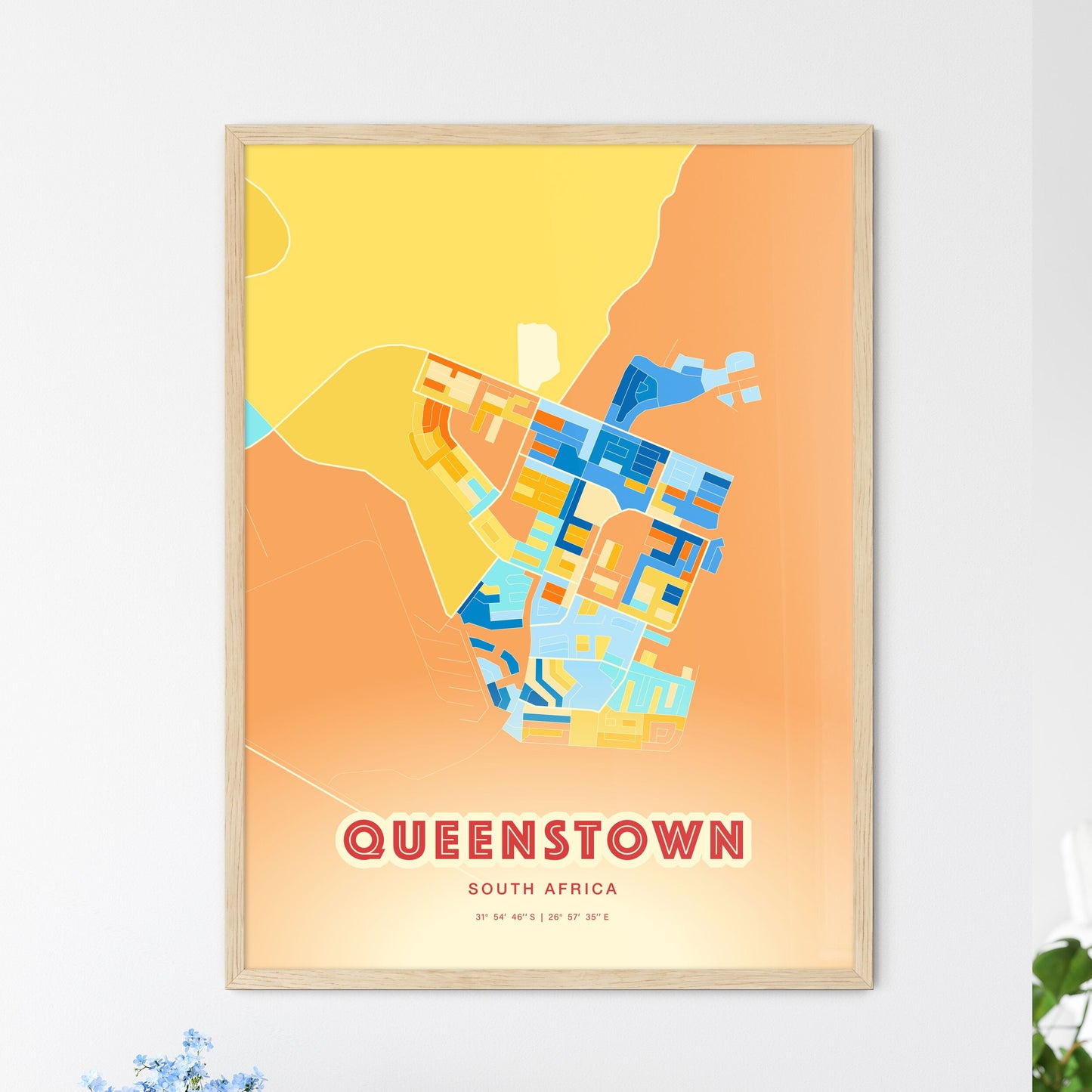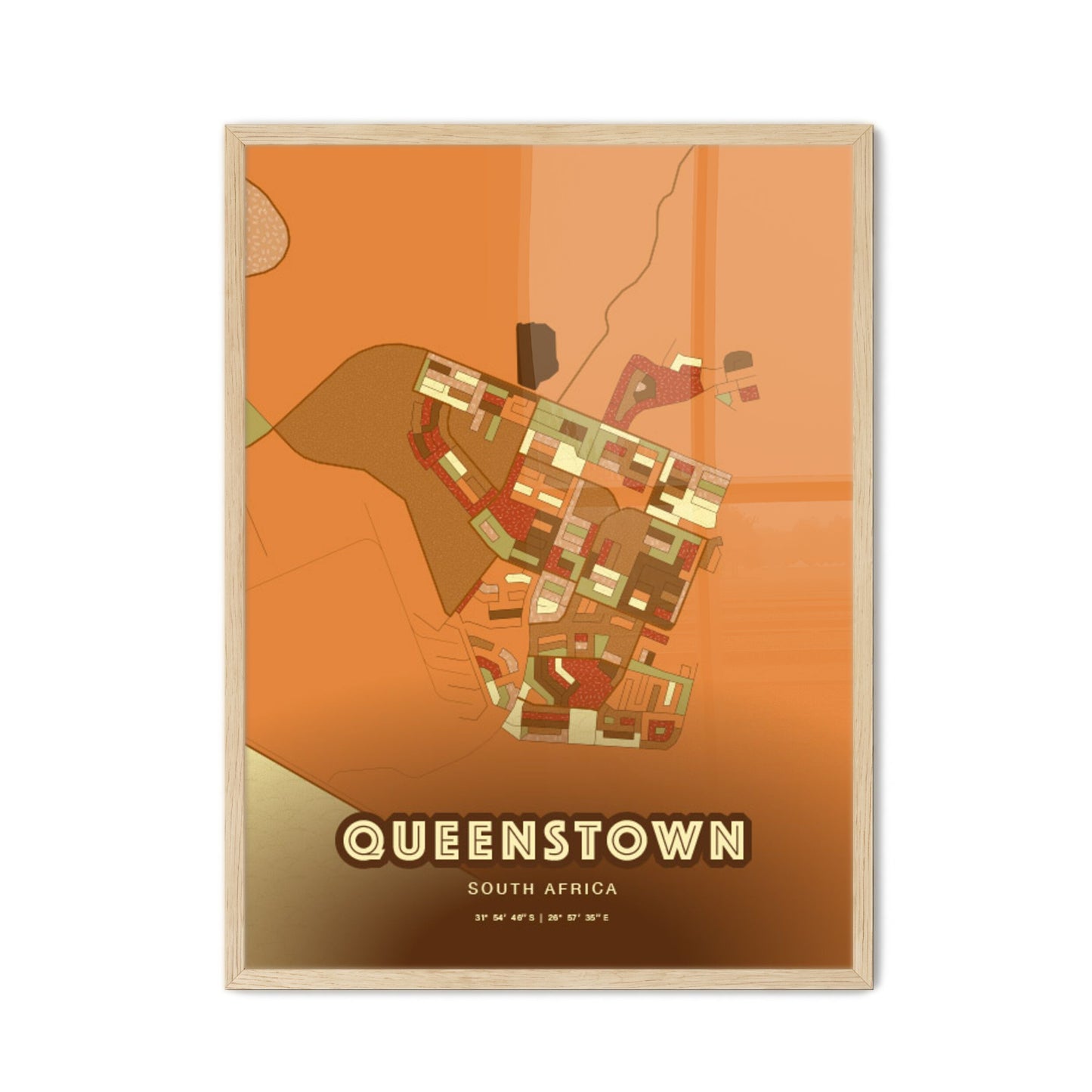 Queenstown city map - with fresh bright orange and blue colors. Our QUEENSTOWN SOUTH AFRICA map has bright streets, railroads and waterways combined with colorful city areas. The city map will be an eye-catcher in any room with its rich detail and colorful freshness.