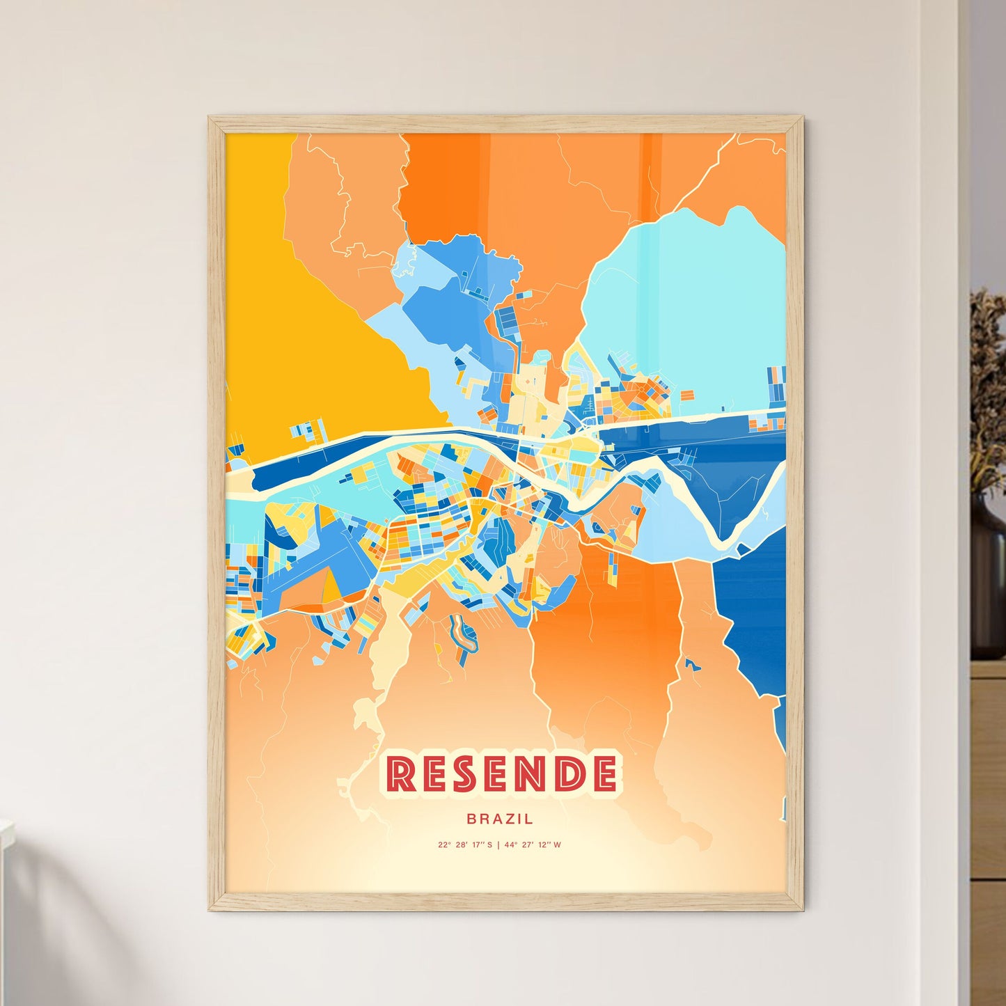 Resende city map - with fresh bright orange and blue colors. Our RESENDE BRAZIL map has bright streets, railroads and waterways combined with colorful city areas. The city map will be an eye-catcher in any room with its rich detail and colorful freshness.