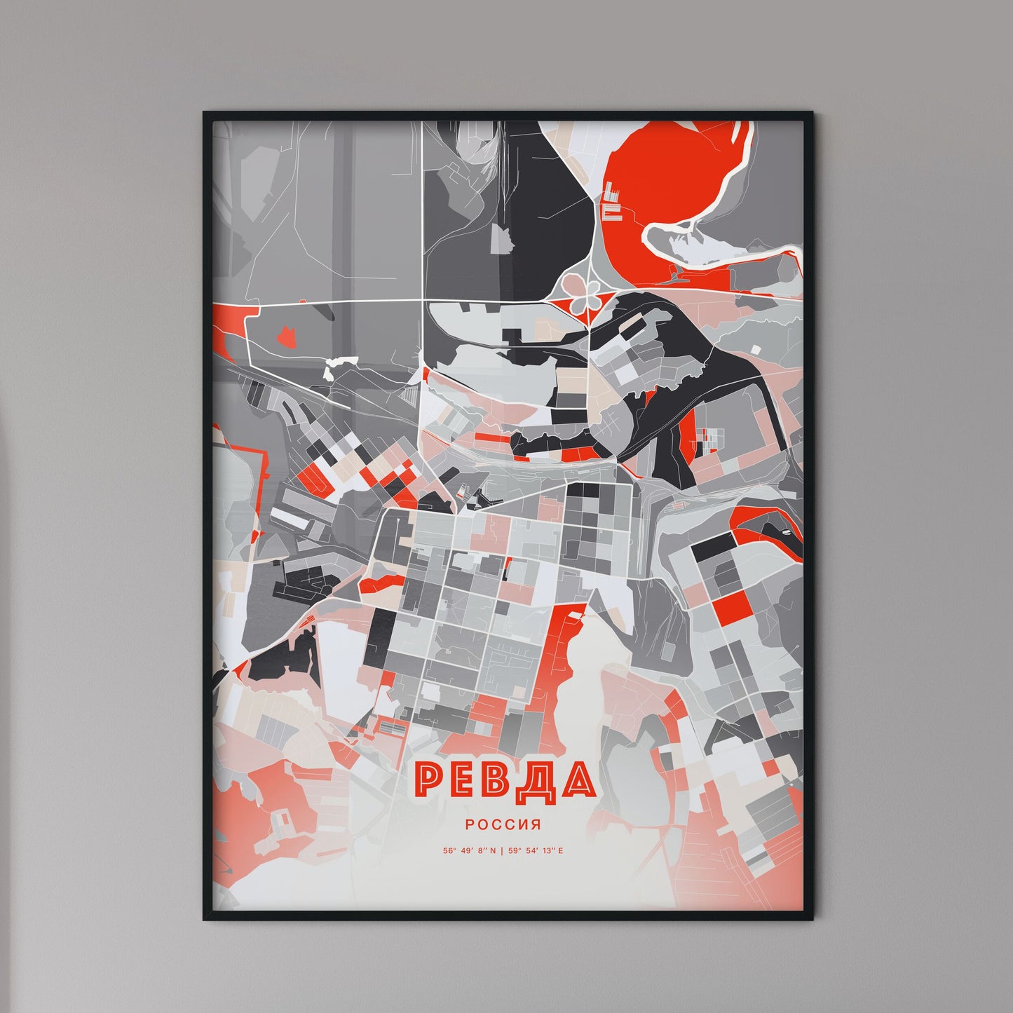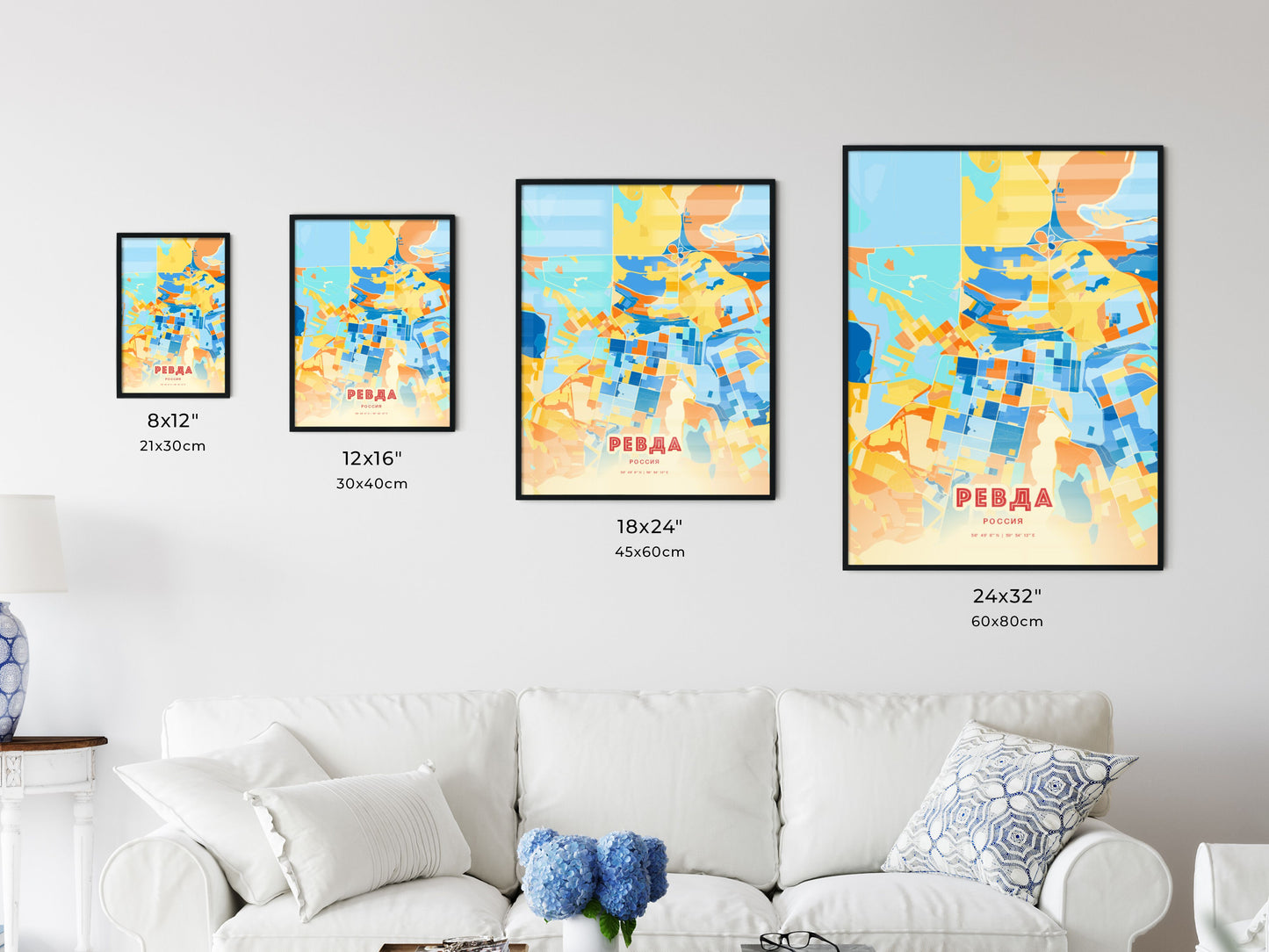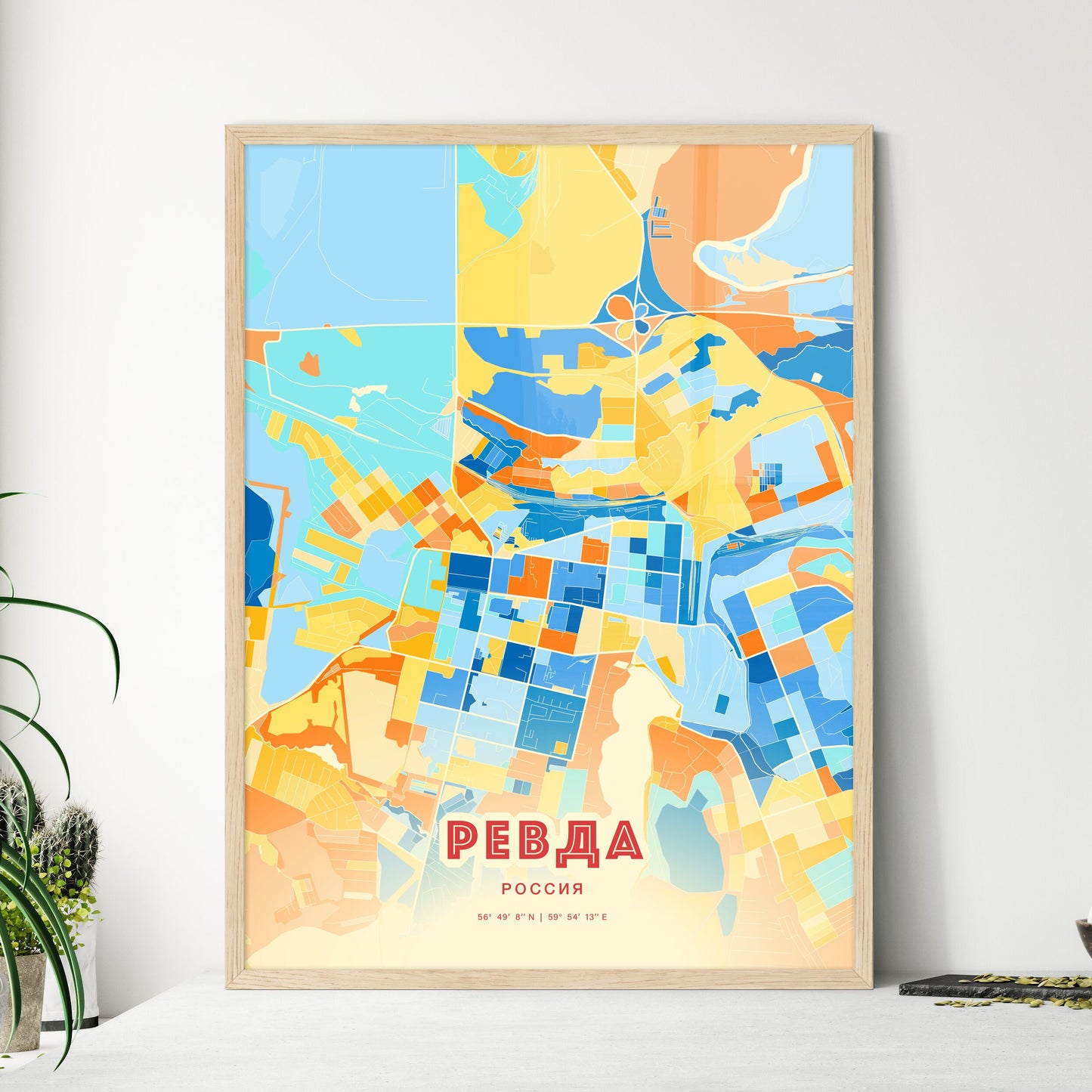 Revda city map - with fresh bright orange and blue colors. Our РЕВДА РОССИЯ map has bright streets, railroads and waterways combined with colorful city areas. The city map will be an eye-catcher in any room with its rich detail and colorful freshness.