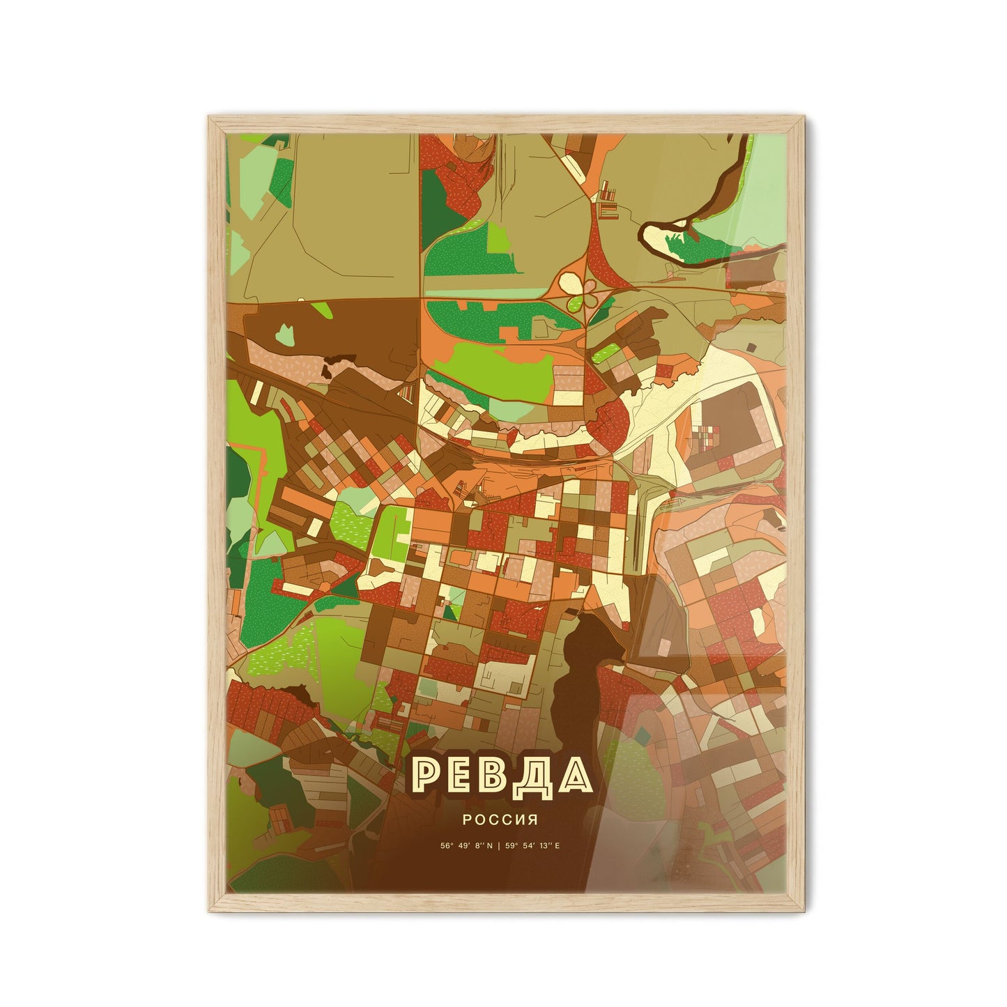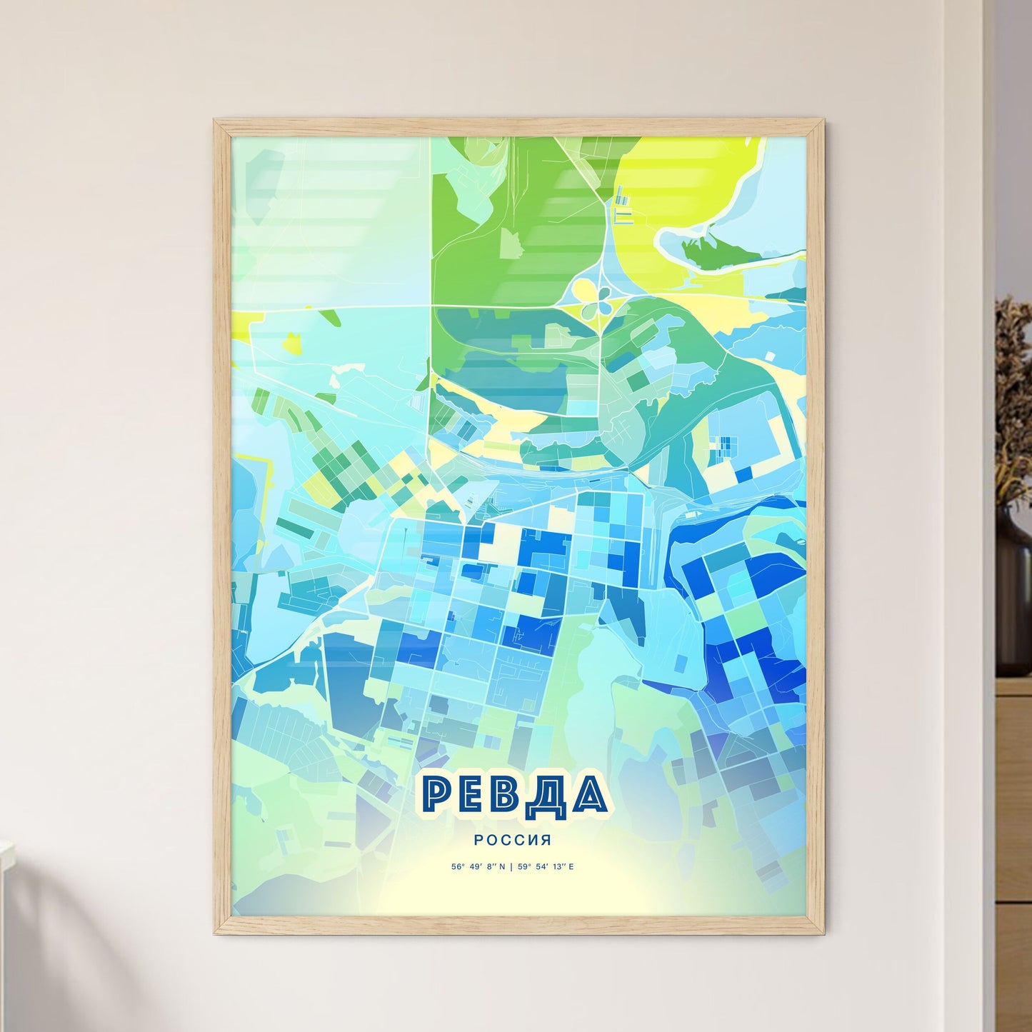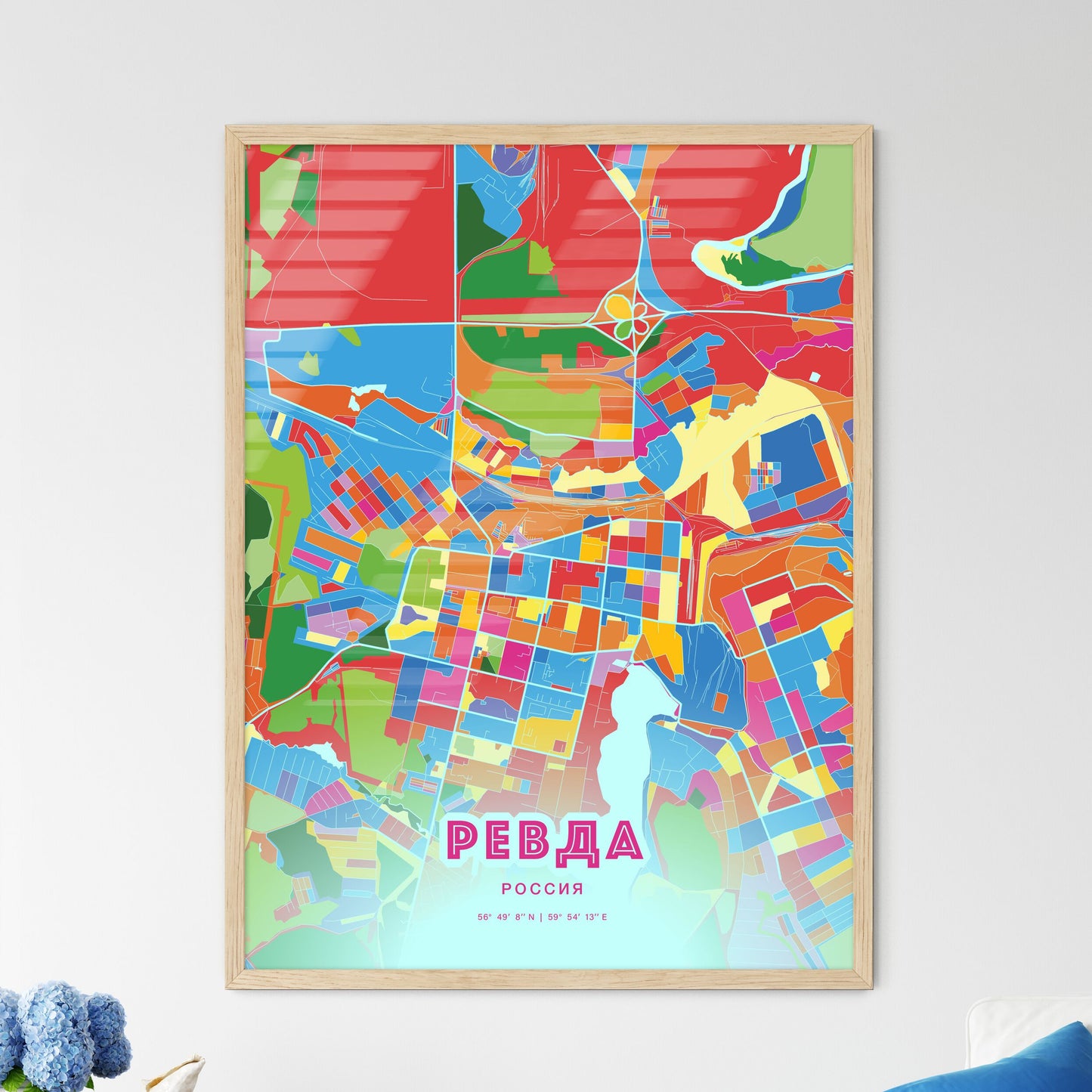 Revda city map - with fresh bright orange and blue colors. Our РЕВДА РОССИЯ map has bright streets, railroads and waterways combined with colorful city areas. The city map will be an eye-catcher in any room with its rich detail and colorful freshness.