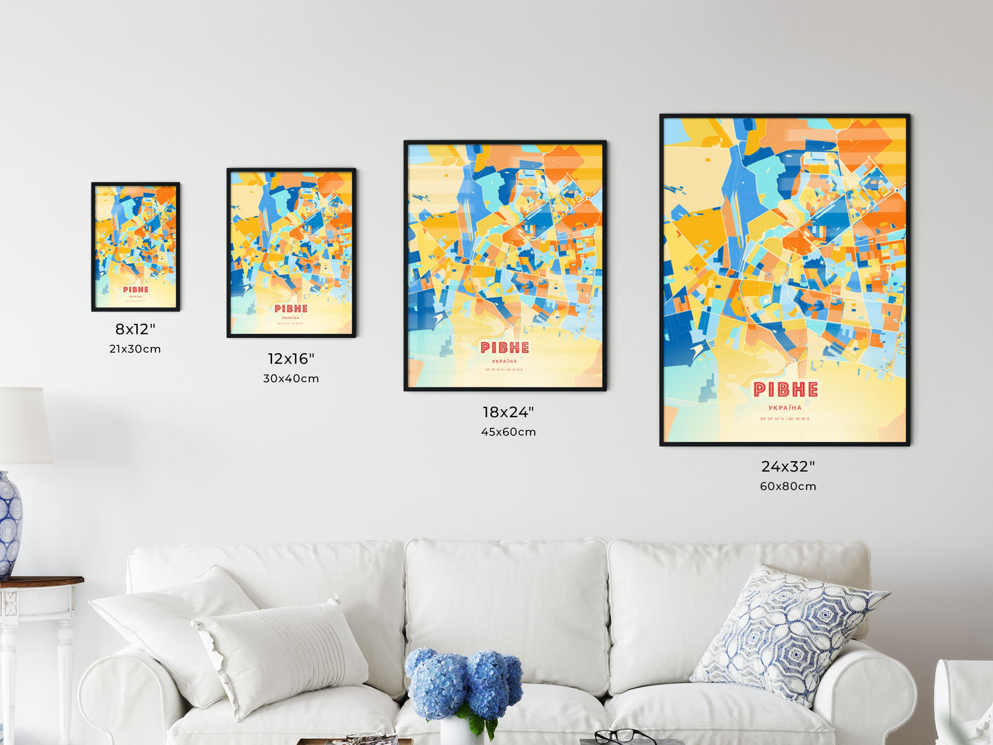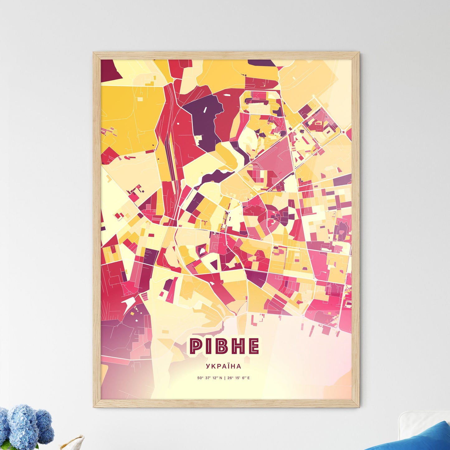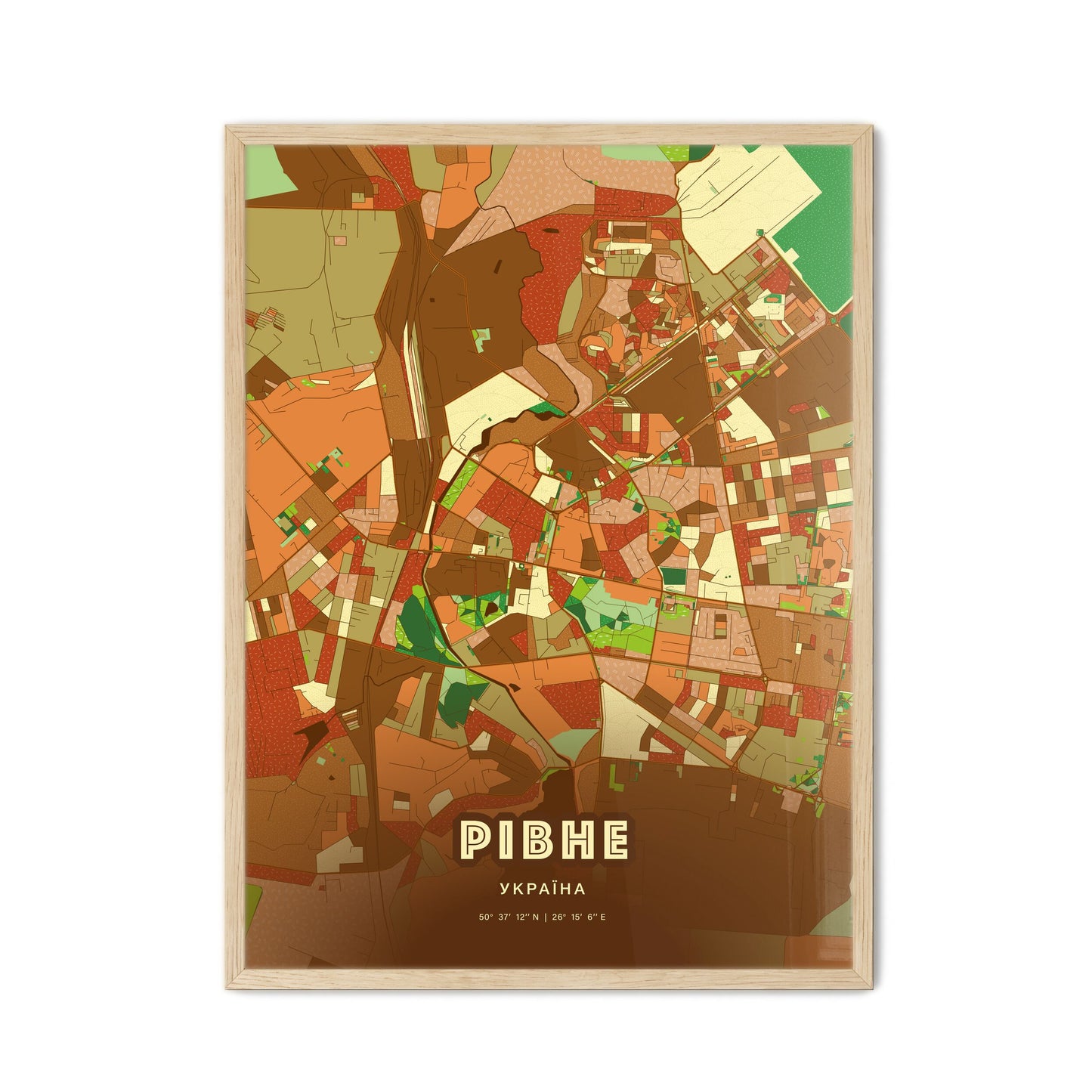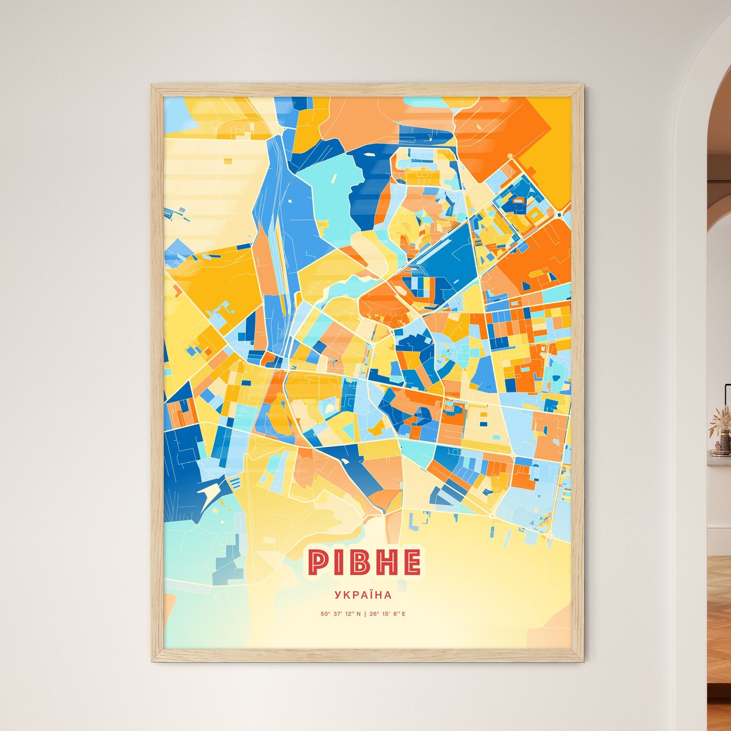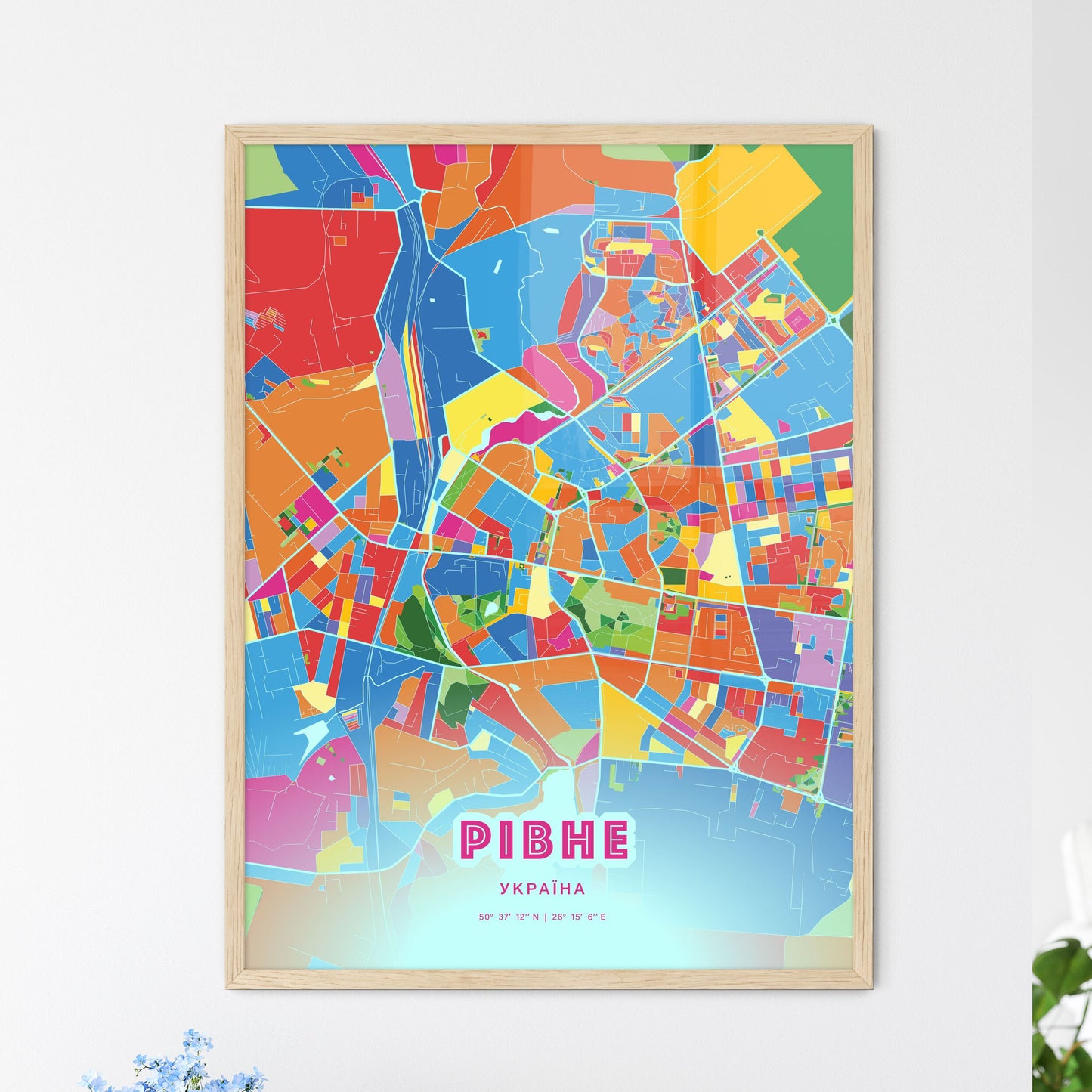Rivne city map - with fresh bright orange and blue colors. Our РІВНЕ УКРАЇНА map has bright streets, railroads and waterways combined with colorful city areas. The city map will be an eye-catcher in any room with its rich detail and colorful freshness.