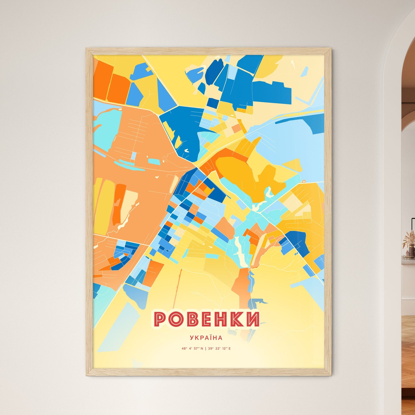 Rovenky city map - with fresh bright orange and blue colors. Our РОВЕНКИ УКРАЇНА map has bright streets, railroads and waterways combined with colorful city areas. The city map will be an eye-catcher in any room with its rich detail and colorful freshness.