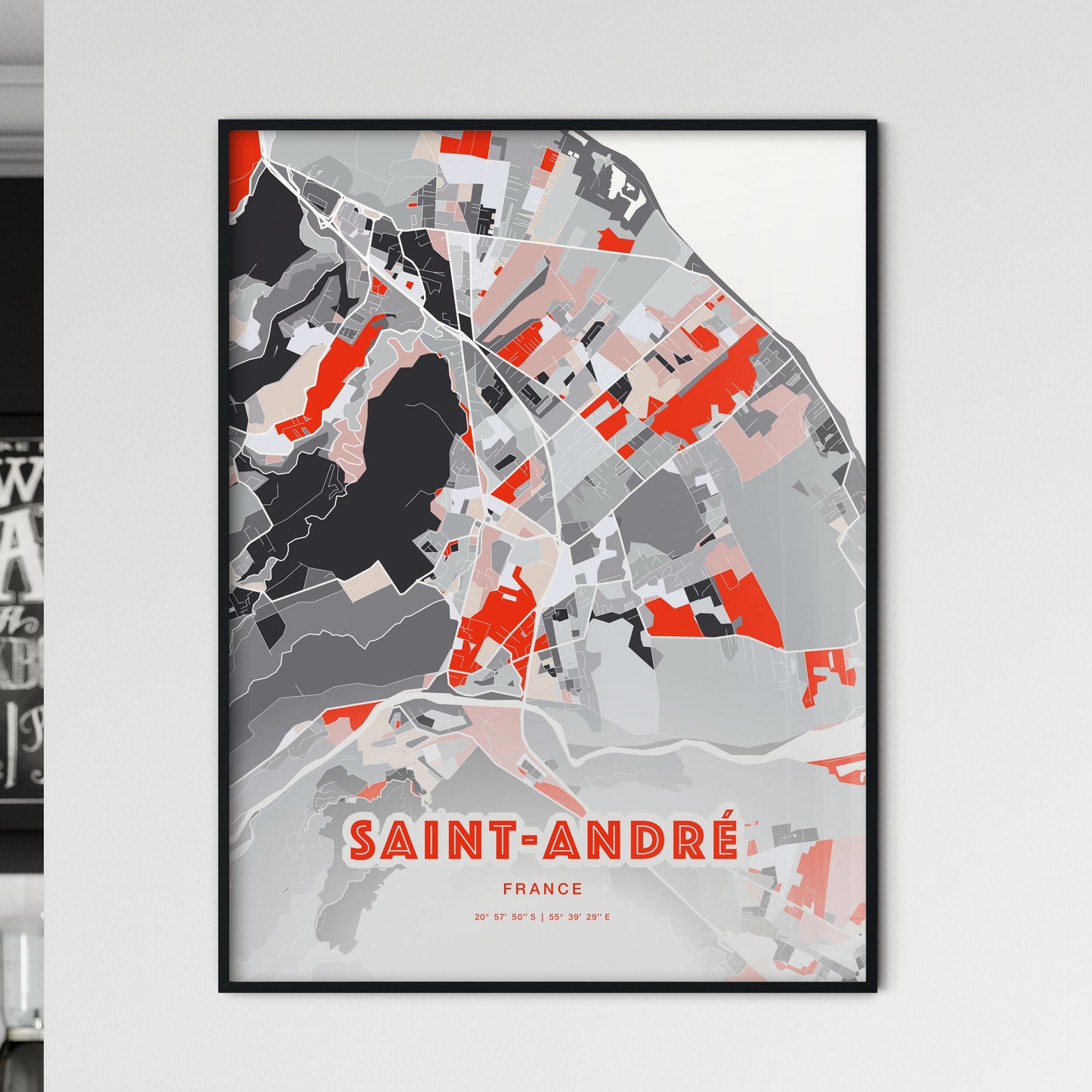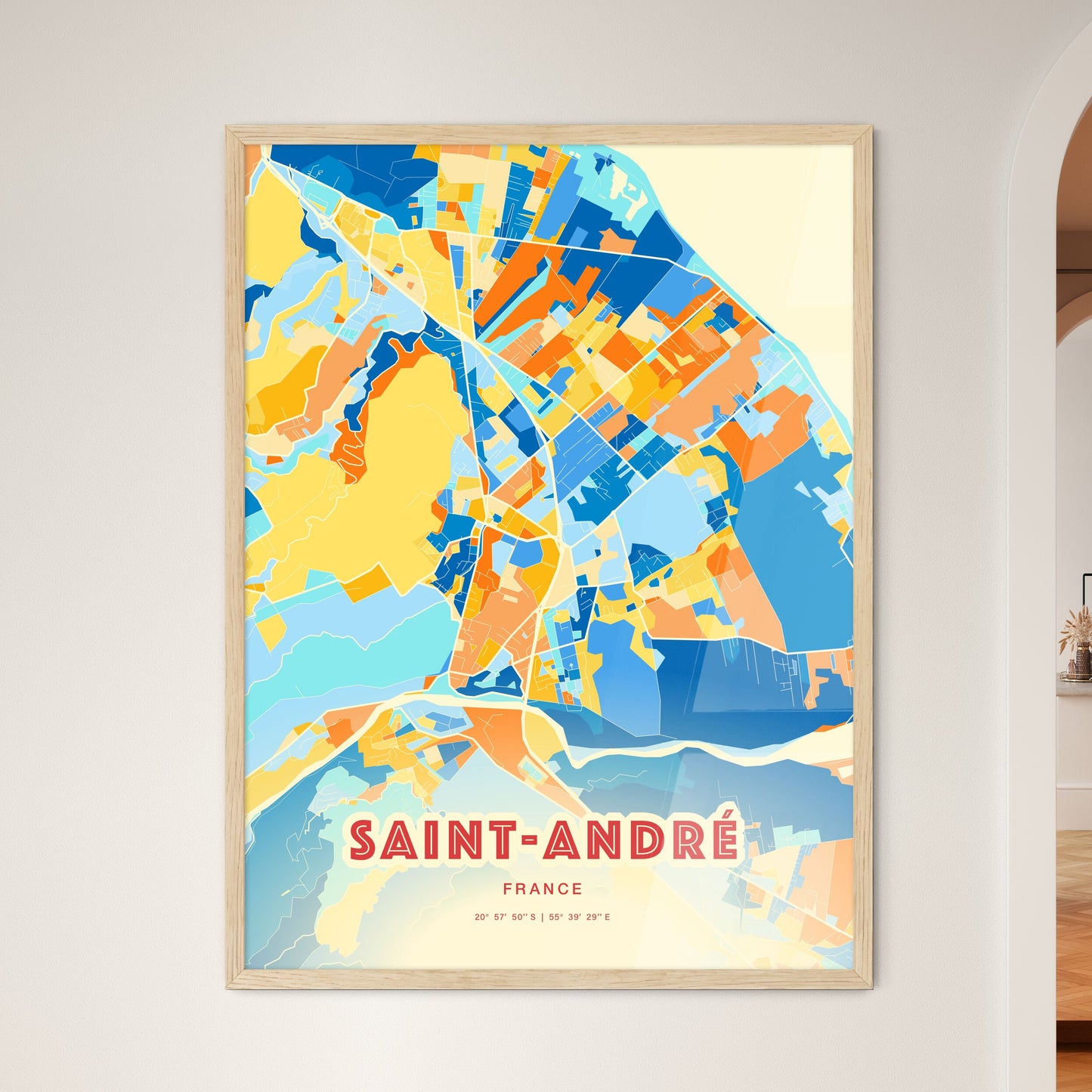 Saint-André city map - with fresh bright orange and blue colors. Our SAINT-ANDRÉ FRANCE map has bright streets, railroads and waterways combined with colorful city areas. The city map will be an eye-catcher in any room with its rich detail and colorful freshness.