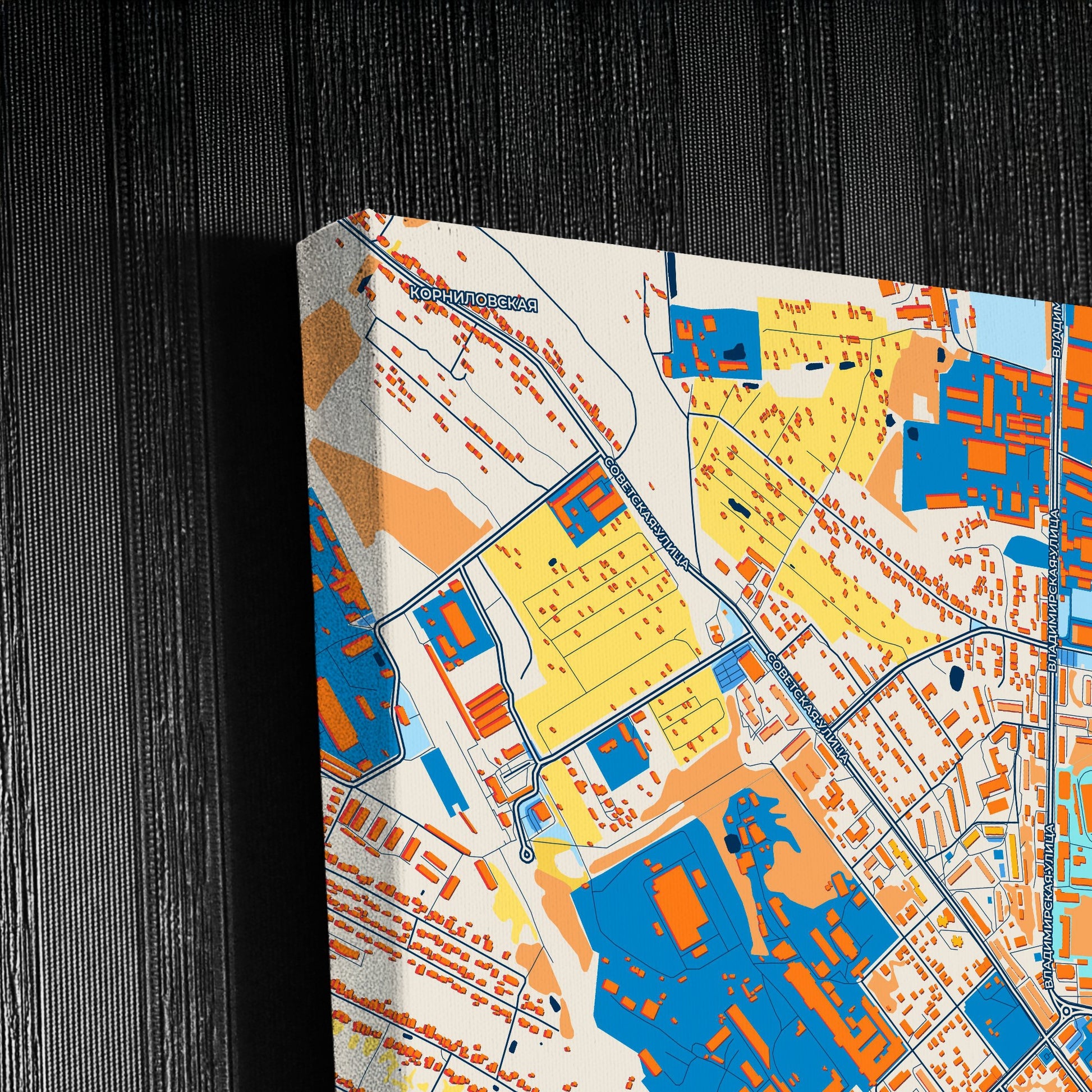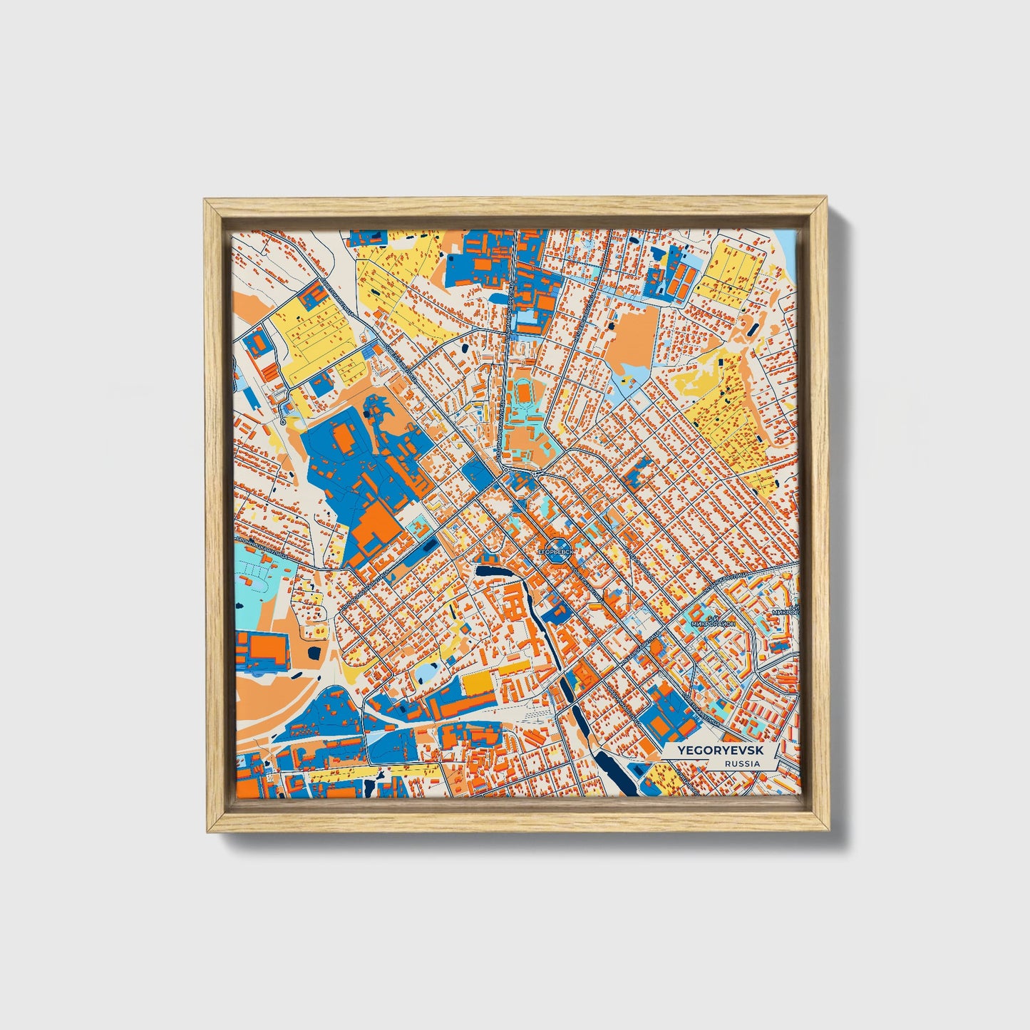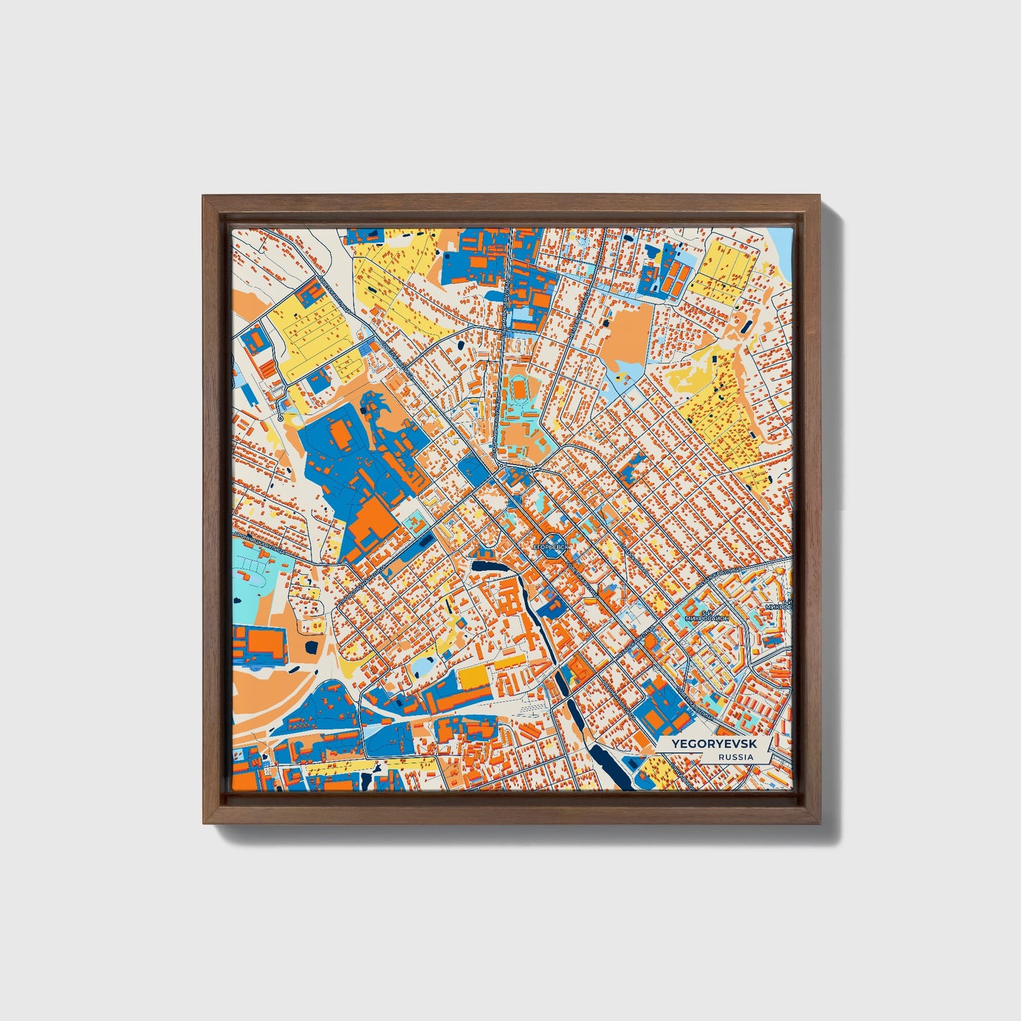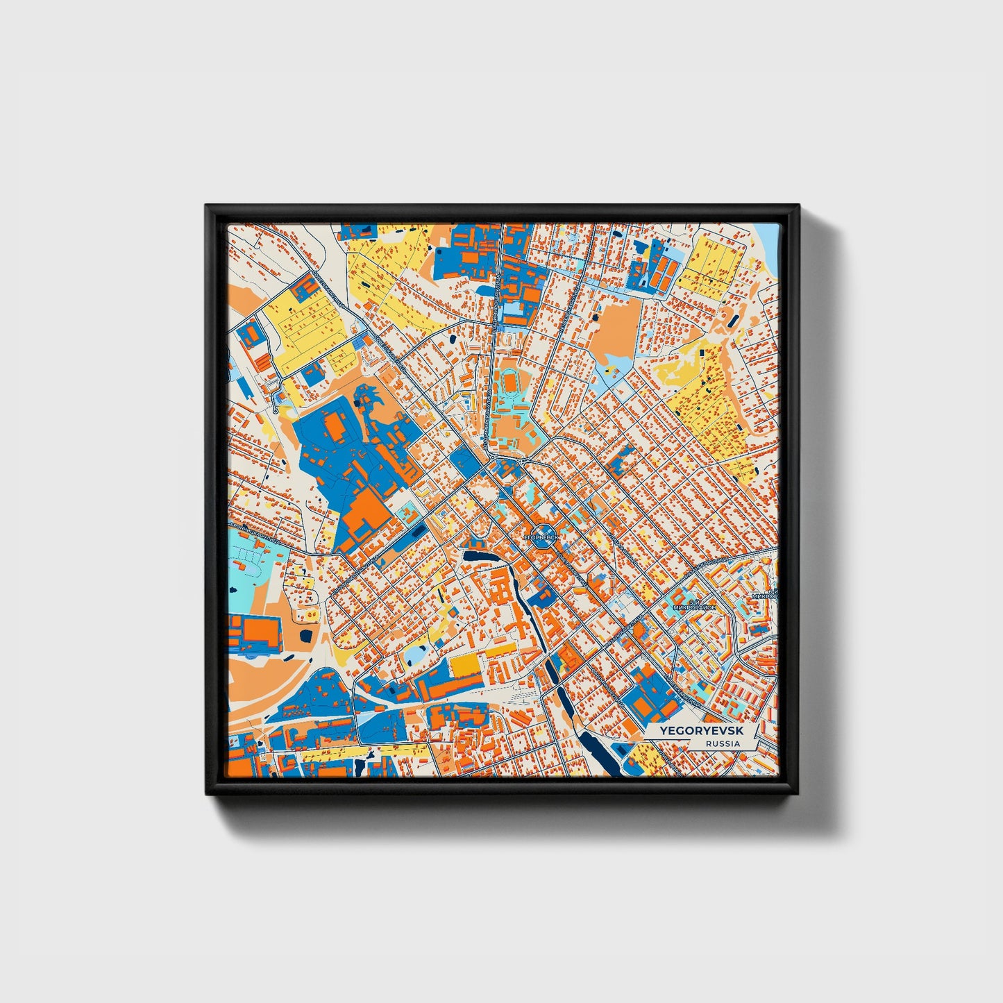 Premium canvas print of Yegoryevsk, Russia, featuring a bespoke map design in a bold, modern style. The artwork blends clean cartographic lines with vibrant color contrasts, highlighting streets, waterways, and neighborhoods in a visually striking way.