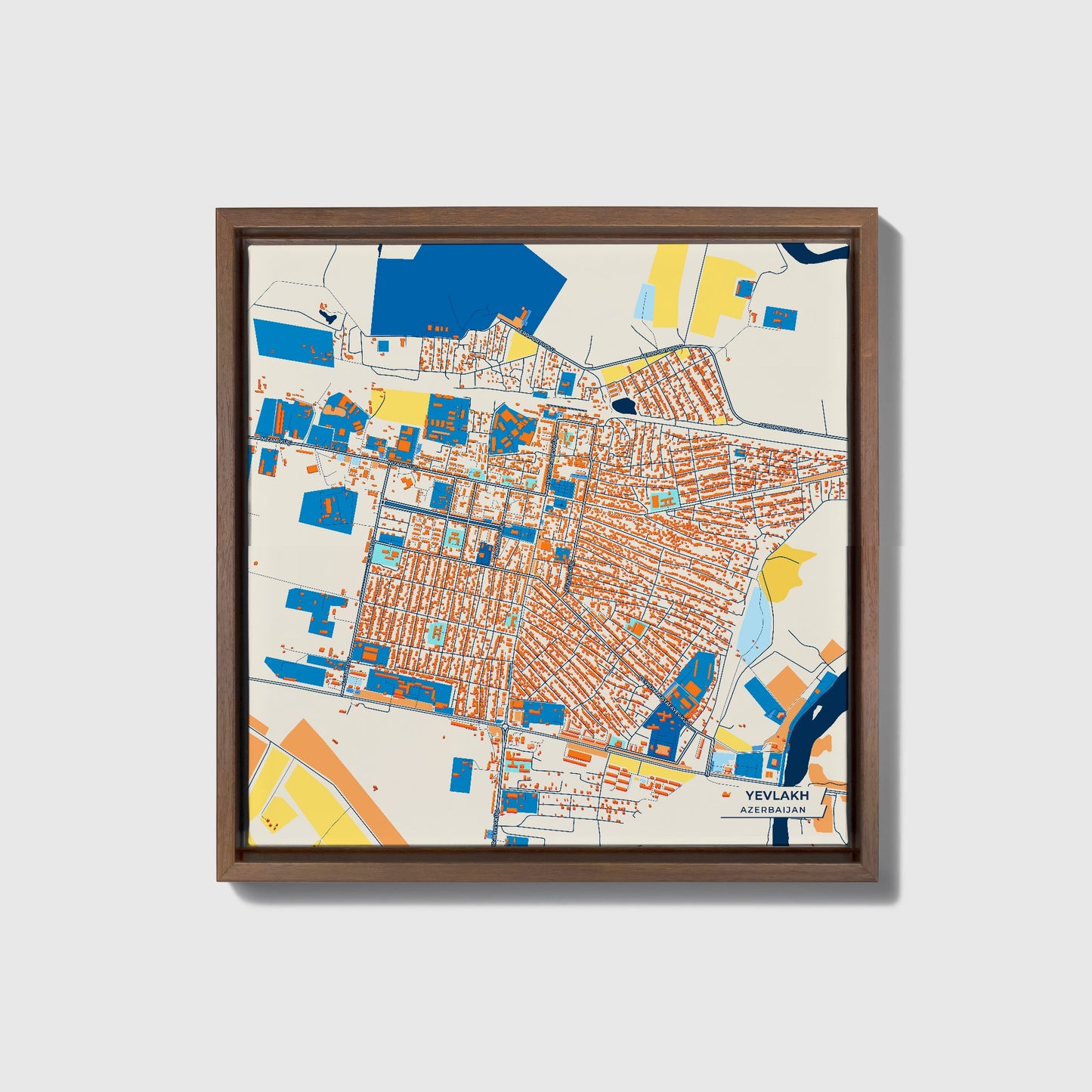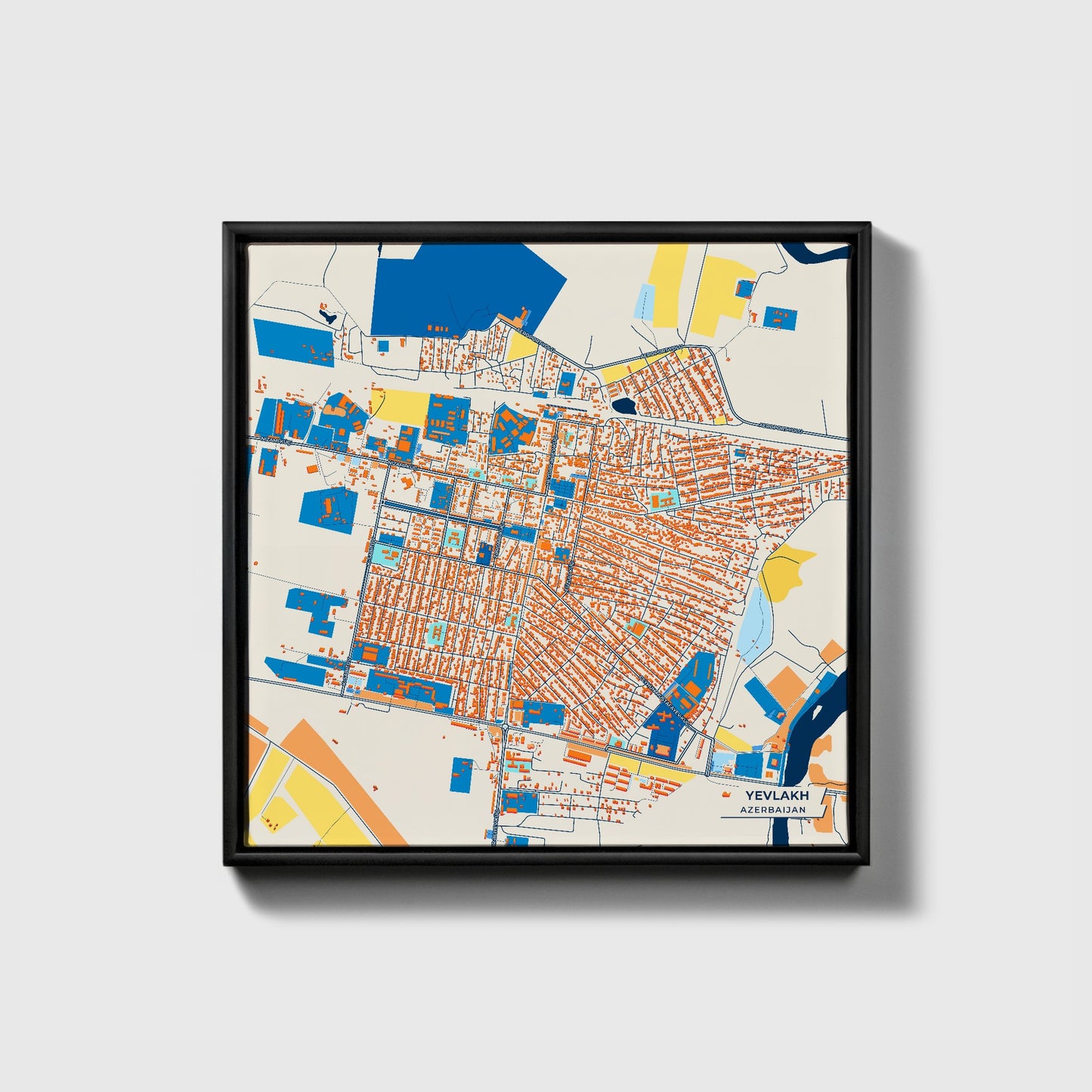 Premium canvas print of Yevlakh, Azerbaijan, featuring a bespoke map design in a bold, modern style. The artwork blends clean cartographic lines with vibrant color contrasts, highlighting streets, waterways, and neighborhoods in a visually striking way.