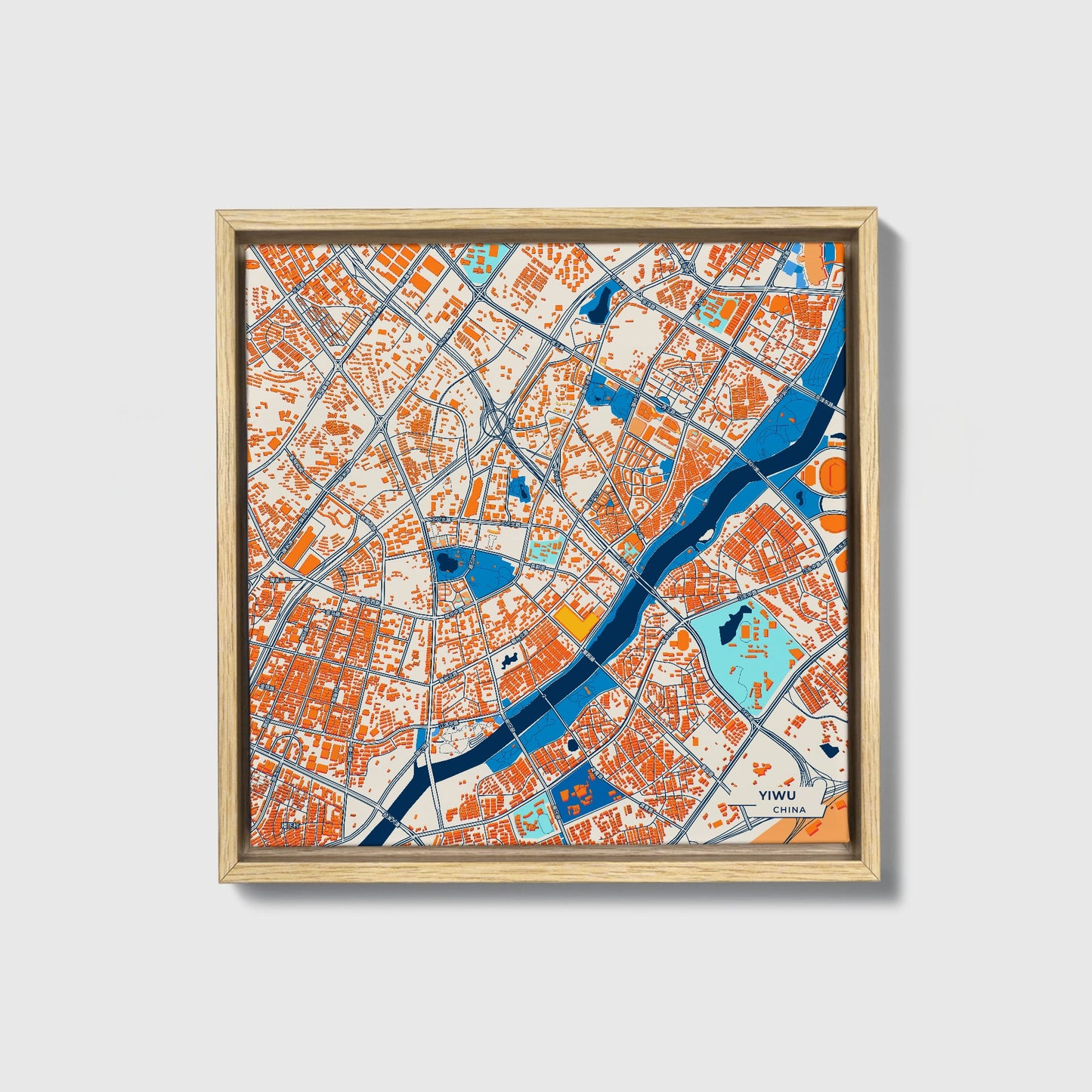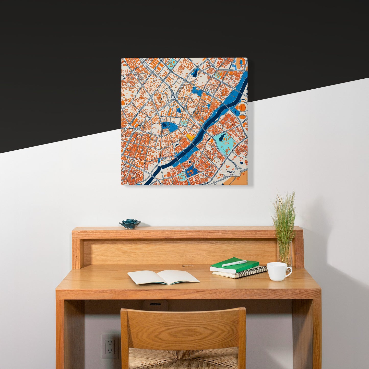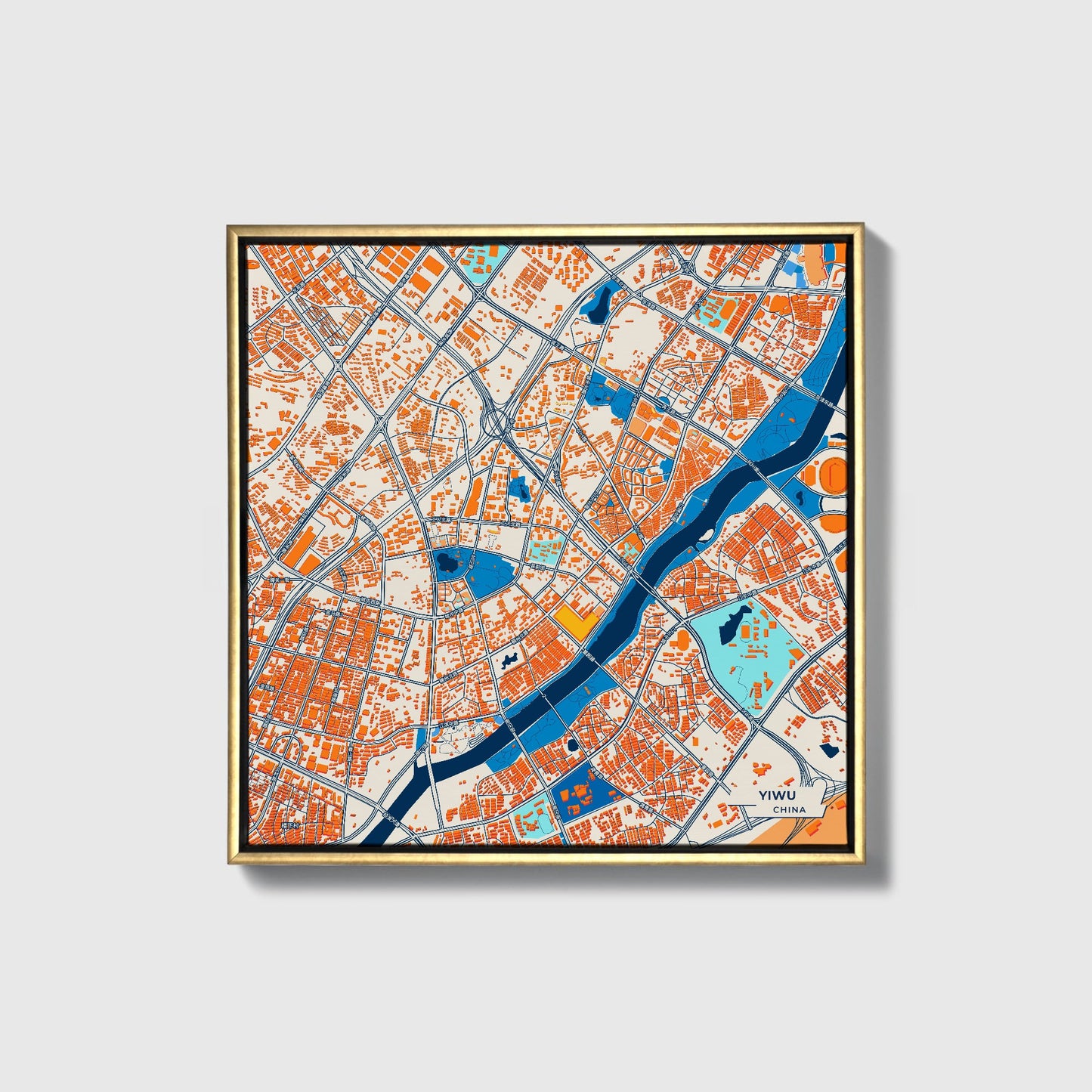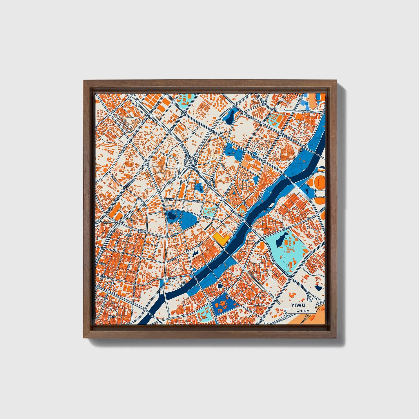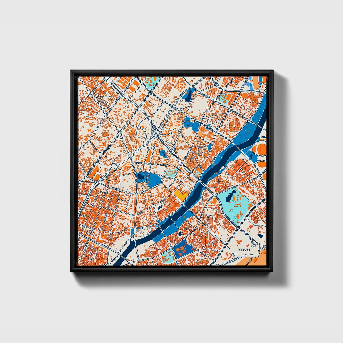 Premium canvas print of Yiwu, China, featuring a bespoke map design in a bold, modern style. The artwork blends clean cartographic lines with vibrant color contrasts, highlighting streets, waterways, and neighborhoods in a visually striking way.