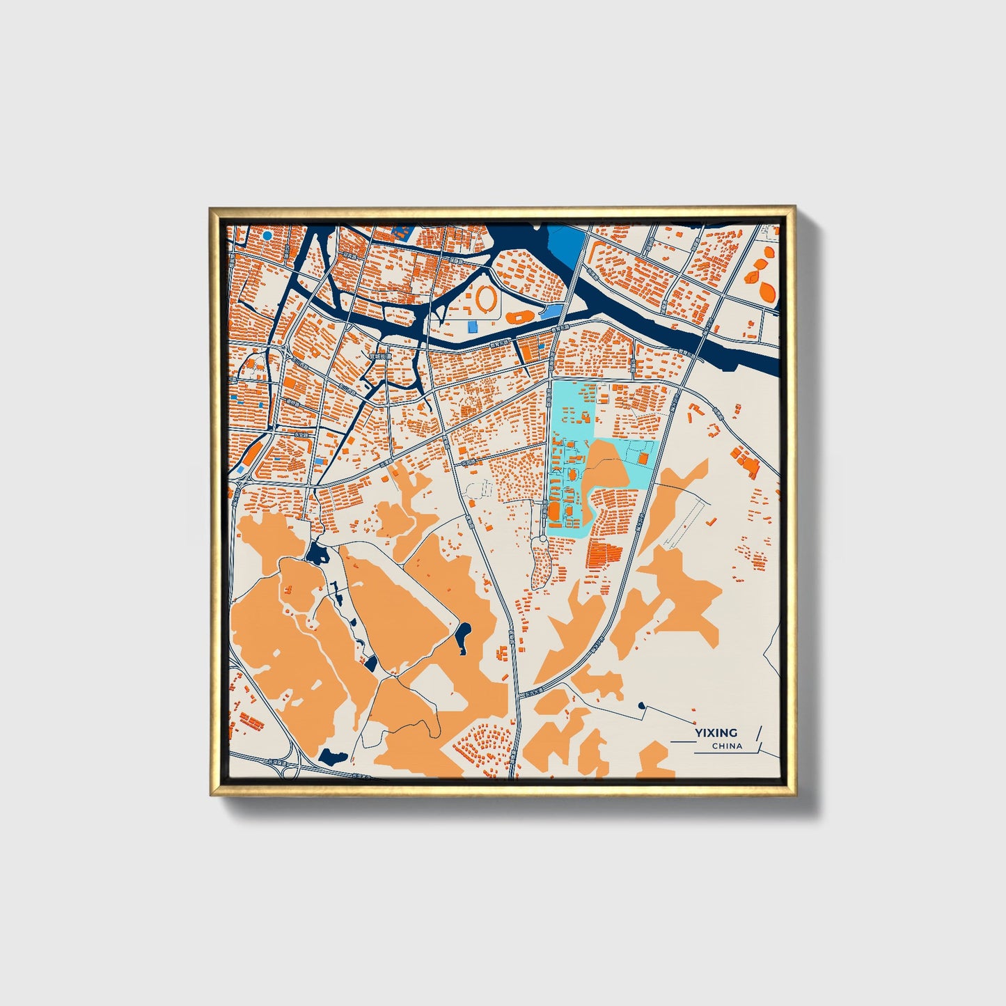 Premium canvas print of Yixing, China, featuring a bespoke map design in a bold, modern style. The artwork blends clean cartographic lines with vibrant color contrasts, highlighting streets, waterways, and neighborhoods in a visually striking way.