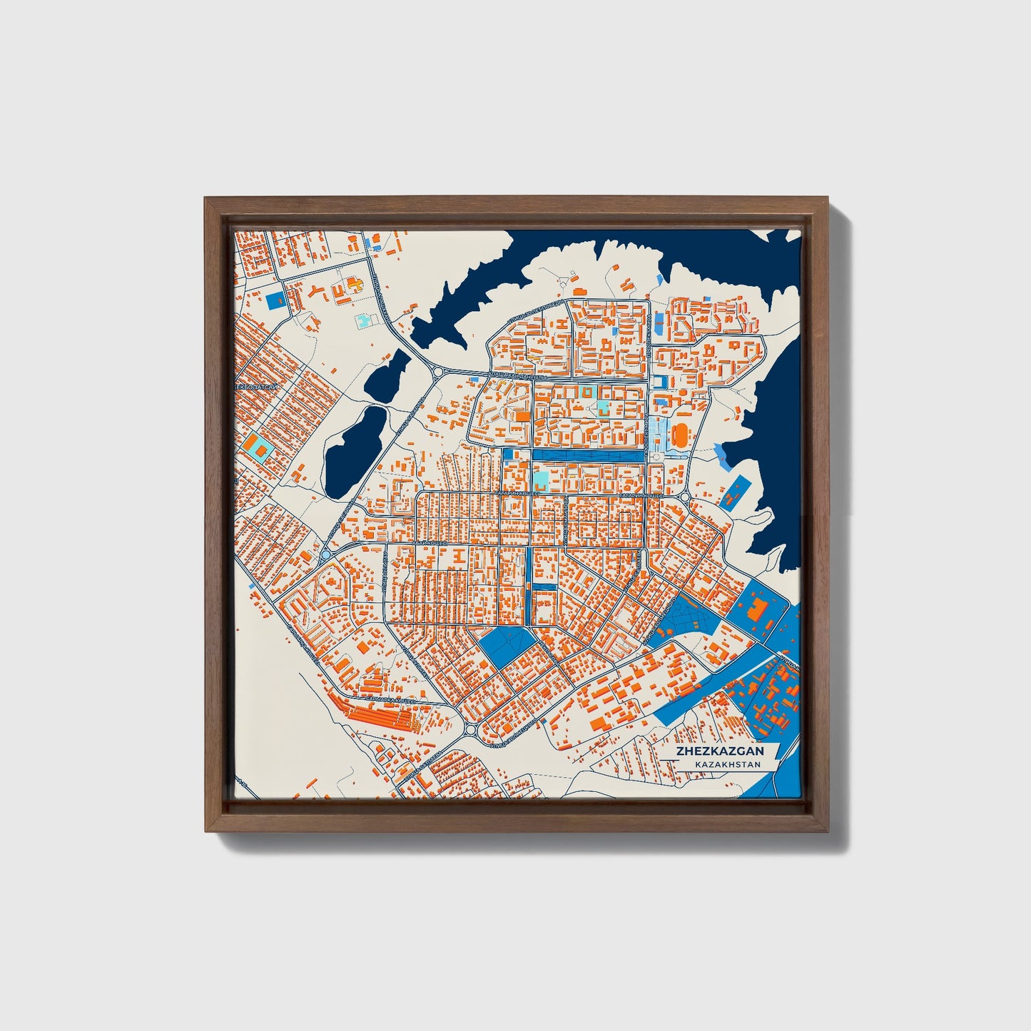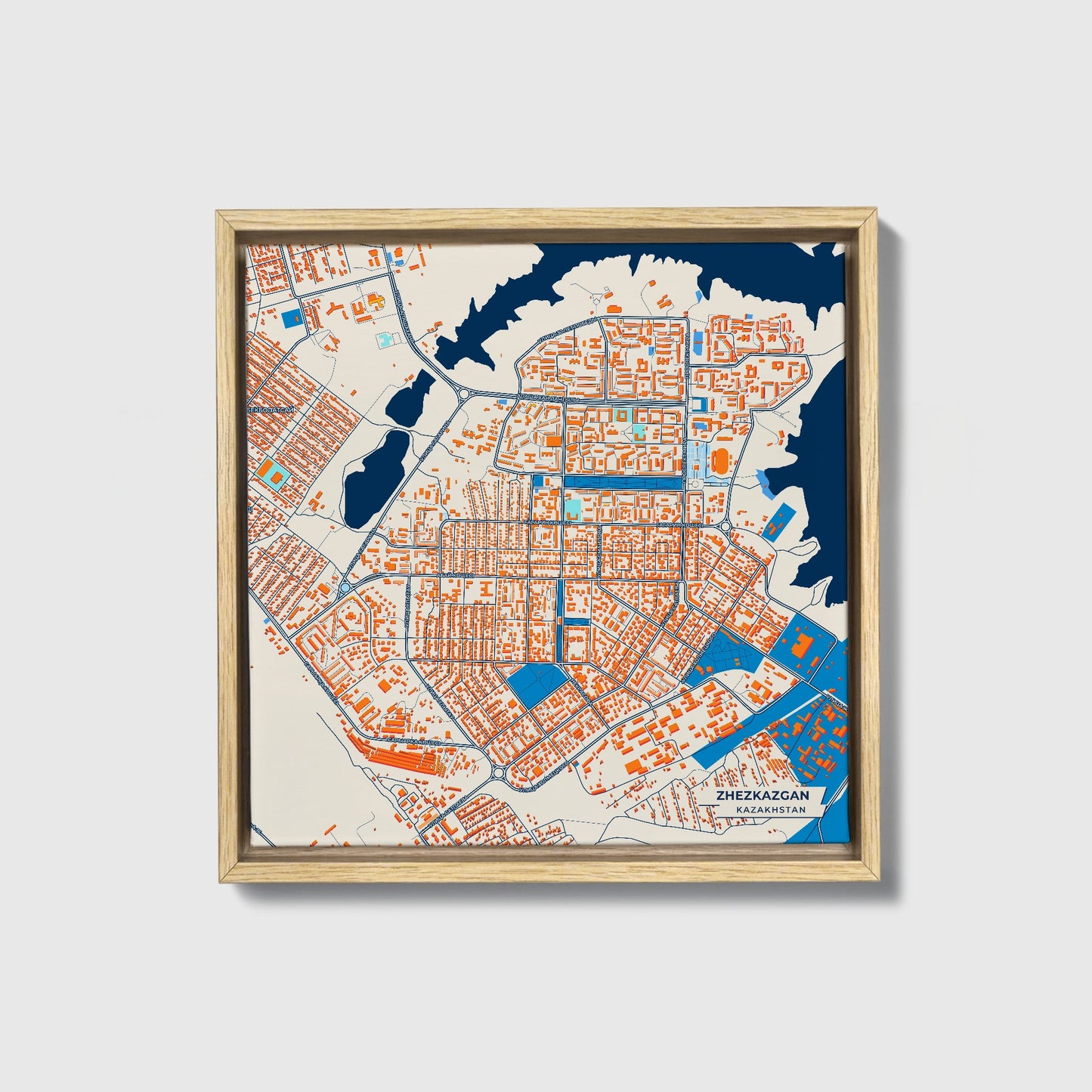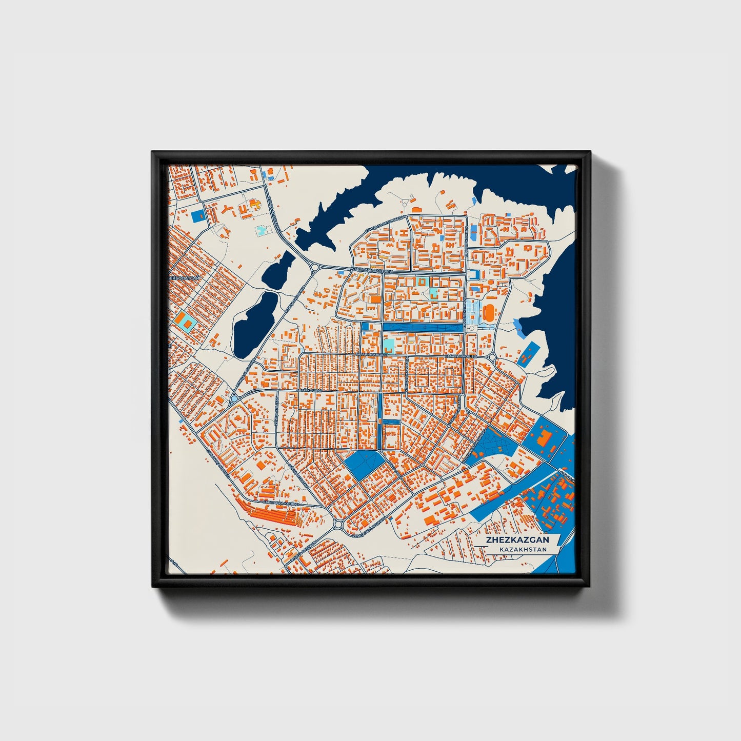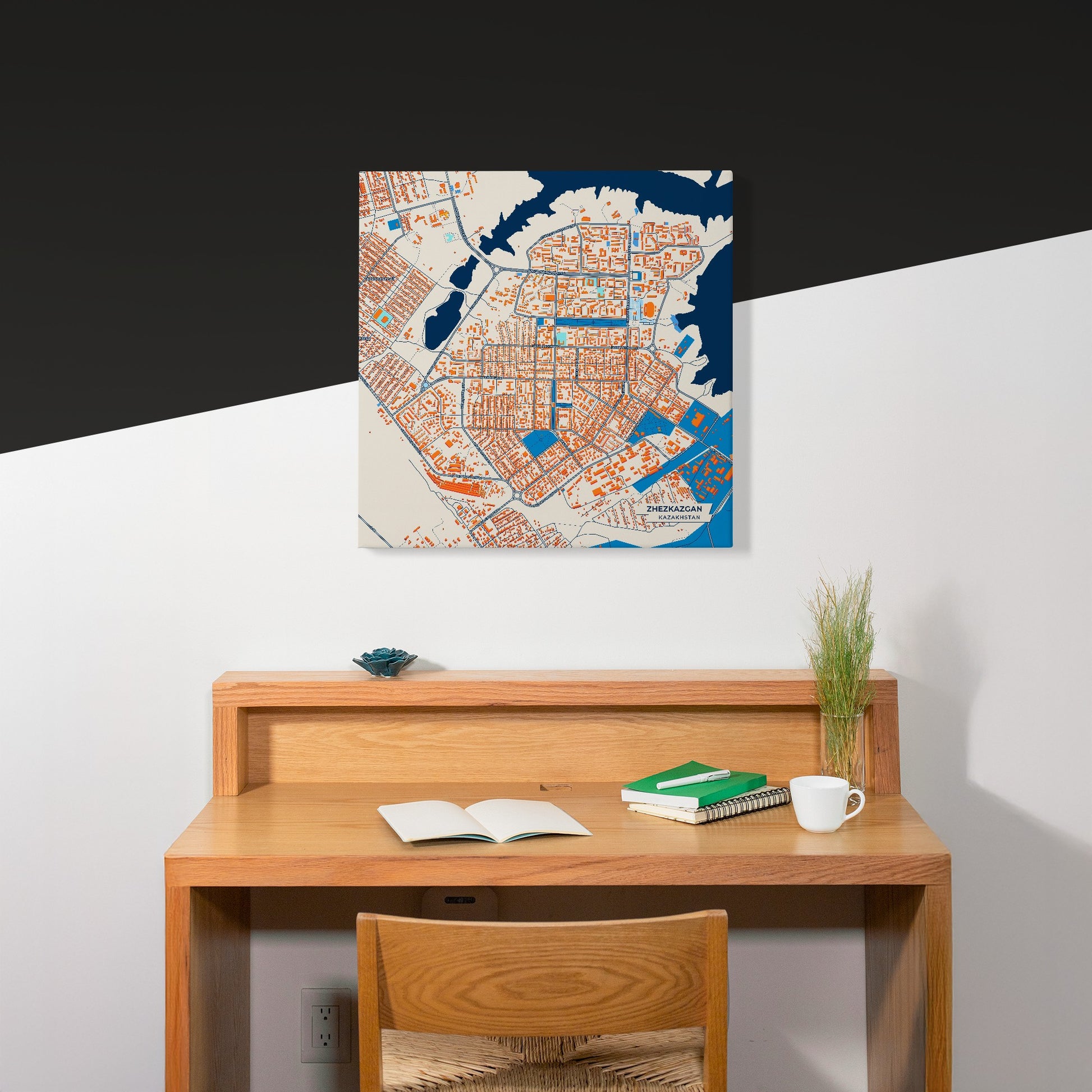 Premium canvas print of Zhezkazgan, Kazakhstan, featuring a bespoke map design in a bold, modern style. The artwork blends clean cartographic lines with vibrant color contrasts, highlighting streets, waterways, and neighborhoods in a visually striking way.