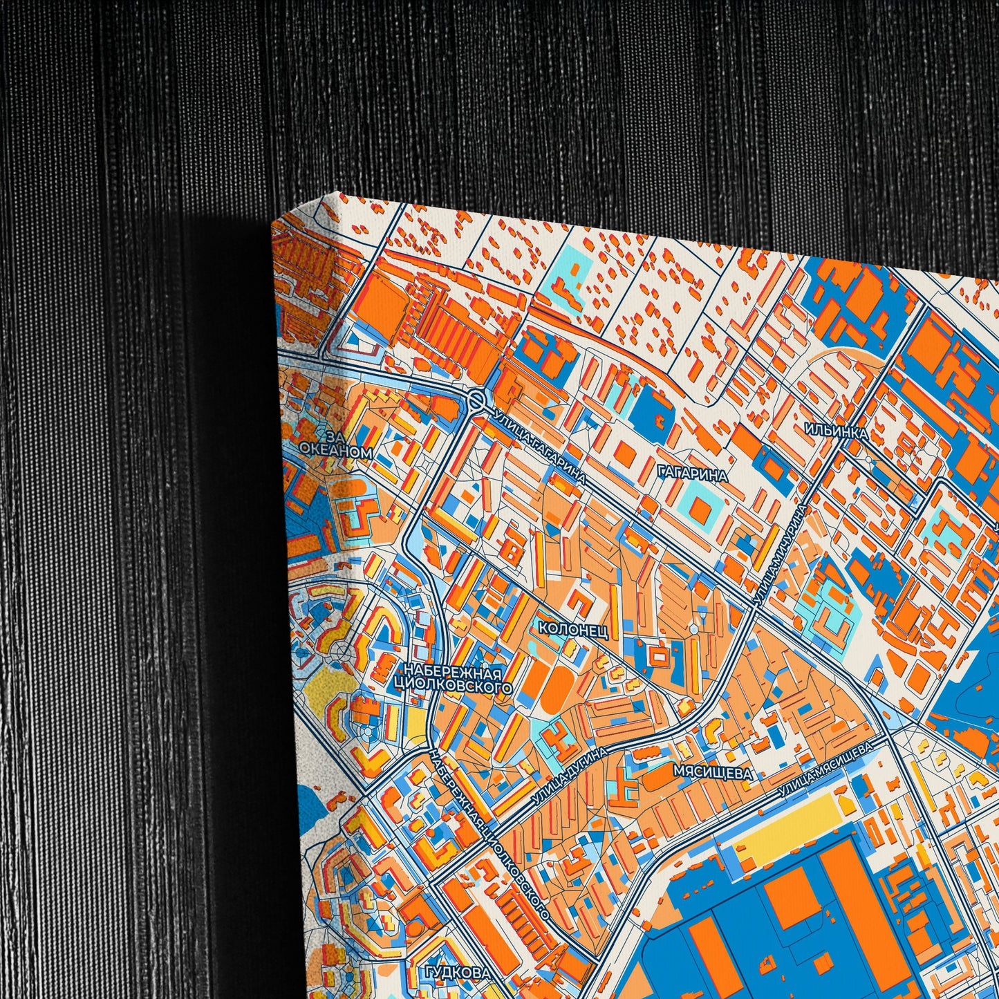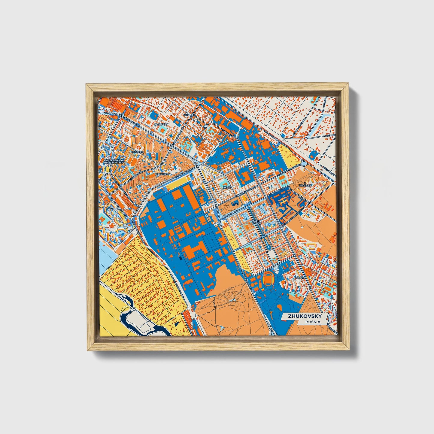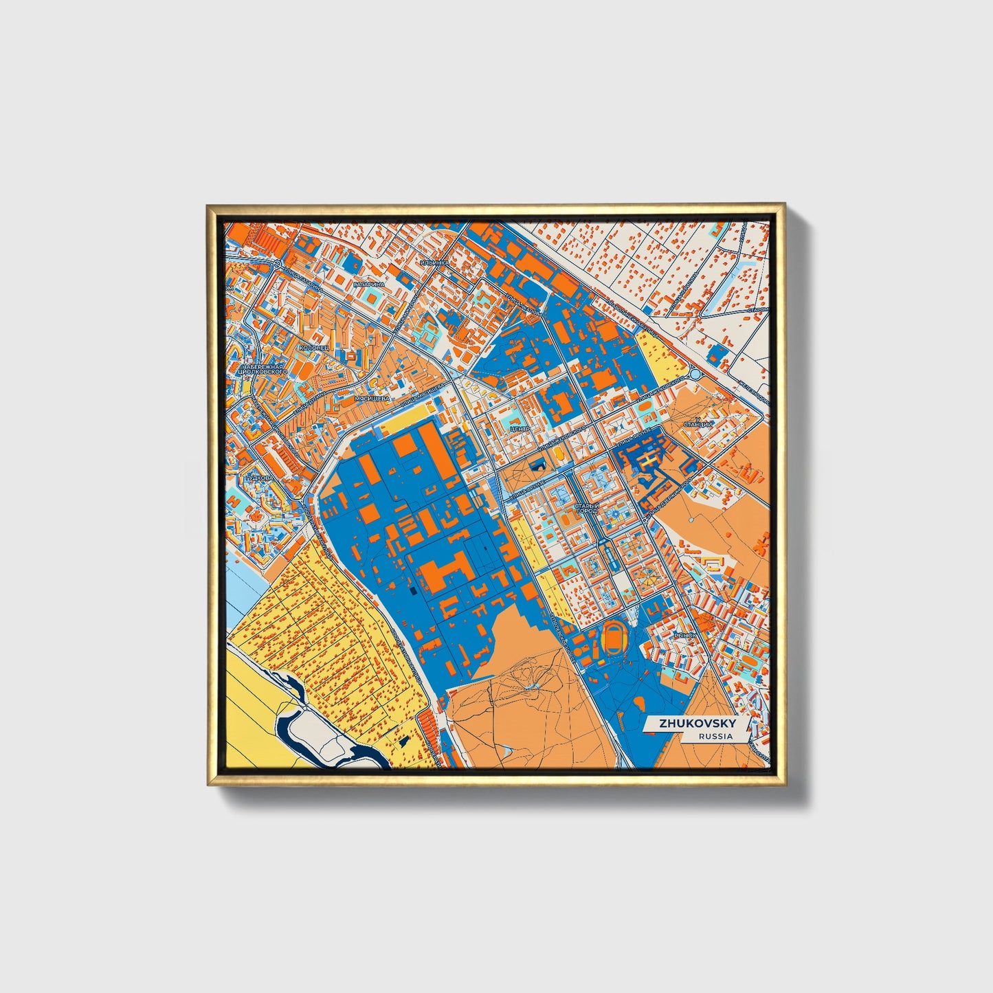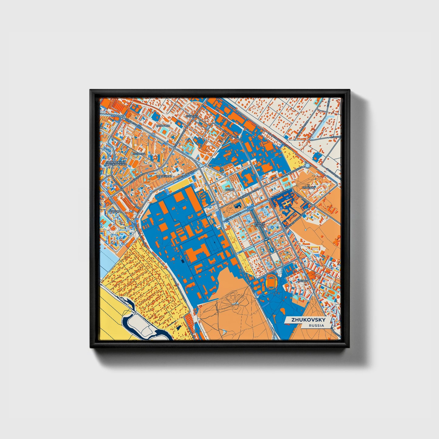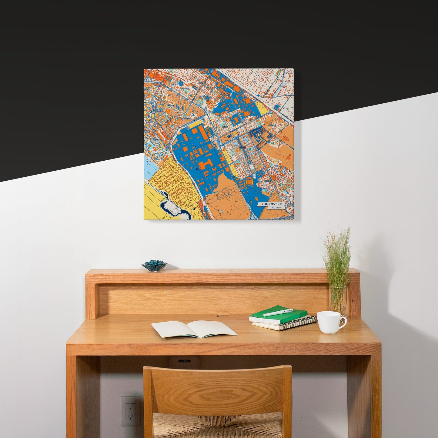 Premium canvas print of Zhukovsky, Russia, featuring a bespoke map design in a bold, modern style. The artwork blends clean cartographic lines with vibrant color contrasts, highlighting streets, waterways, and neighborhoods in a visually striking way.