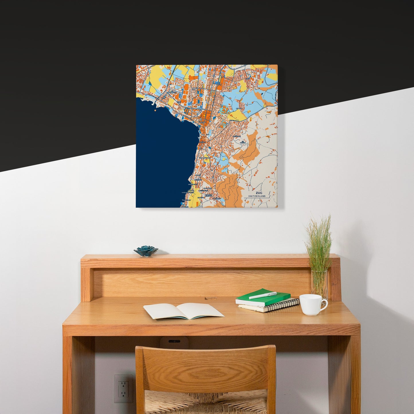 Premium canvas print of Zug, Switzerland, featuring a bespoke map design in a bold, modern style. The artwork blends clean cartographic lines with vibrant color contrasts, highlighting streets, waterways, and neighborhoods in a visually striking way.