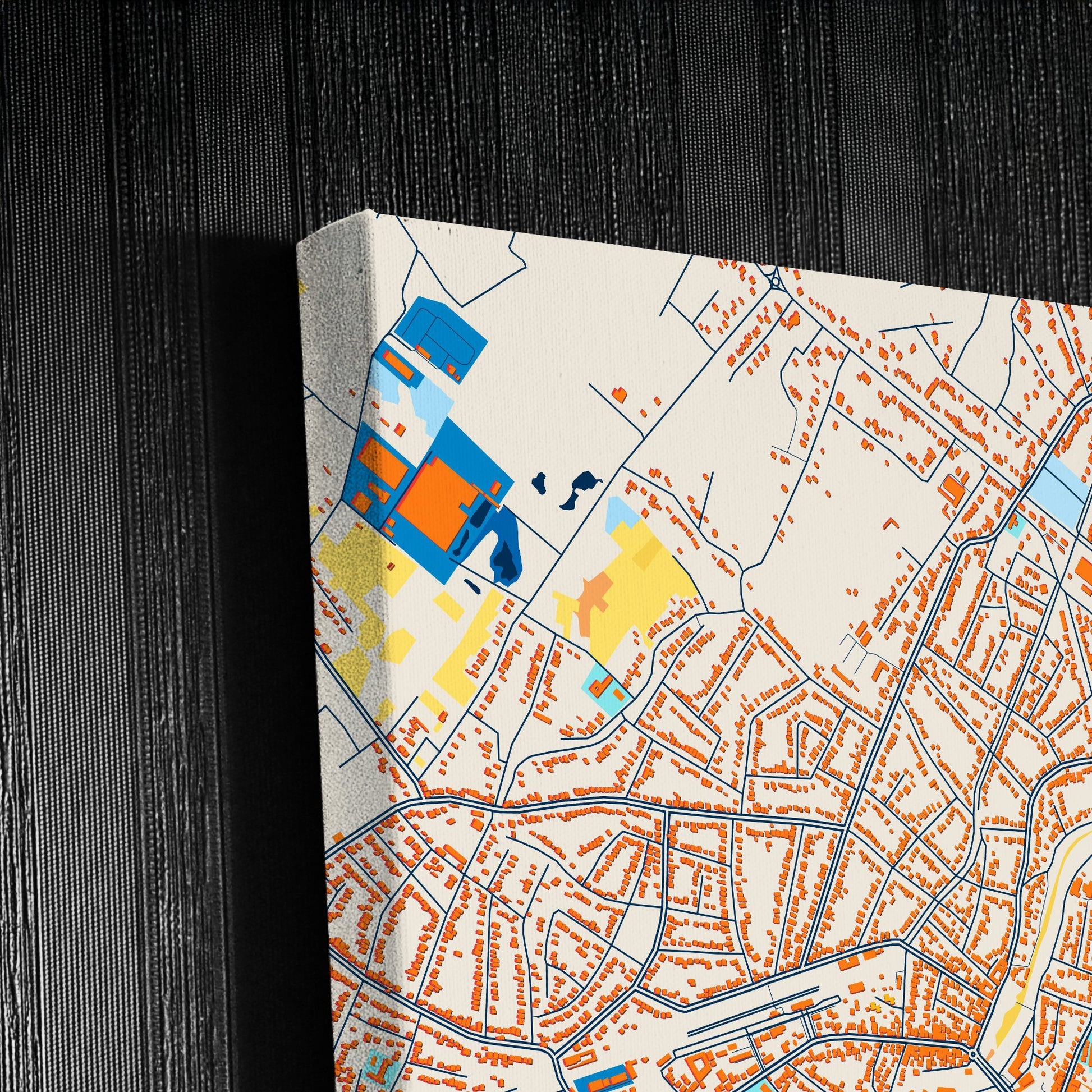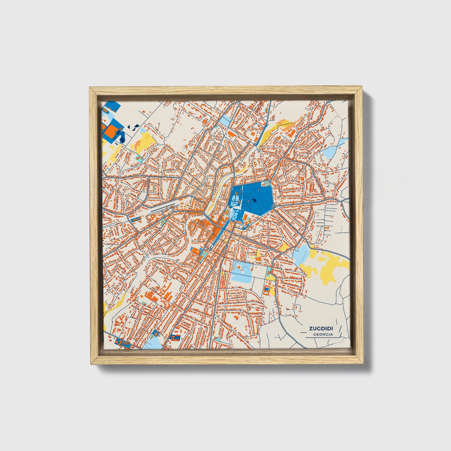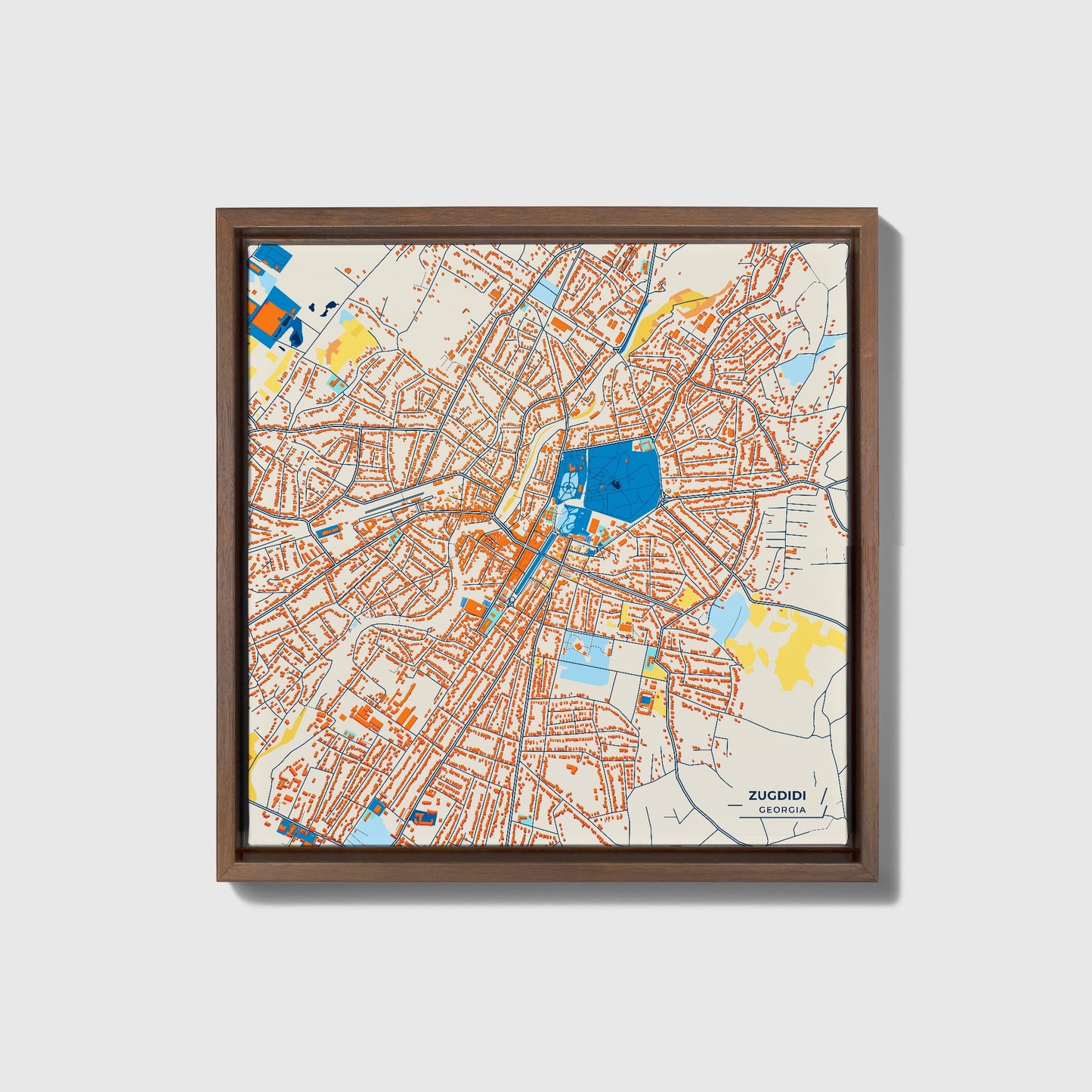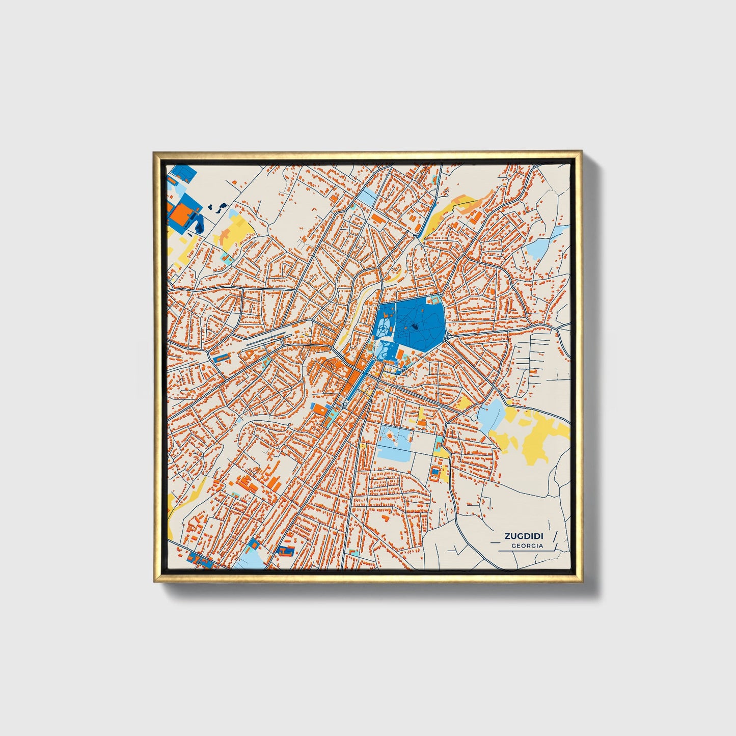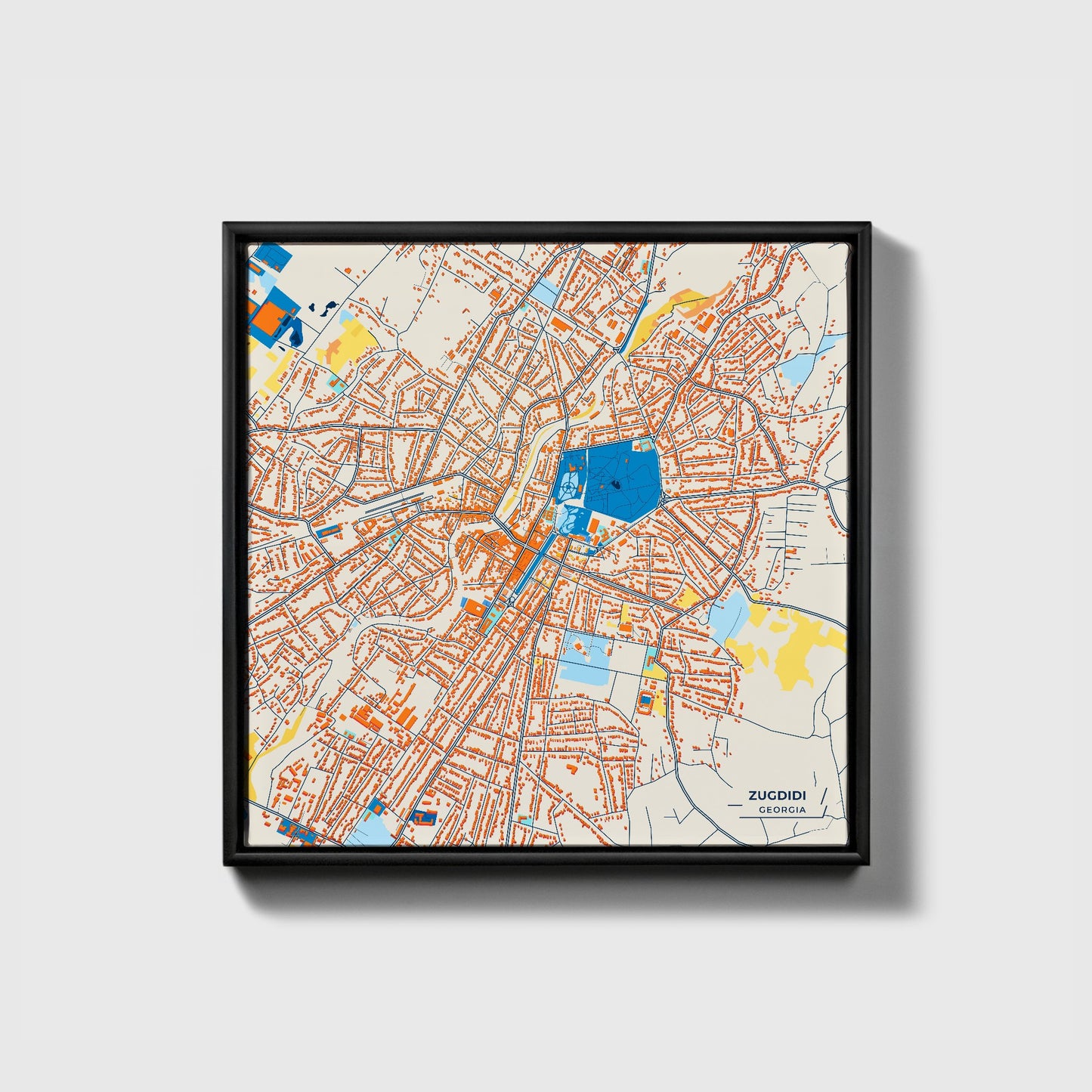 Premium canvas print of Zugdidi, Georgia, featuring a bespoke map design in a bold, modern style. The artwork blends clean cartographic lines with vibrant color contrasts, highlighting streets, waterways, and neighborhoods in a visually striking way.