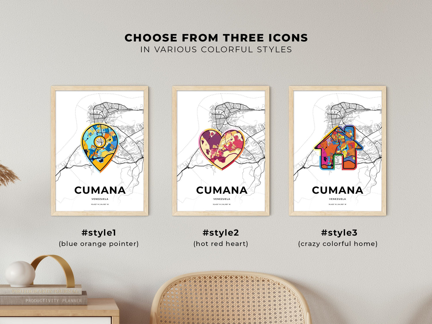 Choose from three icons to suit your needs. The rich detail and fresh colors of the map make it an eye-catcher in any room.