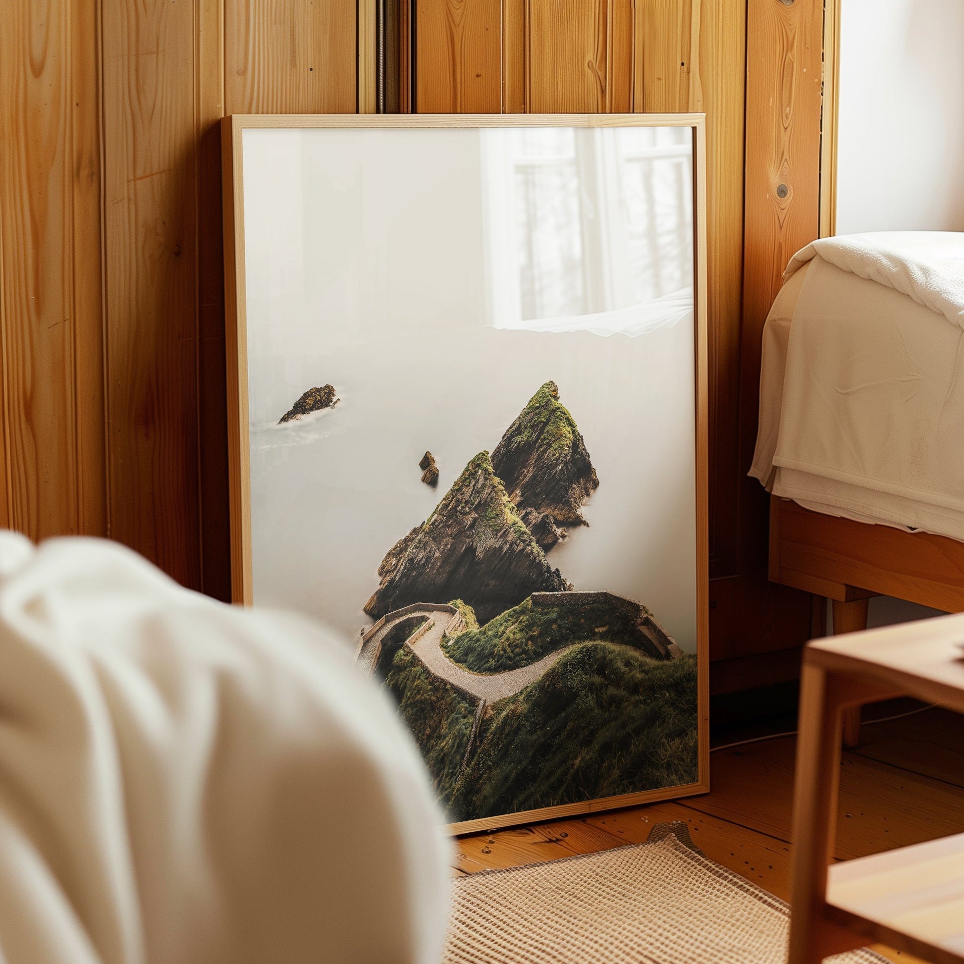 A fine art landscape print of Dunquin Pier on Ireland’s Dingle Peninsula, where the winding path meets rugged sea stacks. Captured in soft light on the Wild Atlantic Way, this Irish coastal scene brings drama and serenity to your space.