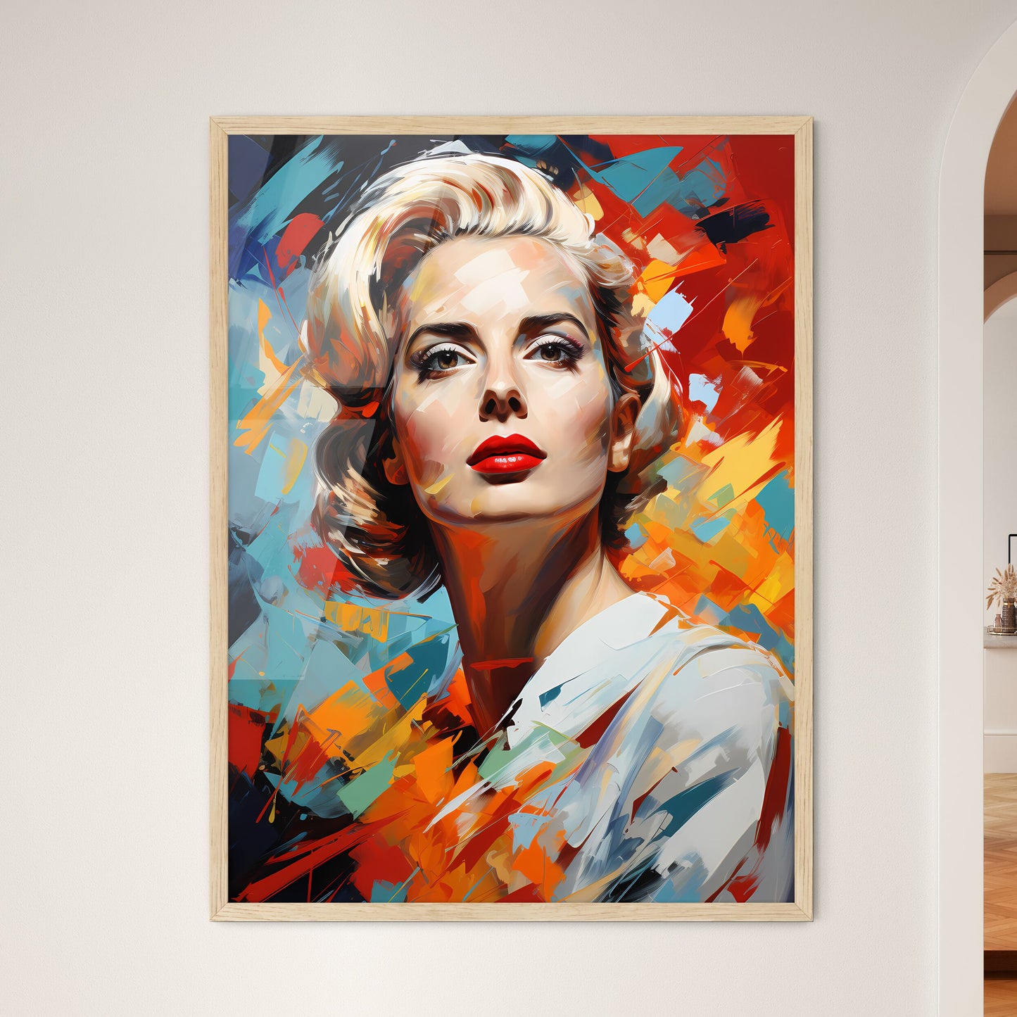 Eva Peron's portrait captures a woman exuding strength and power. Her flowing blonde hair frames a face adorned with red lipstick, symbolizing her fierce determination. Her piercing gaze reflects resilience, while her radiant smile hints at her charisma, making her an iconic figure in Argentine history.