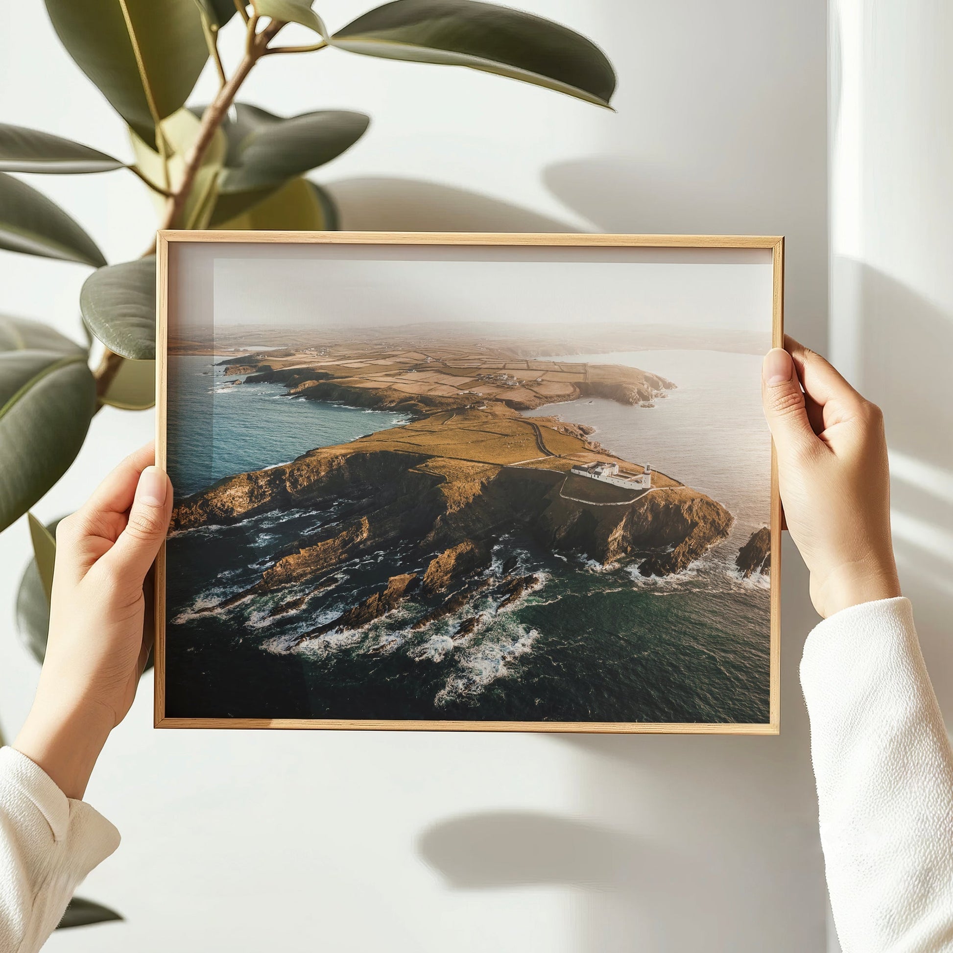 Bring the drama of Ireland’s Atlantic coast into your space with this aerial print of Galley Head Lighthouse. Captured at golden hour, the warm light highlights the rugged cliffs, rolling fields, and swirling sea foam below. A powerful reminder of Ireland’s raw coastal beauty, this fine art print makes a timeless gift or statement piece for any nature lover or travel enthusiast.