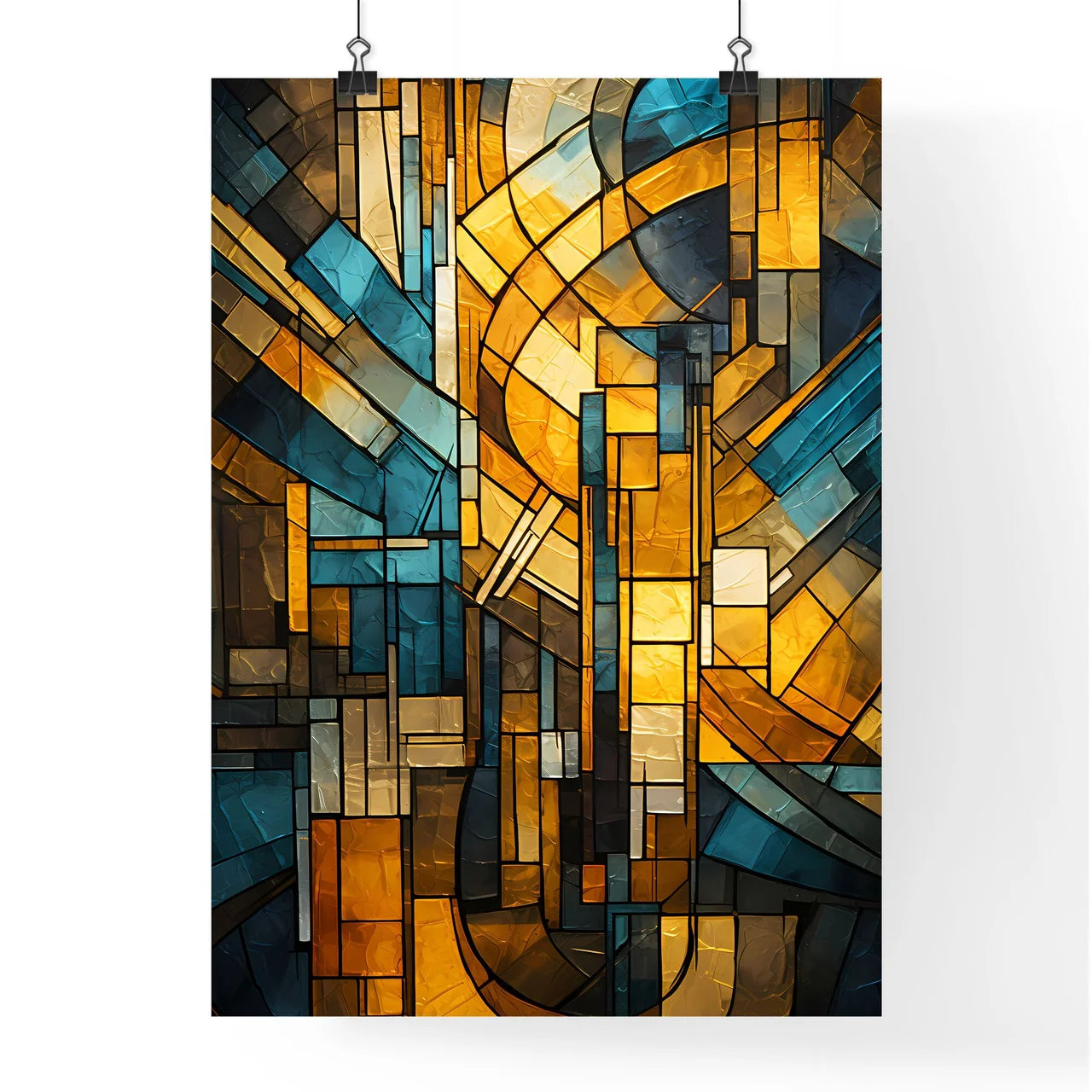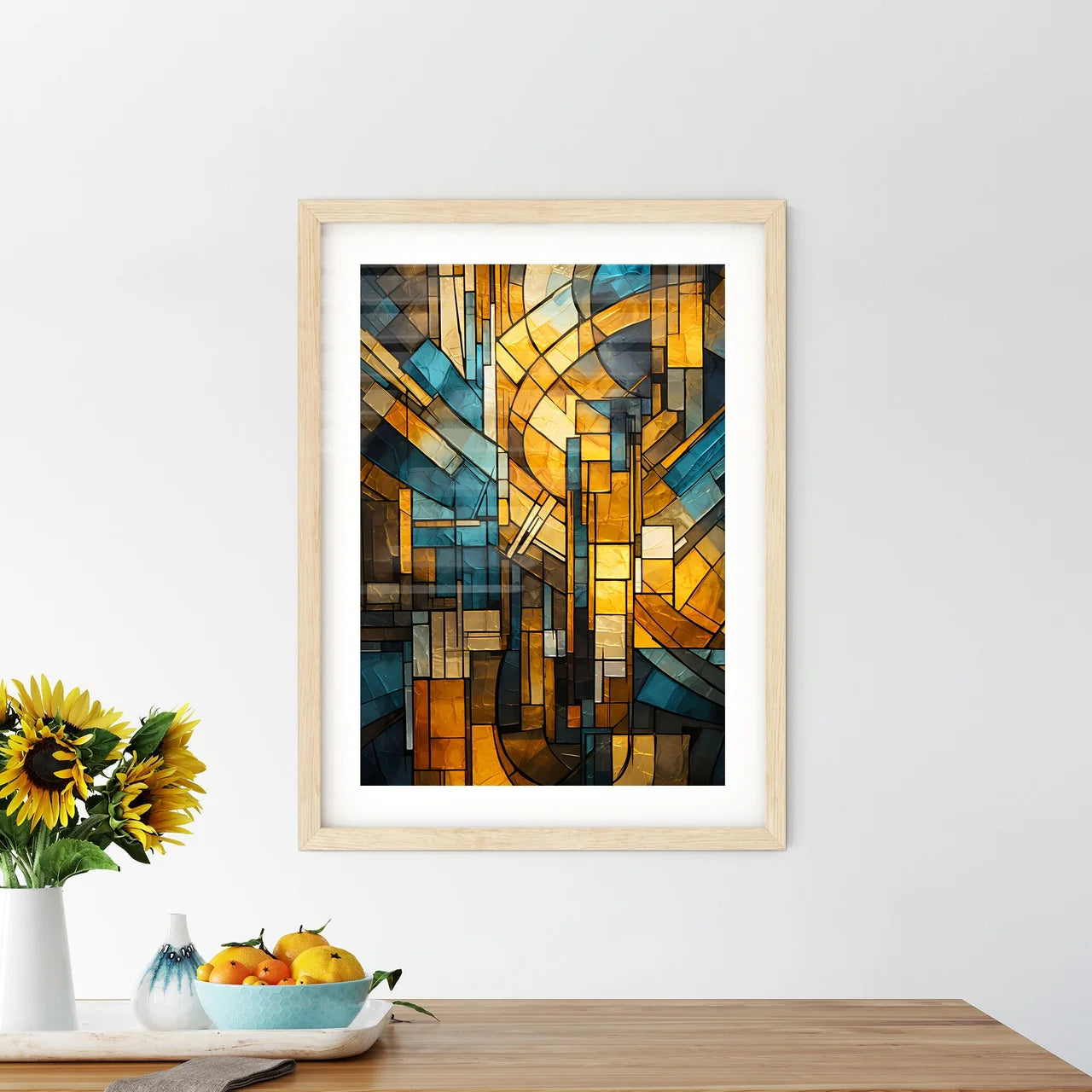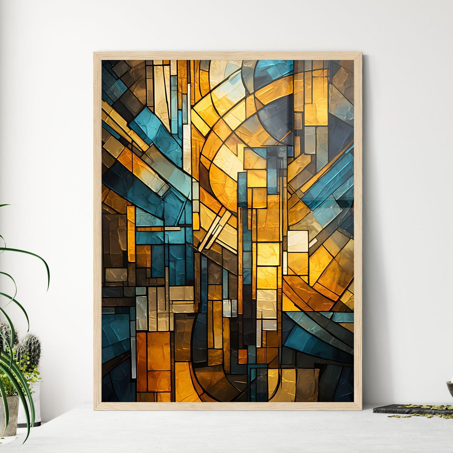 This Geometric Ornament In Art Deco Style In Old Gold is a beautiful reproduction of a stained glass window with different colors. The poster is a vibrant painting with a focus on the art aspect, making it a perfect piece for any interior design. Whether you're looking for a gift or something to add to your own home, this poster is sure to please. The artist has captured the beauty of the original stained glass window in this stunning print, which is sure to add a touch of elegance to any room.