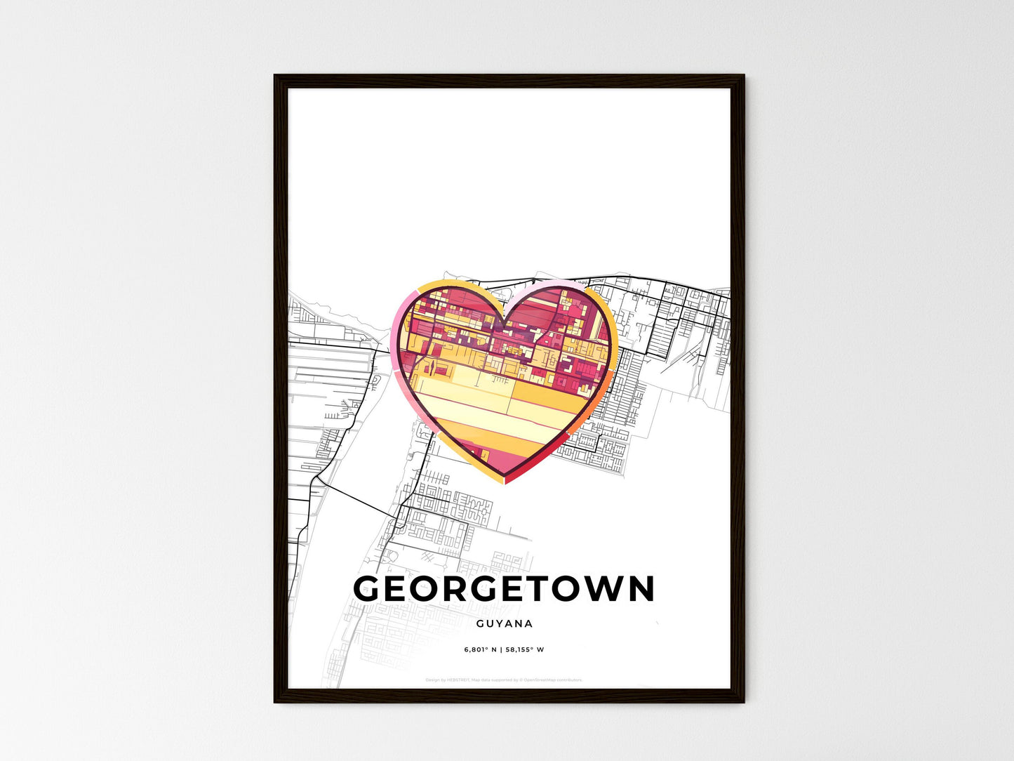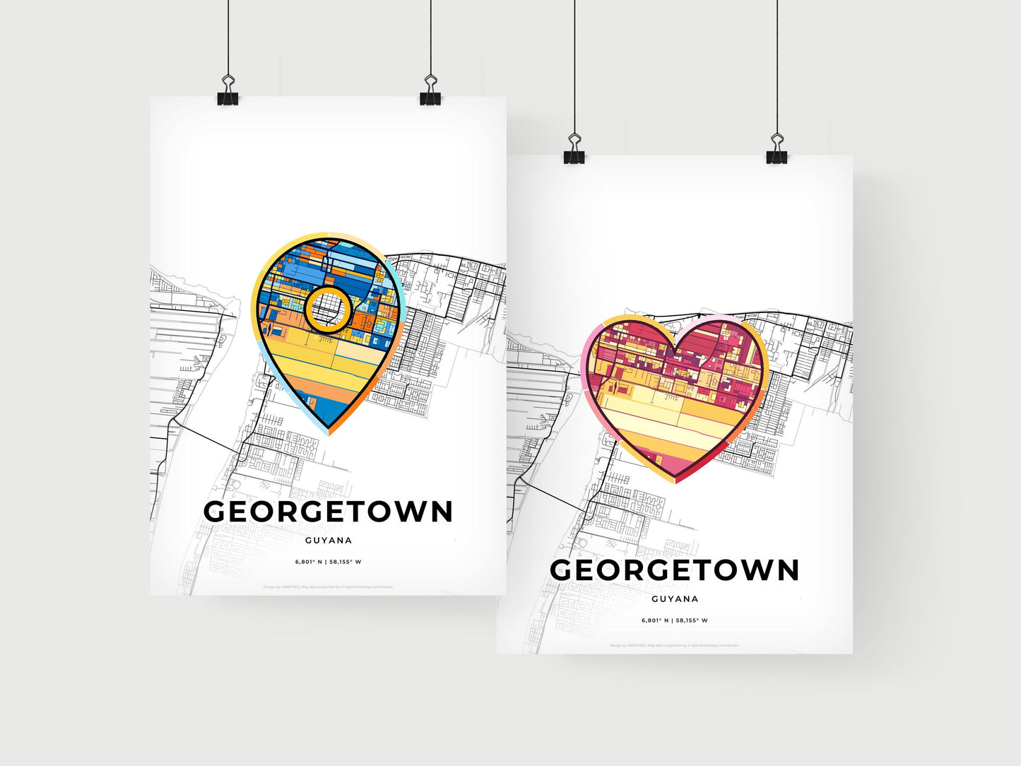Step into the vibrant heart of Georgetown, Guyana, with this captivating minimal art map. This abstract illustration captures the essence of this historic and bustling city, known as the birthplace of the Caribbean Community (CARICOM). Immerse yourself in the city's rich culture, vibrant street life, and stunning architecture, all portrayed through a unique artistic lens. This colorful icon is an ideal gift for couples or anyone with a special connection to Georgetown, serving as both a cherished keepsake and a unique piece of home décor. Let the art and the city's spirit inspire your creativity and add a touch of Guyana's charm to your living space.