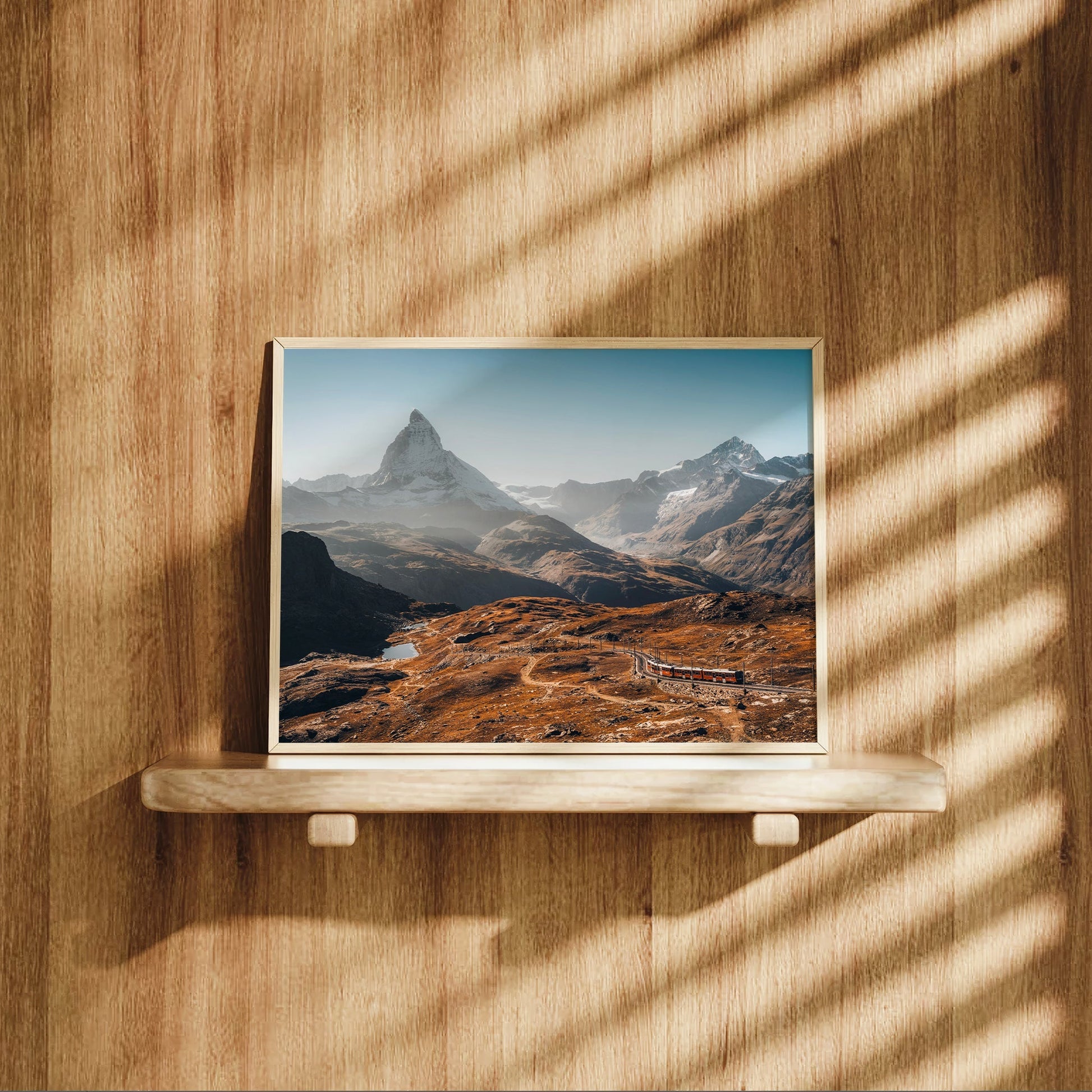 The Gornergrat train winding through the Swiss Alps, with the Matterhorn in the morning light.