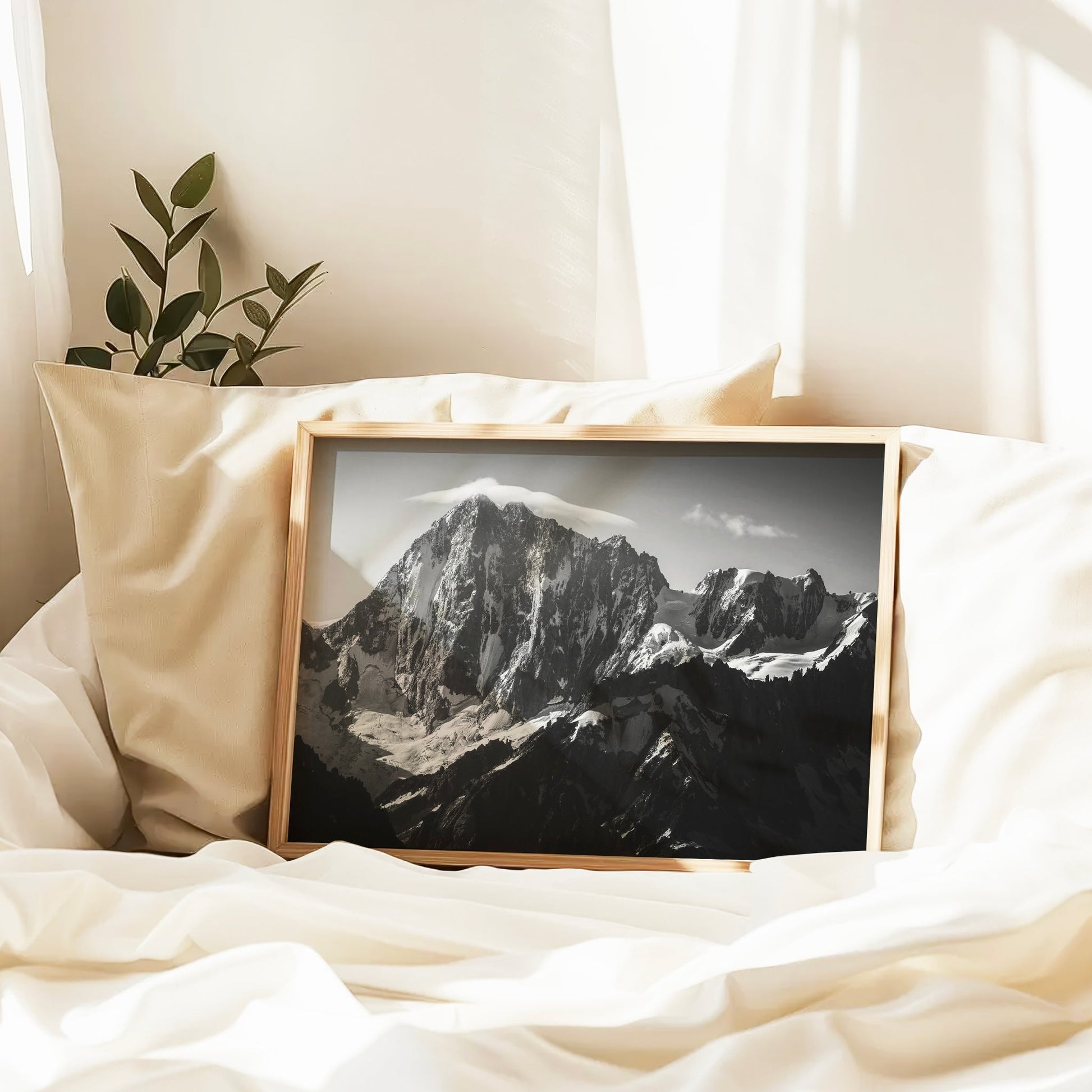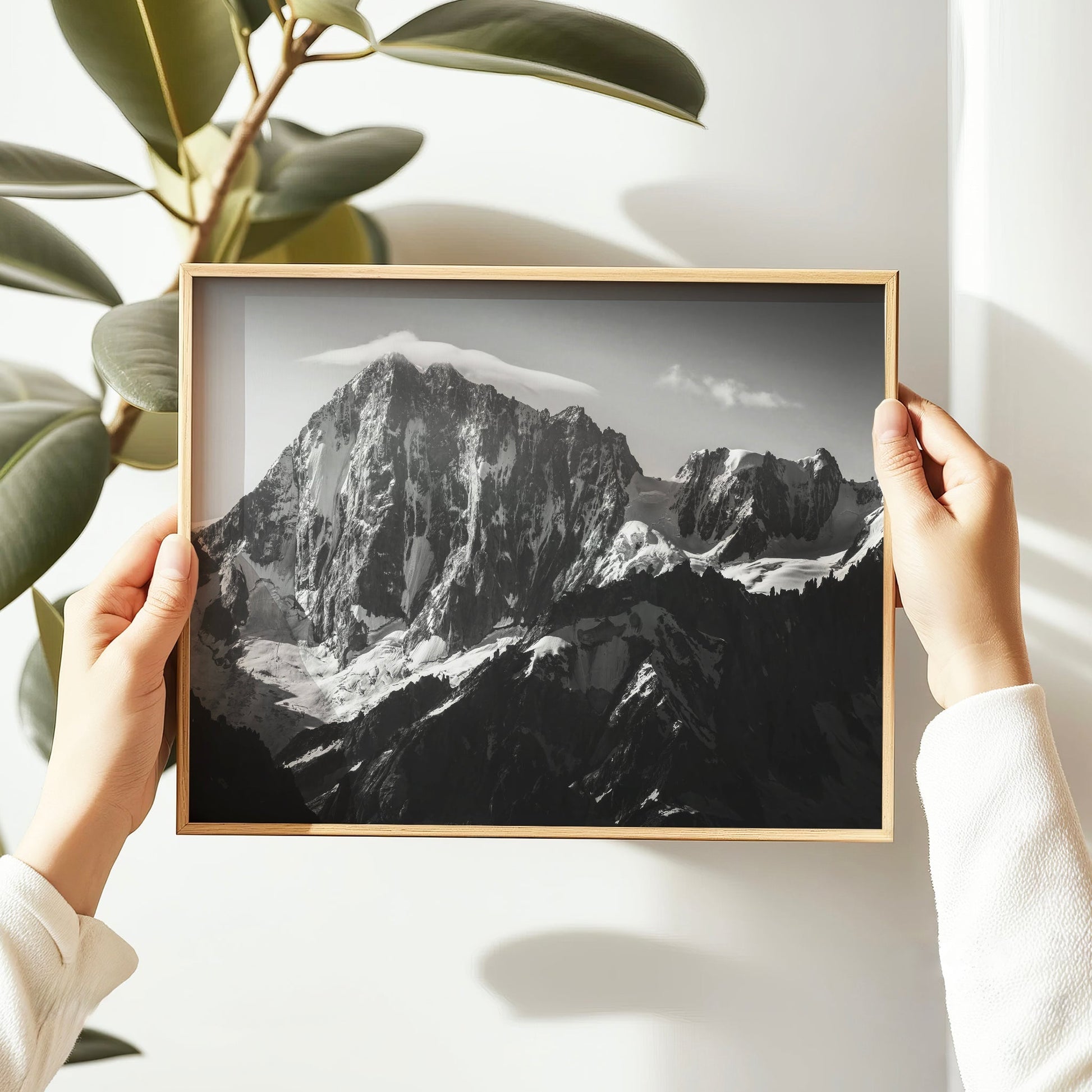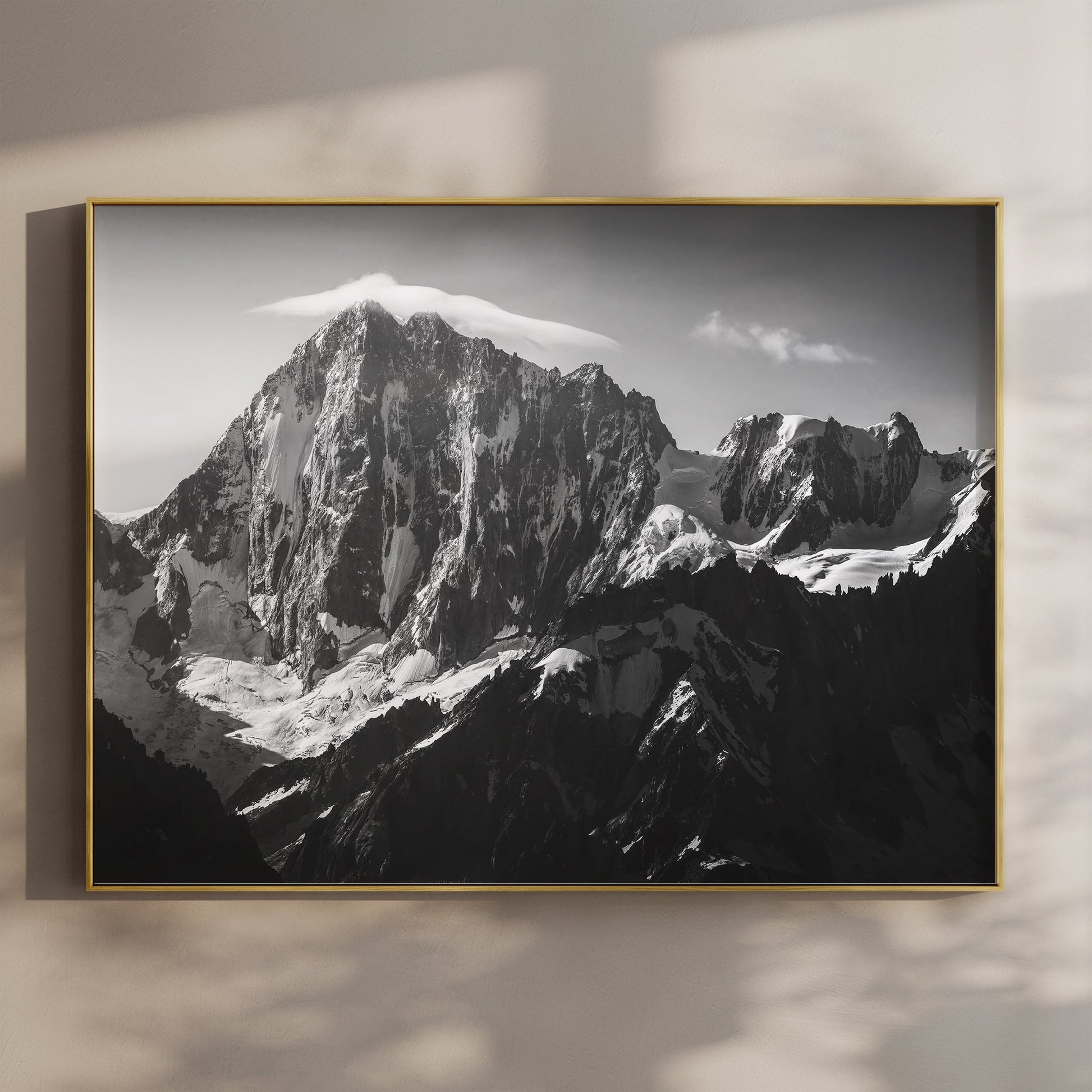 A striking black and white composition of the Grandes Jorasses, where jagged peaks rise into a sky of deep contrast. A timeless, dramatic Alpine scene.