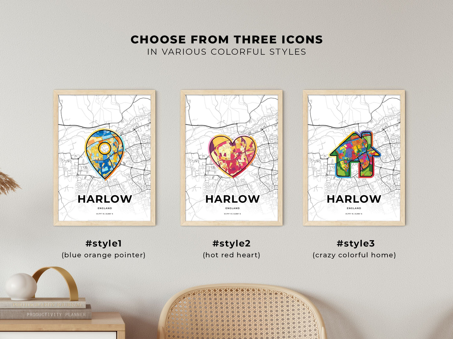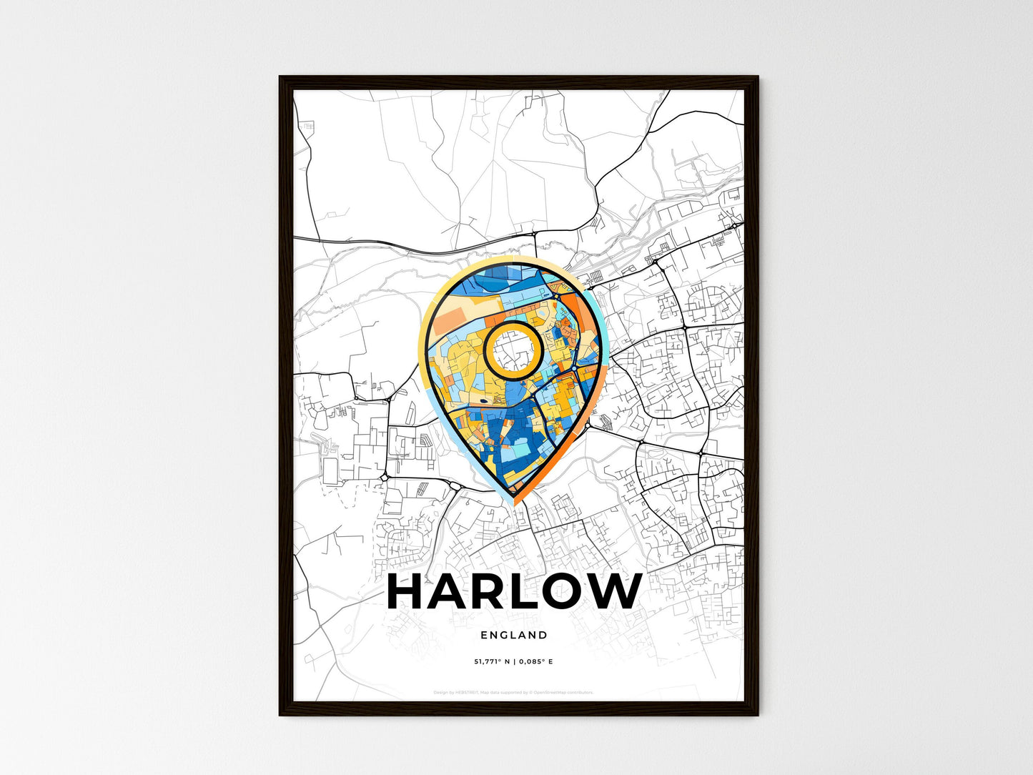 Our map of Harlow England shows minimalist designed roads, railroads and waterways combined with colorful urban areas within one icon.