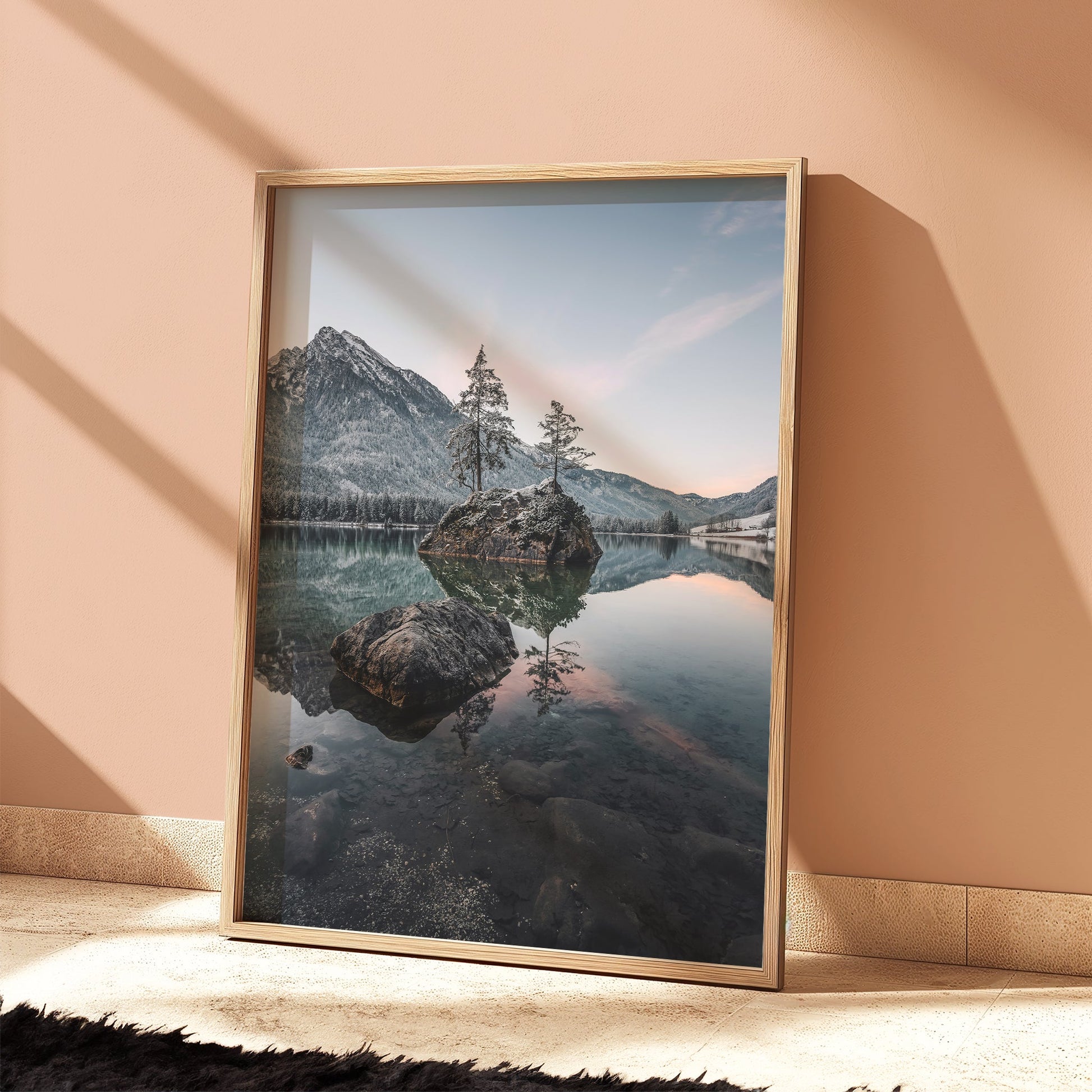 A fine art print of Hintersee lake in the Bavarian Alps, Germany. Captured during a still morning with soft light, mist, and glassy reflections, this piece brings the serenity of the mountains into your space. Ideal for lovers of alpine landscapes and peaceful scenery.