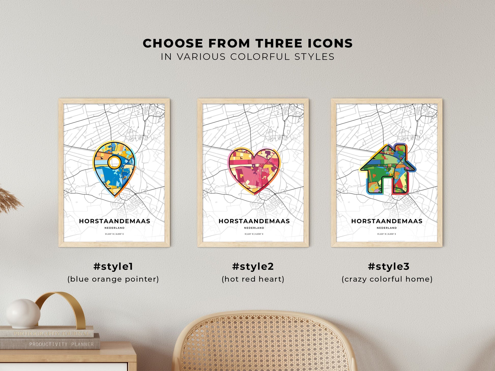Choose from three icons to suit your needs. The rich detail and fresh colors of the map make it an eye-catcher in any room.