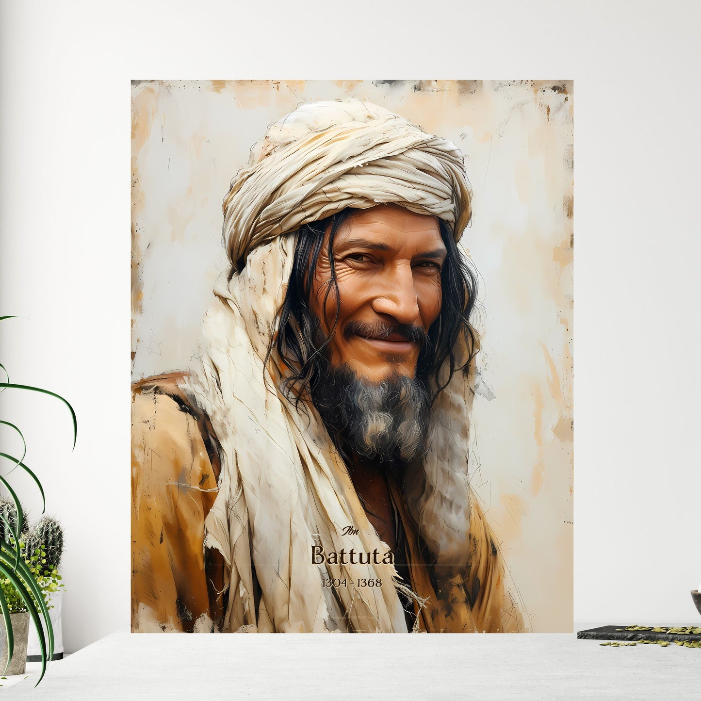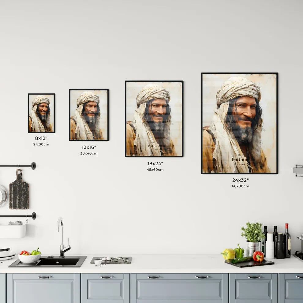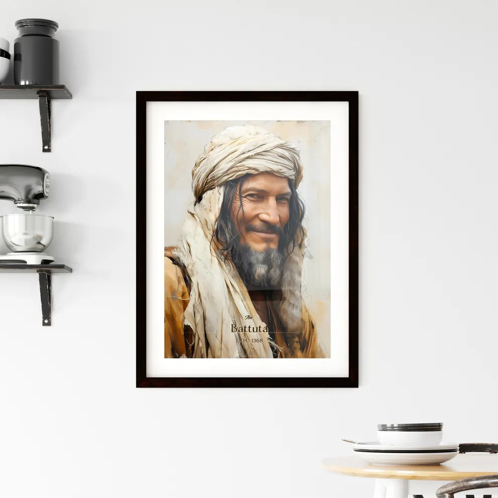 Discover the captivating portrait of Ibn Battuta, the legendary 14th-century explorer and adventurer from Tangier, Morocco. Renowned for his extensive travels spanning over 75,000 miles, Ibn Battuta's journeys left an indelible mark on history. Through his travels, he encountered diverse cultures, sparking a deep appreciation for the art and intrigue of the world. With a keen eye for detail, this poster captures Ibn Battuta's enigmatic presence, featuring his beard, turban, and contemplative gaze. Whether as a thoughtful gift or a captivating addition to your home décor, this print embodies the spirit of exploration and encourages a deeper connection with the allure of distant lands and ancient traditions.