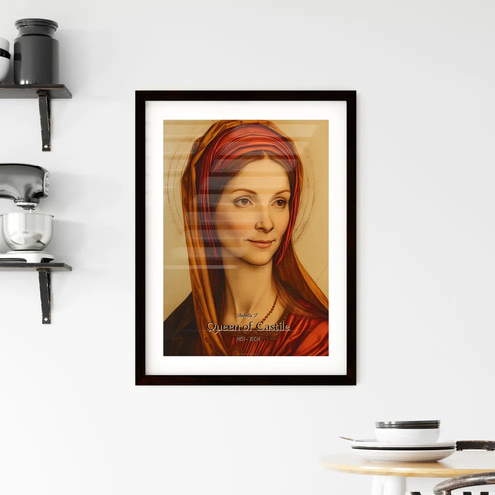 This captivating print depicts Isabella I, the esteemed Queen of Castile who reigned from 1451 to 1504. With a vibrant red head wrap that frames her regal features, this artwork captures the essence of a powerful monarch. Isabella's unwavering determination and diplomatic skills played a pivotal role in shaping the destiny of Spain. As a patron of the arts and sciences, her reign witnessed a flowering of creativity and intellectual pursuits. This print is a testament to Isabella's legacy, inviting you to appreciate both the artistic beauty and historical significance of this extraordinary woman. Its vibrant colors and meticulous attention to detail make it a stunning addition to any home décor or a thoughtful gift for those captivated by the rich tapestry of history and art.