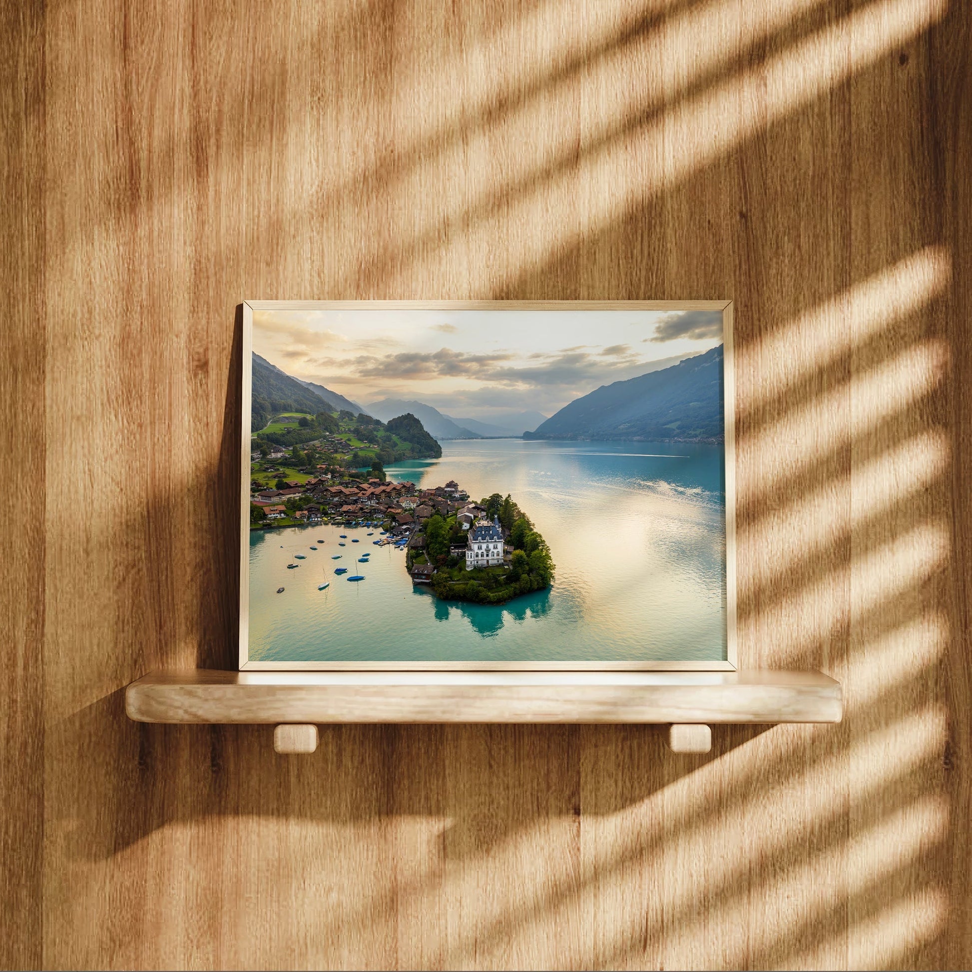 A peaceful view of Iseltwald on the shores of Lake Brienz, framed by green hills and calm waters.