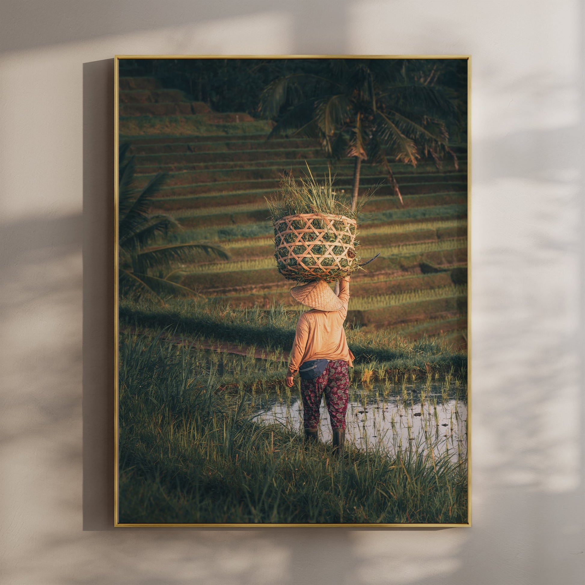 Capture the timeless beauty of Bali’s UNESCO-listed Jatiluwih Rice Terraces with this fine art wall print. Featuring a farmer carrying a basket through the lush green fields, this photograph reflects the harmony between people and landscape that defines rural Bali.