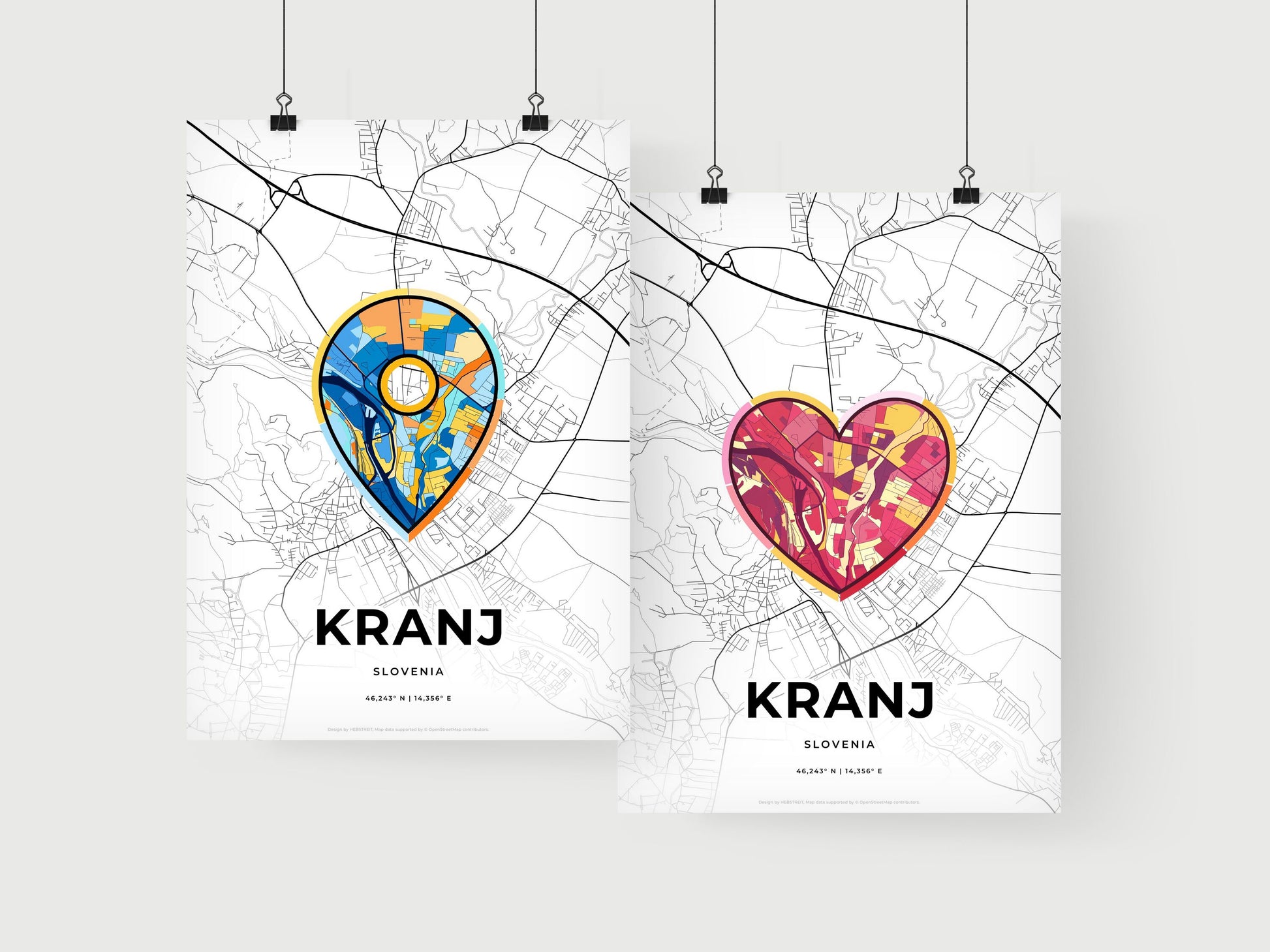 Our map of Kranj Slovenia shows minimalist designed roads, railroads and waterways combined with colorful urban areas within one icon.