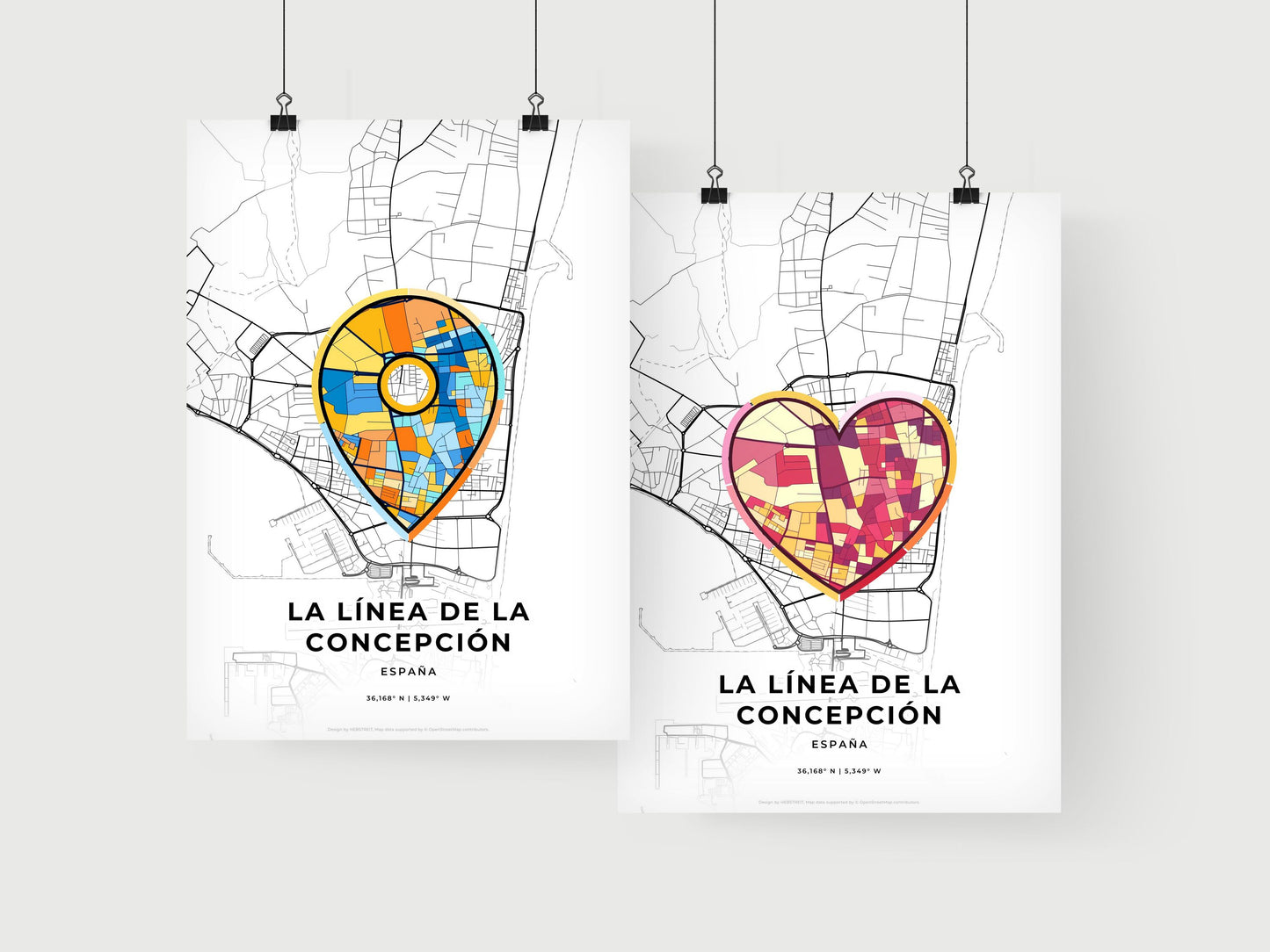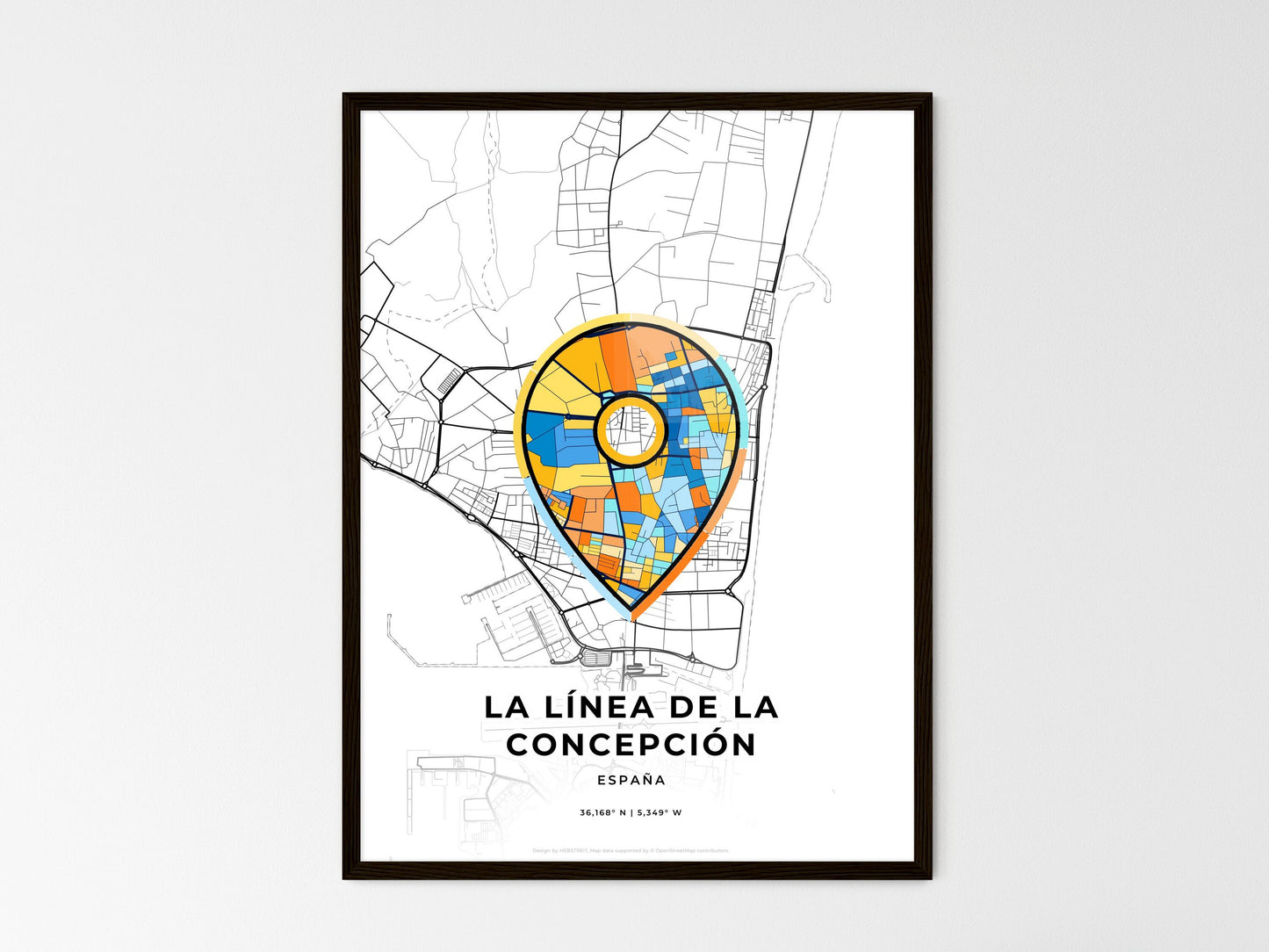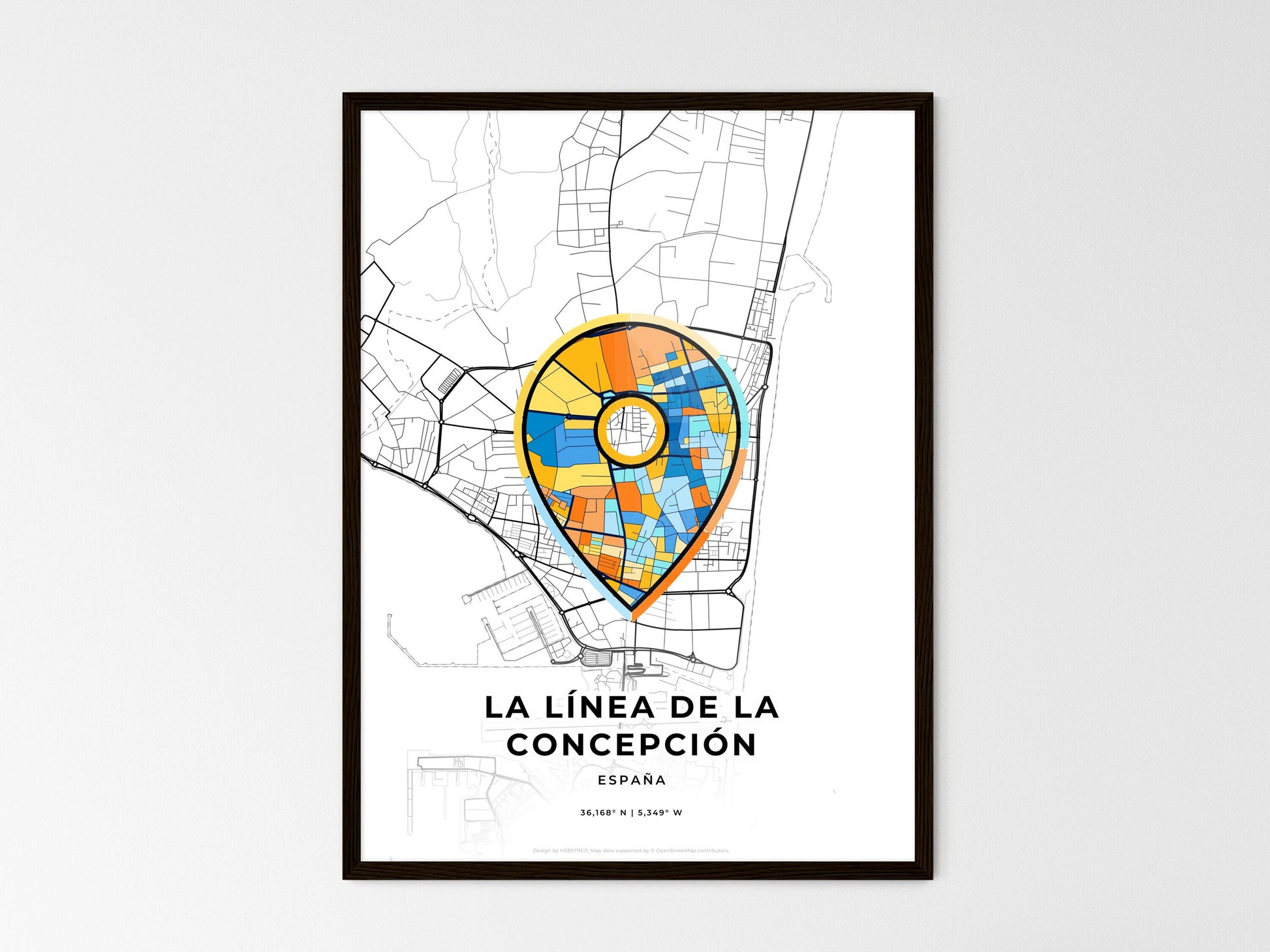 Escape to the vibrant coastal town of La Línea de la Concepción, Spain, where history, culture, and art intertwine. This abstract map print captures the essence of the city with its colorful icon, symbolizing its rich heritage and maritime charm. Situated on the Strait of Gibraltar, La Línea de la Concepción has witnessed countless historical events and is a gateway to both Europe and Africa. Immerse yourself in its bustling streets, explore its stunning beaches, and uncover the hidden gems that make this city a captivating destination for art enthusiasts and travelers alike.