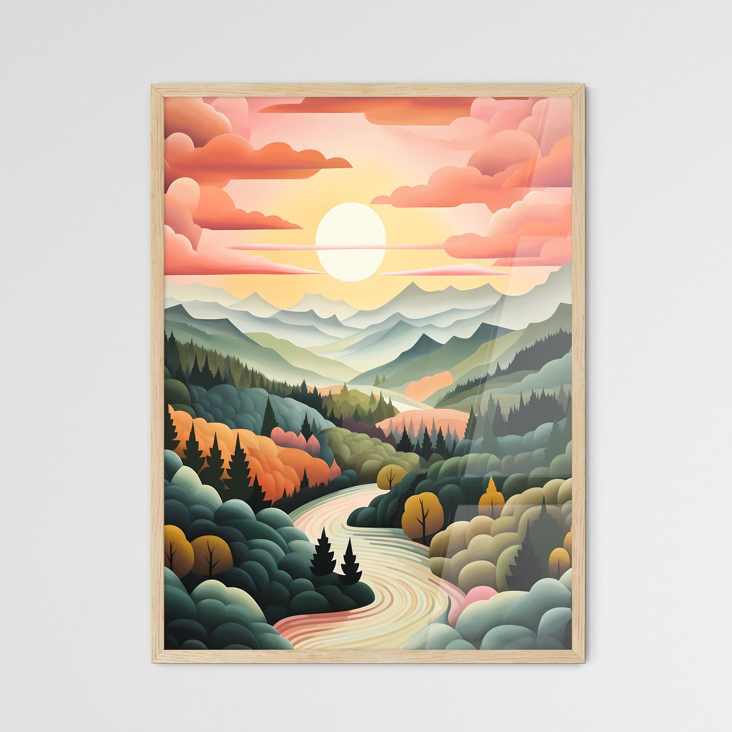 Immerse yourself in the serene beauty of this captivating landscape print. This vibrant artwork captures the essence of nature's tranquility with its lush greenery, meandering river, and towering trees. The print's artistic flair invites contemplation and transforms any space into a harmonious haven. Whether you're seeking a thoughtful gift or a touch of natural splendor for your own abode, this landscape print is designed to elevate your interiors and inspire a sense of serenity. Order now and bring the breathtaking beauty of nature into your life.