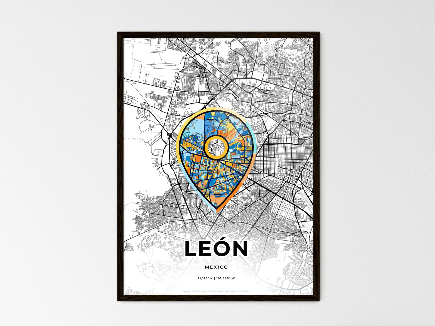 Immerse yourself in the vibrant heart of León, Mexico, with this captivating minimal art map. The city, where it all began, unfolds before your eyes as an abstract tapestry of vibrant colors and sharp lines. The iconic architecture and landmarks dance upon the canvas, leaving an indelible mark on your memory. Whether as a cherished gift or a statement piece in your own abode, this print invites you to explore the rich tapestry of León, Mexico, where history, culture, and art intertwine to create a captivating destination.