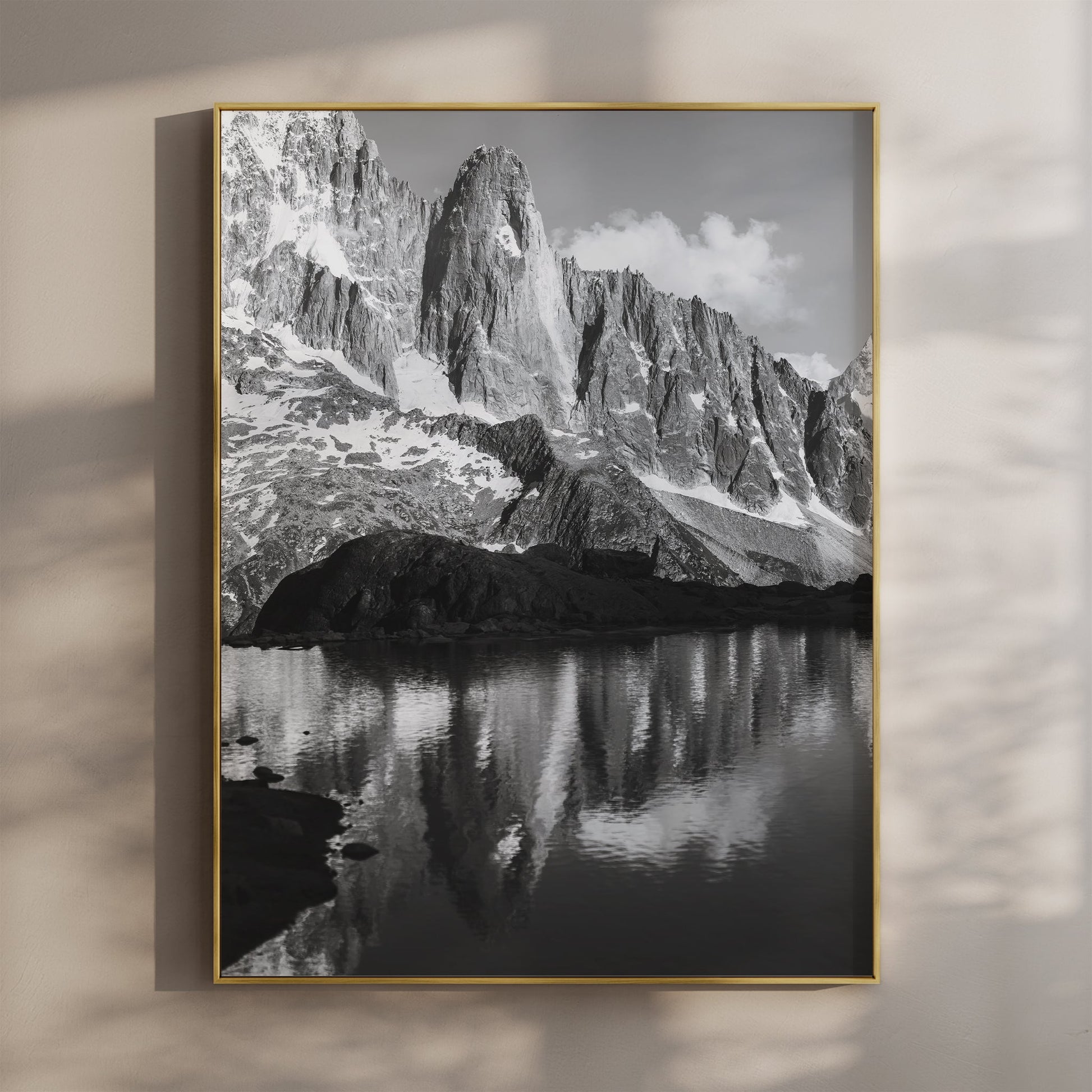 Capture the timeless beauty of Les Drus mountain with this elegant black-and-white art print. Featuring dramatic peaks mirrored in a tranquil lake, this fine art piece is perfect for adding a touch of Chamonix's iconic landscape to your decor. Ideal for modern and minimalist spaces.