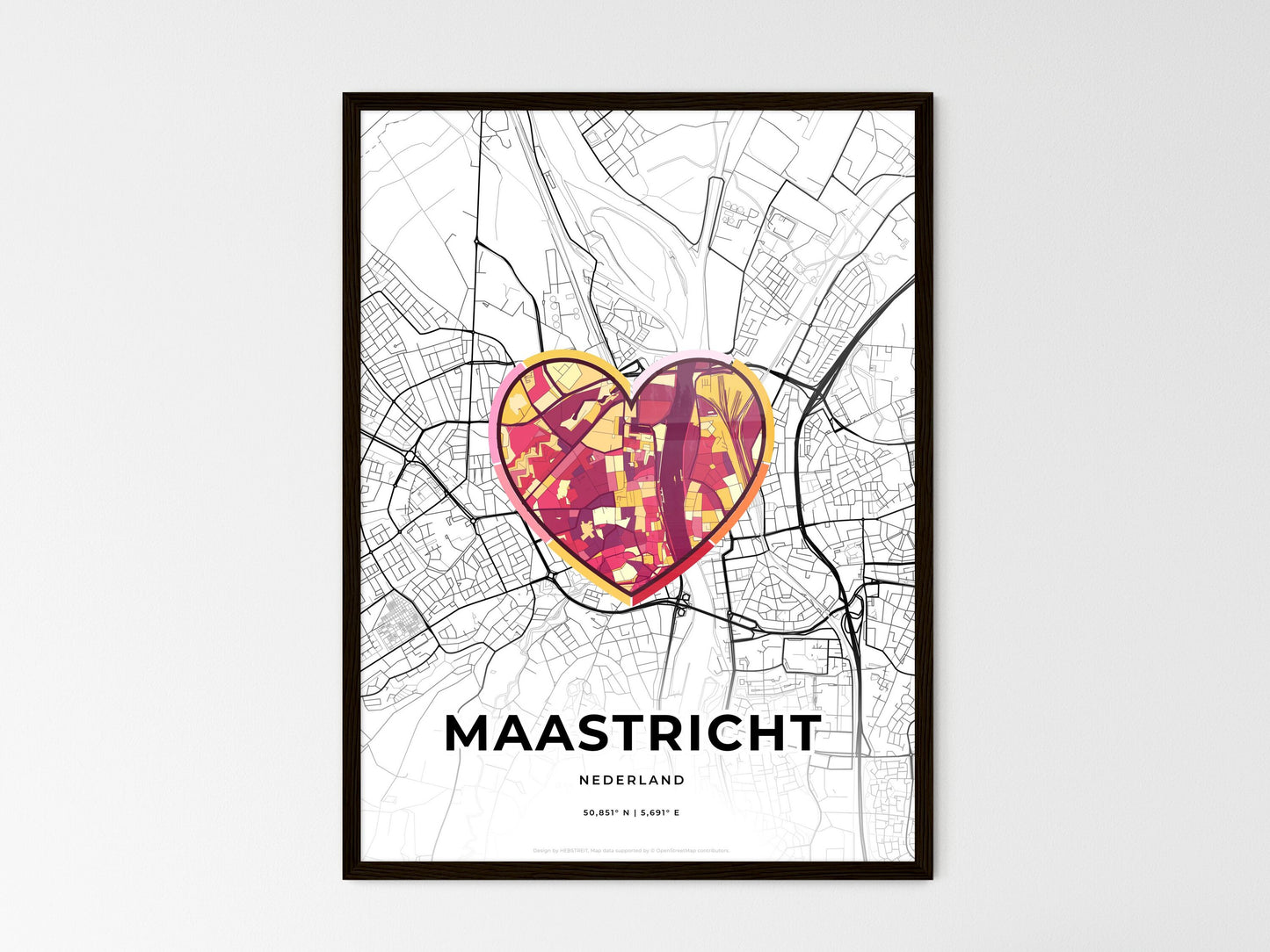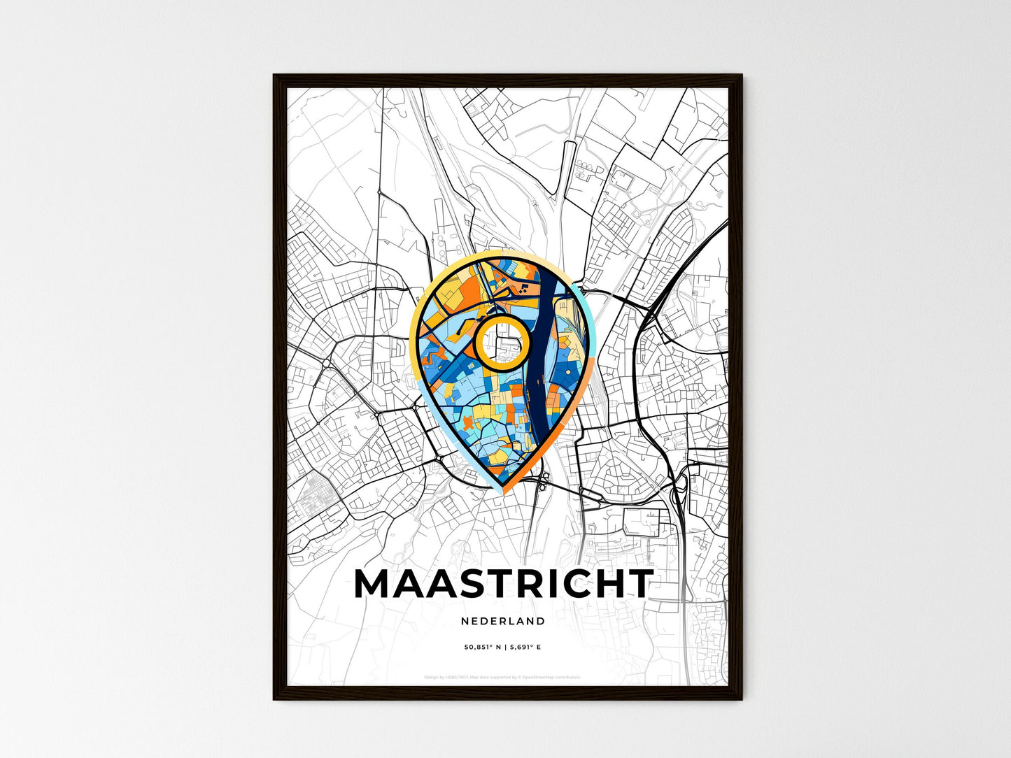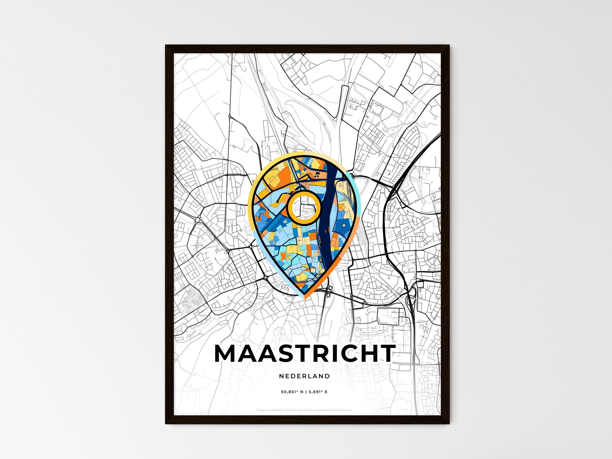 Our map of Maastricht Nederland shows minimalist designed roads, railroads and waterways combined with colorful urban areas within one icon.