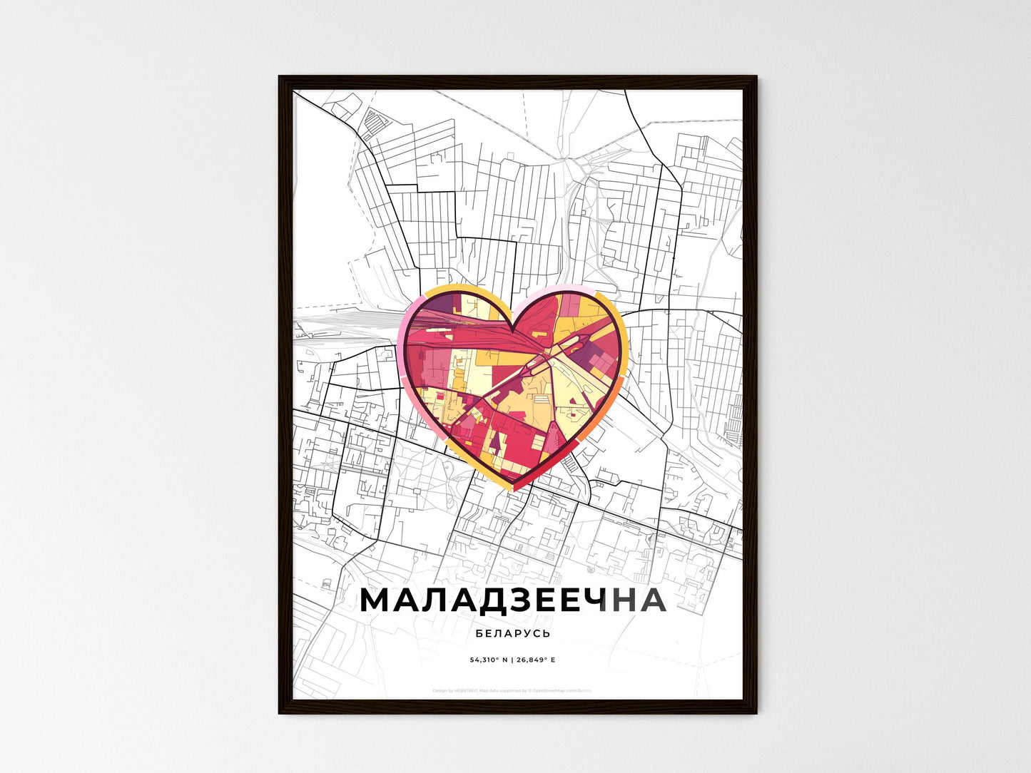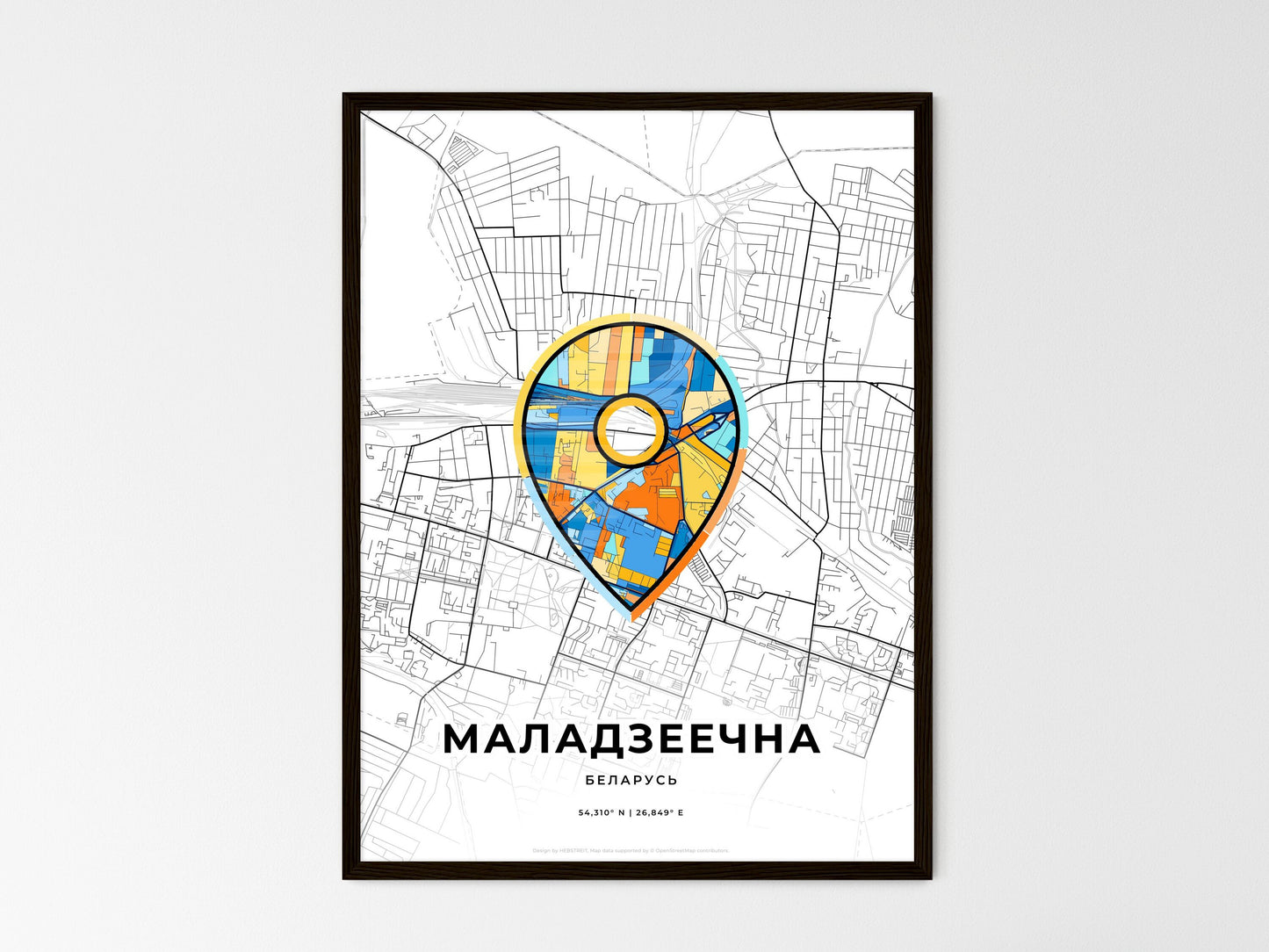 Immerse yourself in the vibrant history of Maladzyechna, Belarus, captured in this captivating abstract art map. This minimalist masterpiece depicts the city's intricate urban fabric, adorned with a colorful icon that symbolizes its enduring legacy. As you gaze upon this unique print, let it transport you to the heart of Maladzyechna, where history unfolds through its cobblestone streets and architectural landmarks. Whether as a thoughtful gift or a cherished addition to your own abode, this art map invites you to explore the captivating essence of this Belarusian gem.