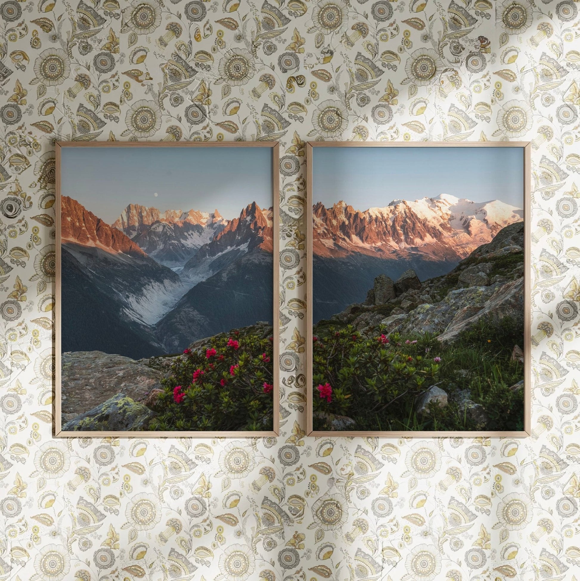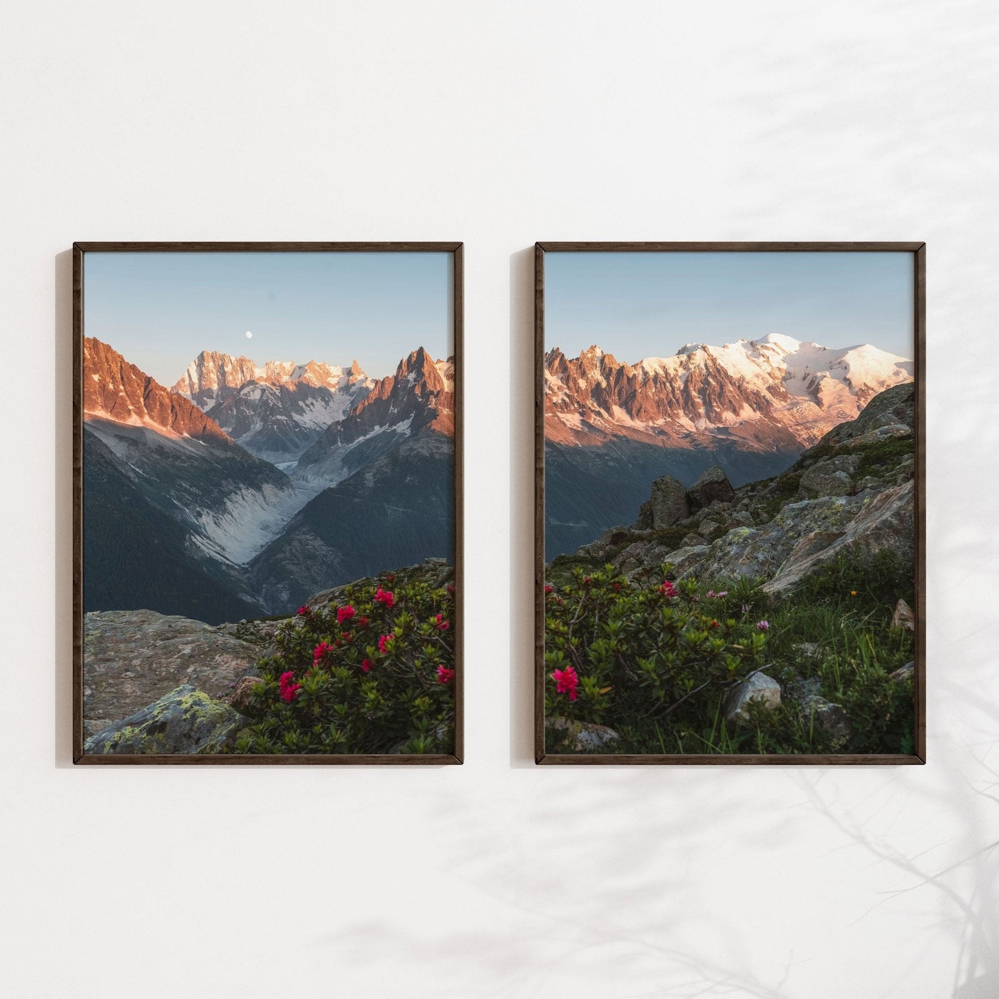 Transform your space with this stunning set of prints featuring vibrant wildflowers and the majestic Mont Blanc massif. Perfect for adding a touch of alpine charm and natural beauty to any home or office decor. Shop now for premium-quality wall art inspired by breathtaking alpine views.
