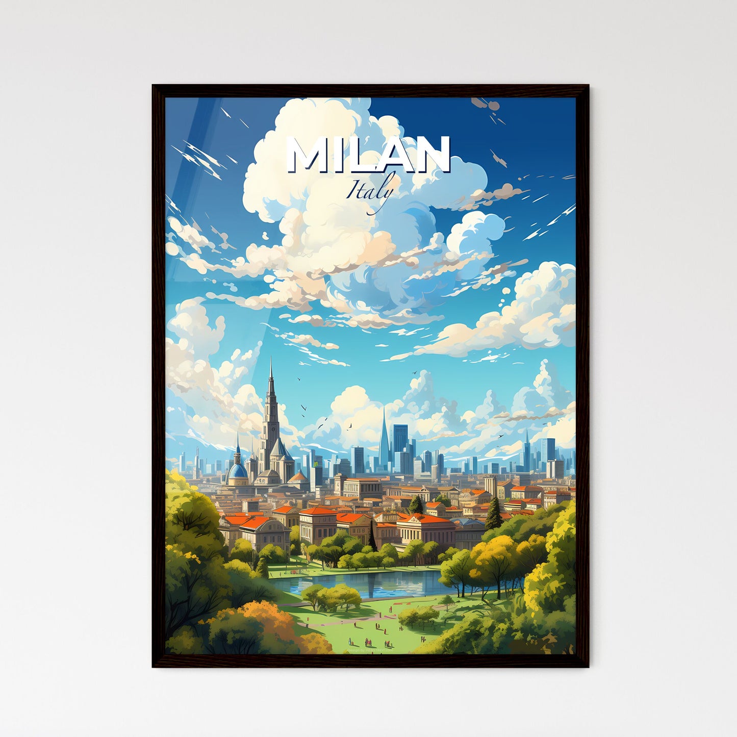 Whether you're a fan of fine art or simply seeking a striking piece of decor to elevate your space, our A Poster of Milan Italy Skyline - A City With Trees And A Lake ART Print is an exceptional choice. It makes a delightful gift for friends and loved ones or a charming indulgence for yourself.