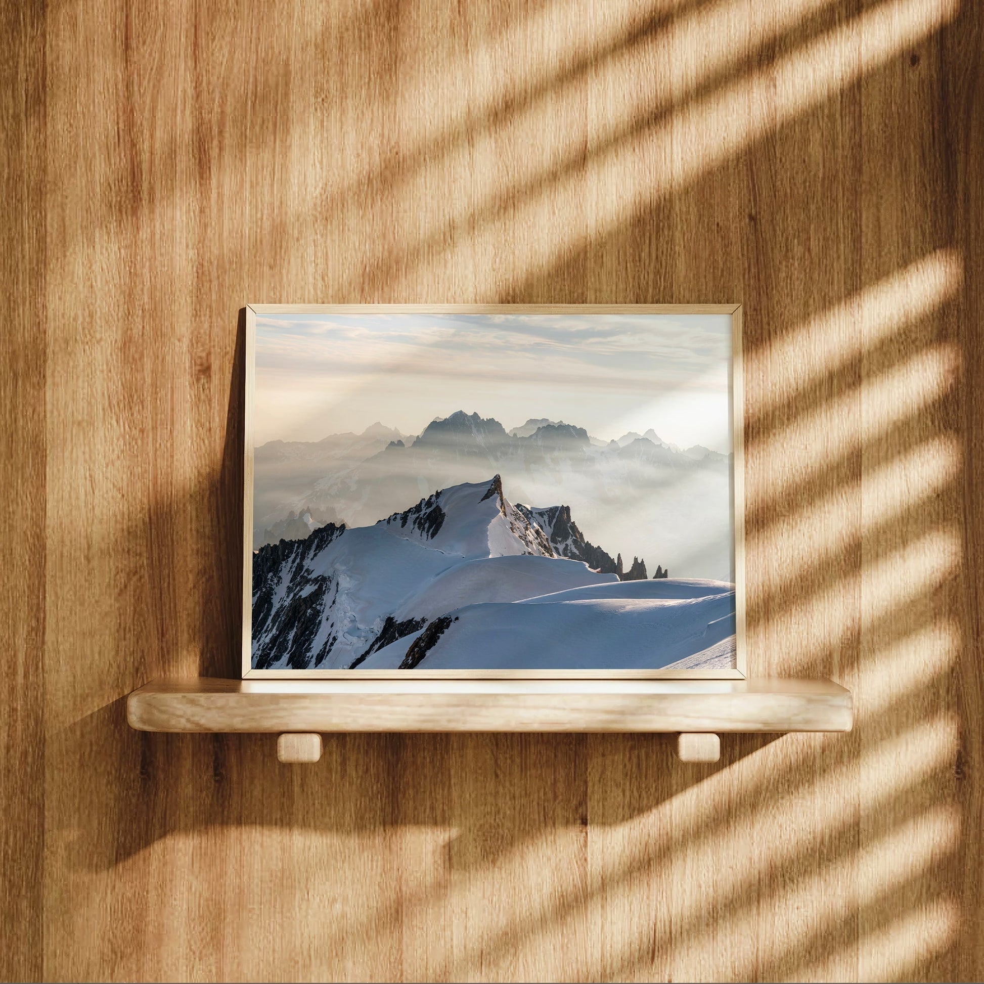 Capture the breathtaking beauty of Mont Maudit as seen from the summit of Mont Blanc with this elegant wall art print. Perfect for adding a touch of Chamonix's alpine serenity to your home, this artwork complements minimalist and modern interiors.