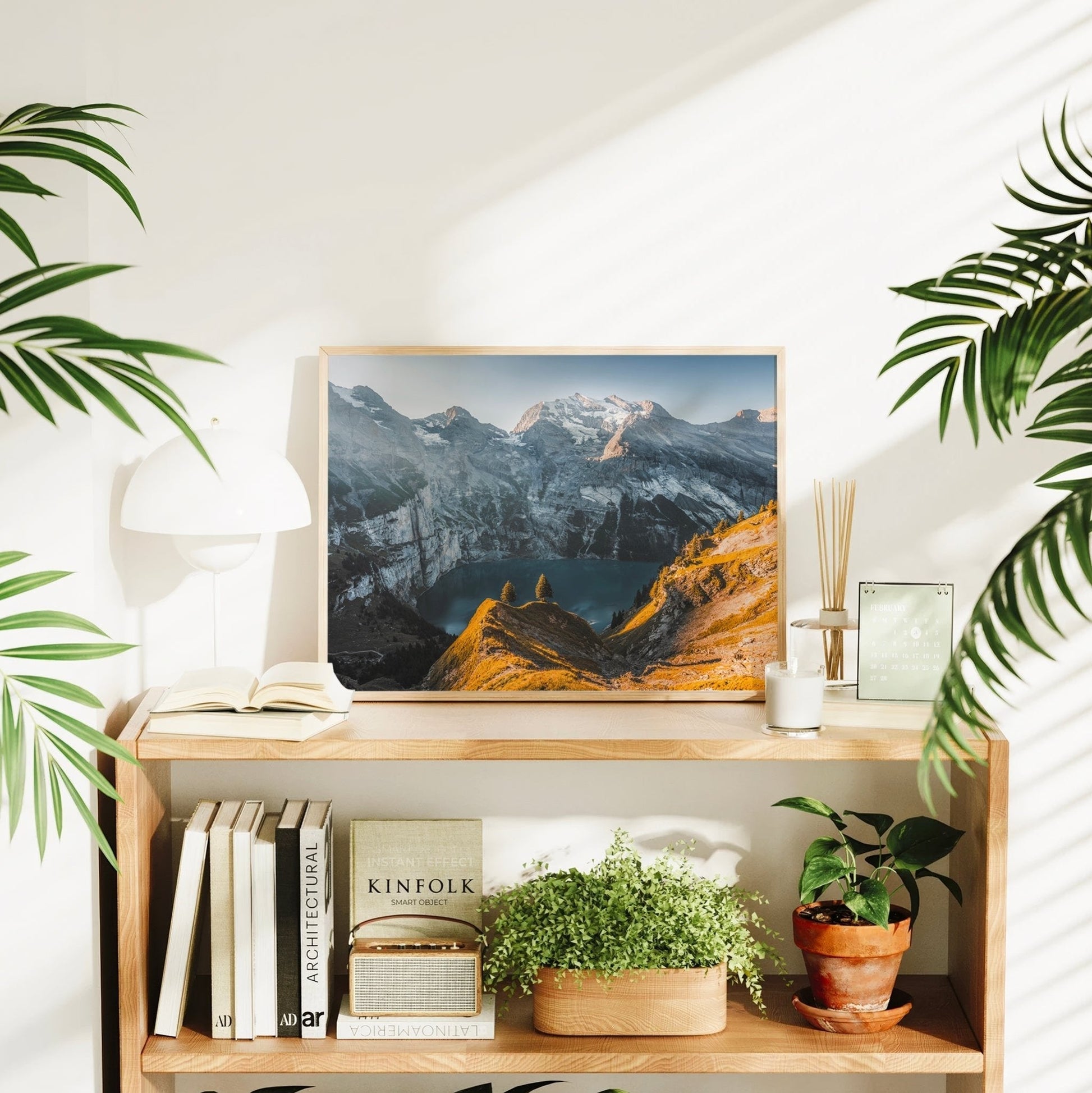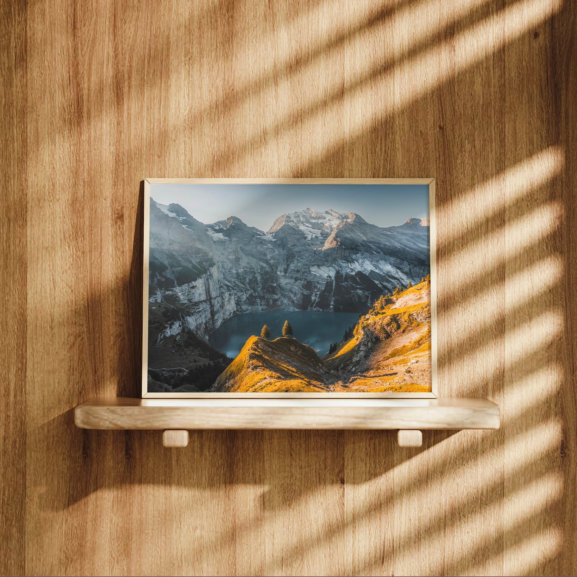 Bask in the golden morning light over Oeschinensee, where rugged peaks meet crystal-clear alpine waters—a serene escape for your walls.